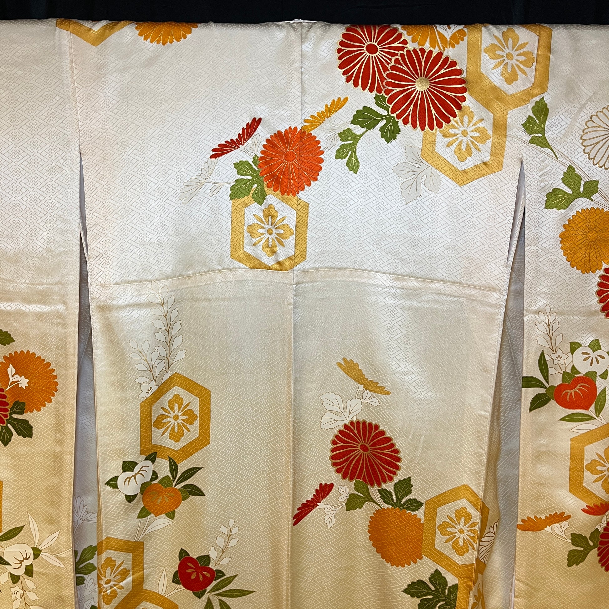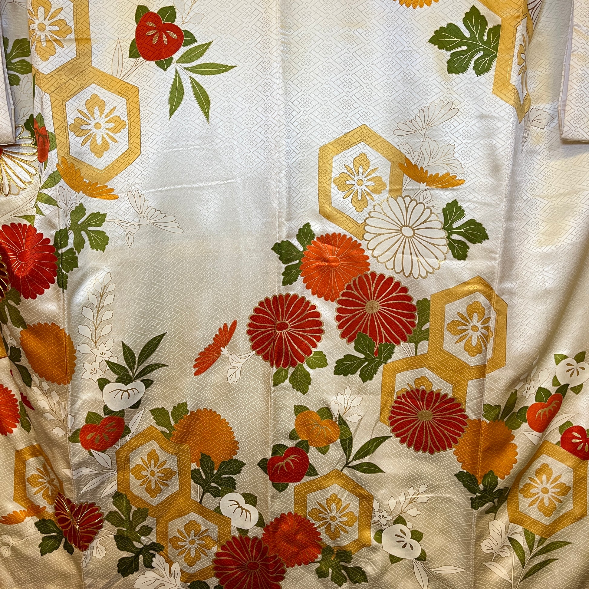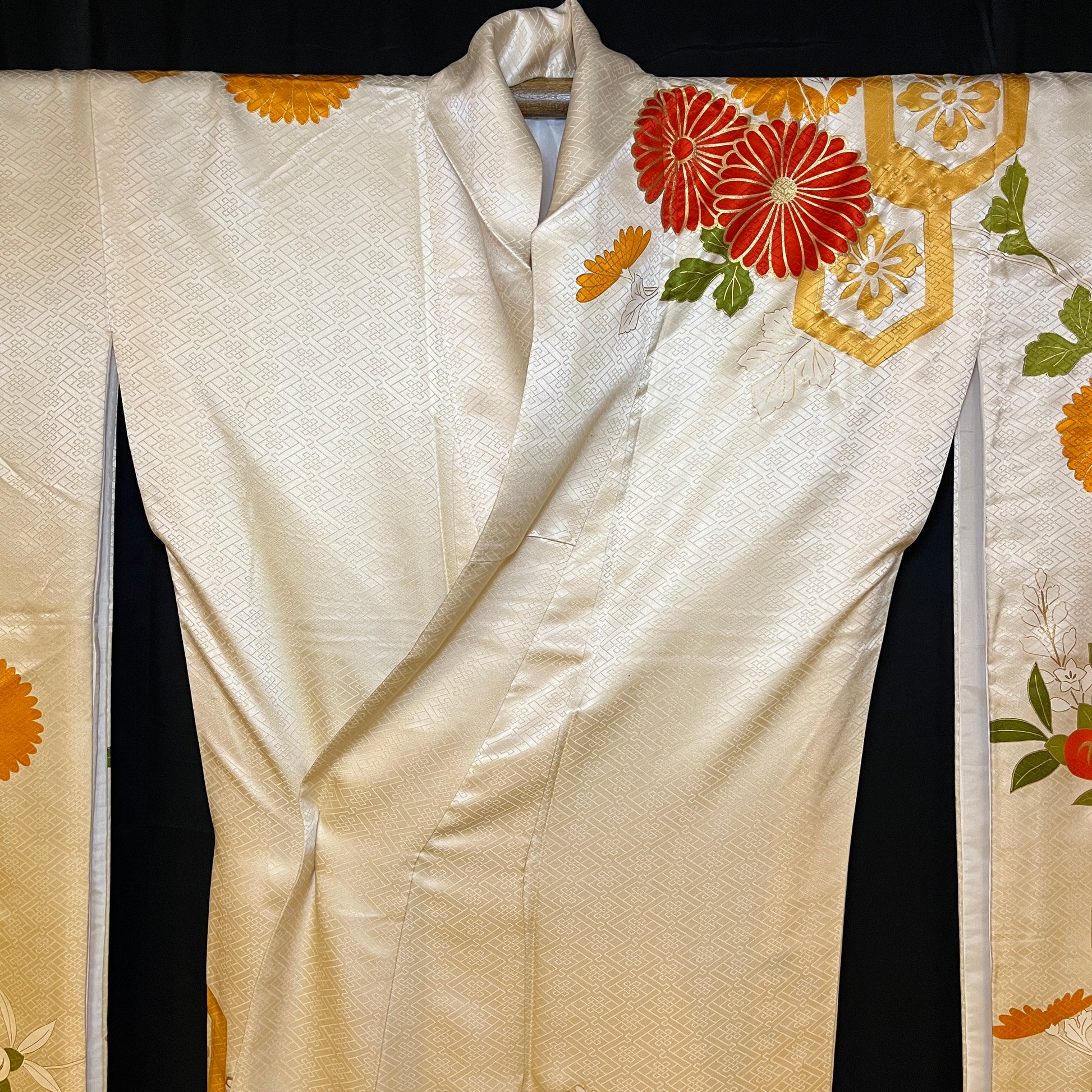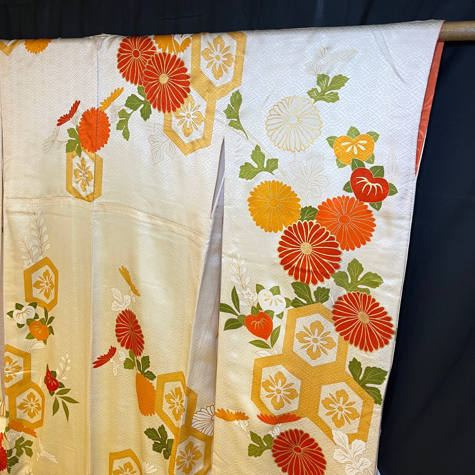 This kimono features a creamy silk with an abundance of autumn-palette chrysanthemums and tachibana (citrus fruit) blossoms. Beautiful shades of orange, yellow, and green with highlights of gold in the gold leaf and couched embroidery. Look closely to see the unique knot-like geometric jacquard design. See videos below on all the techniques.