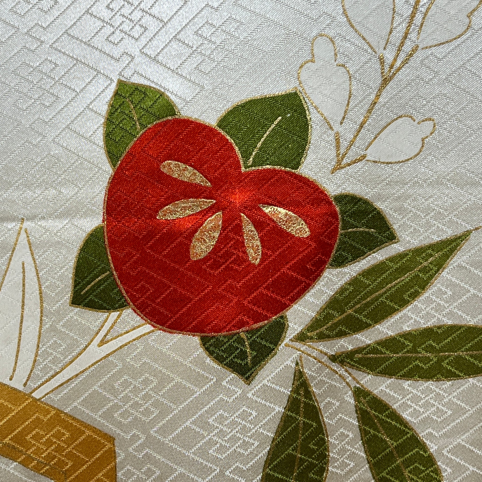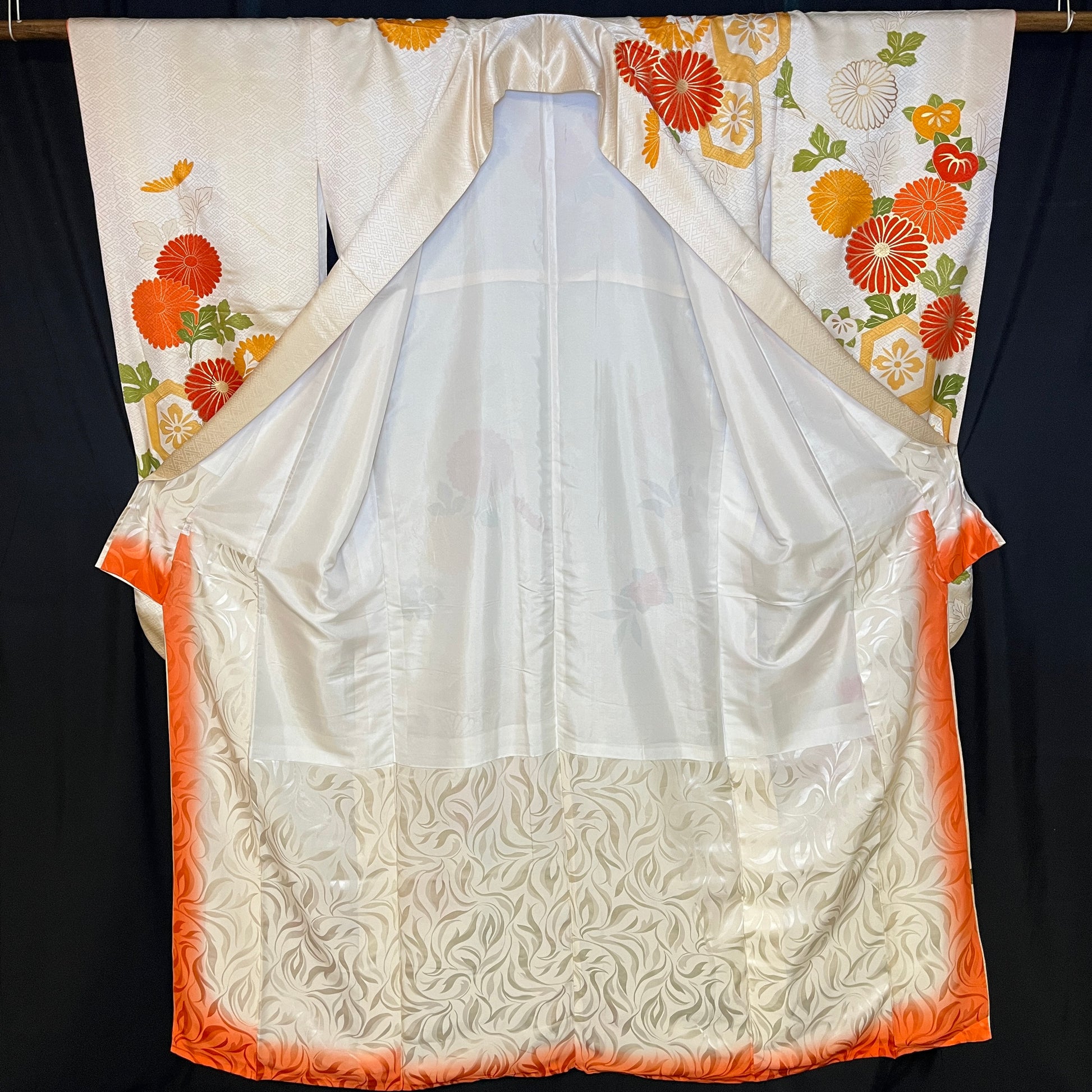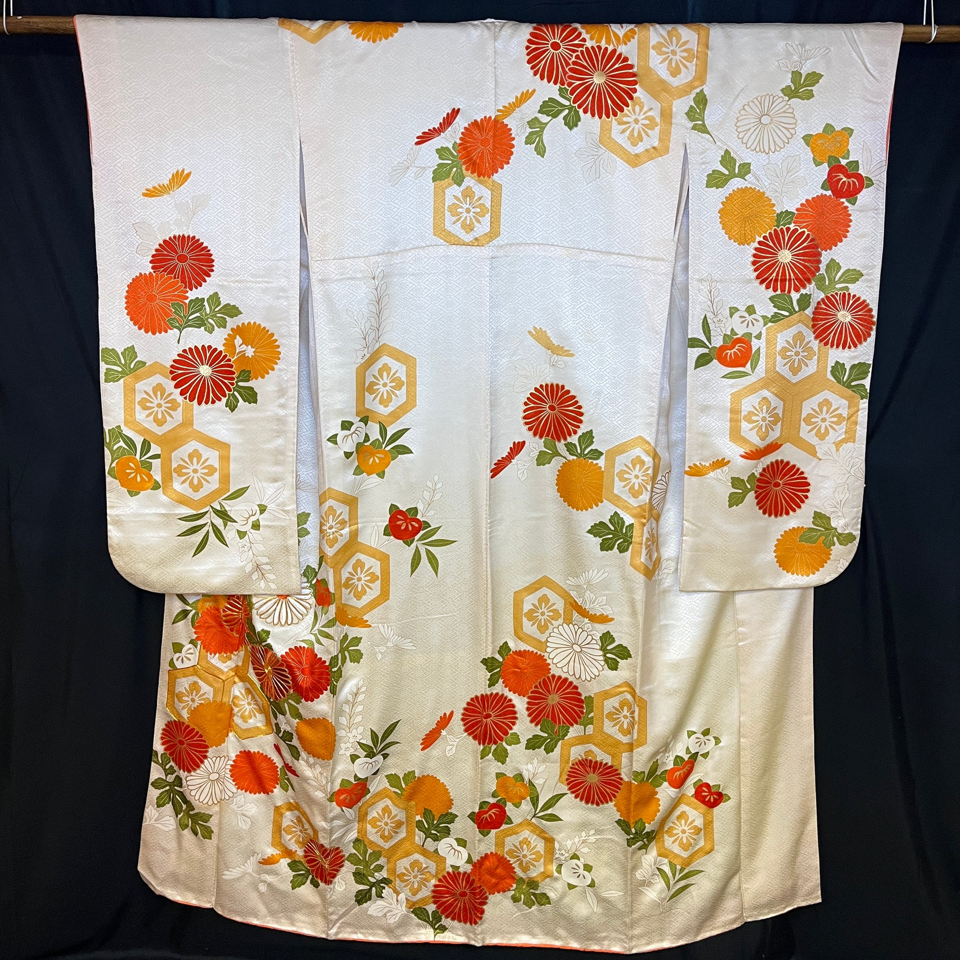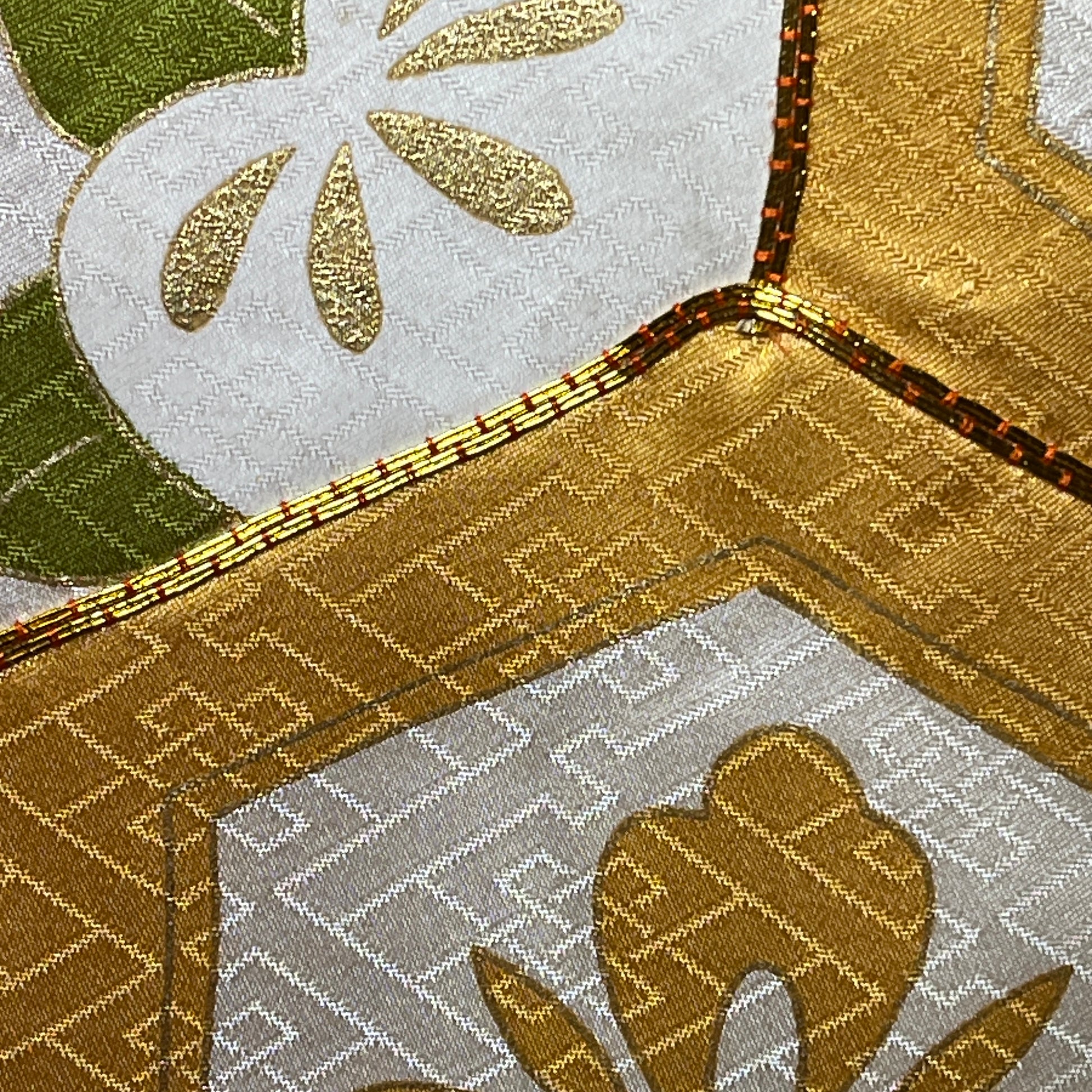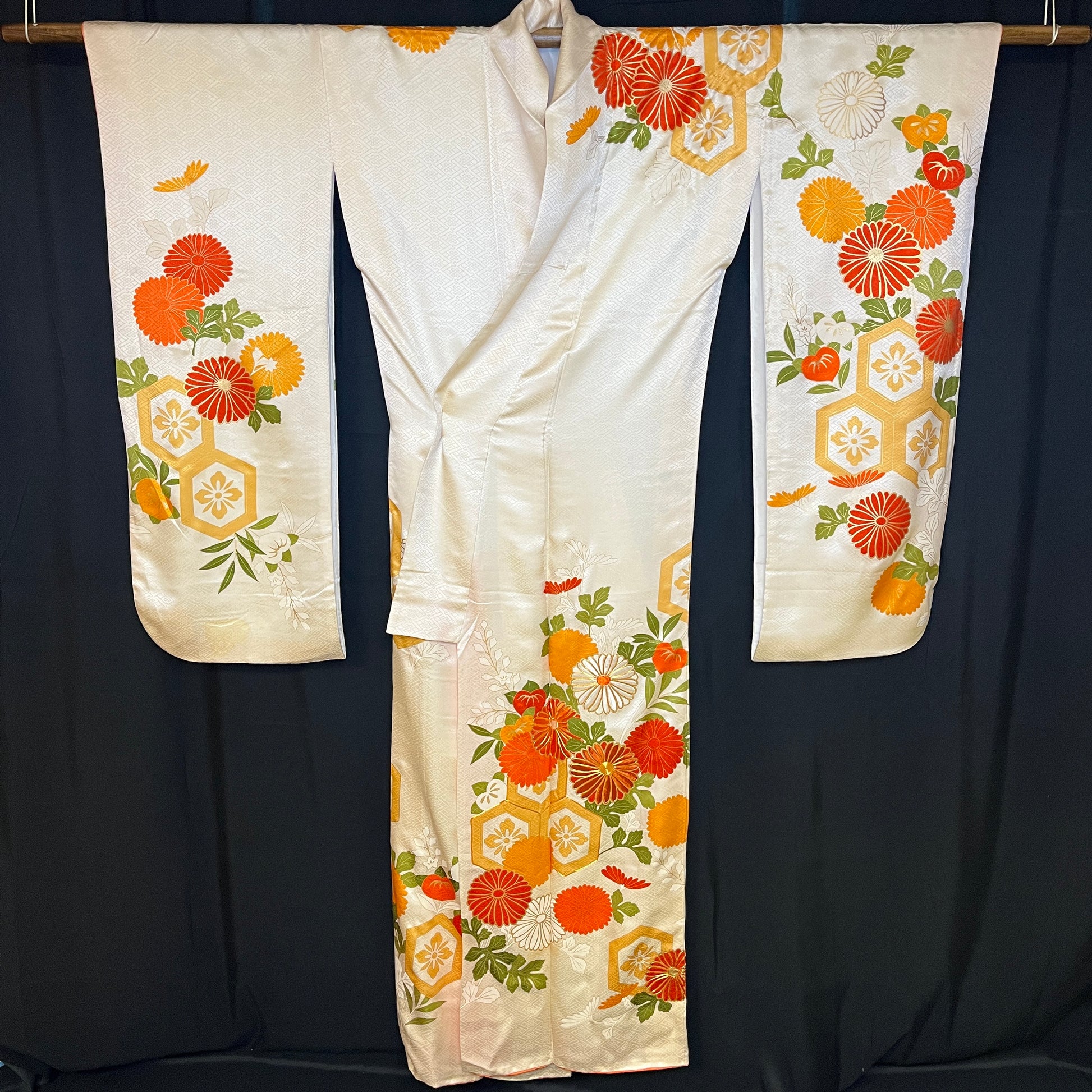 This kimono features a creamy silk with an abundance of autumn-palette chrysanthemums and tachibana (citrus fruit) blossoms. Beautiful shades of orange, yellow, and green with highlights of gold in the gold leaf and couched embroidery. Look closely to see the unique knot-like geometric jacquard design. See videos below on all the techniques.
