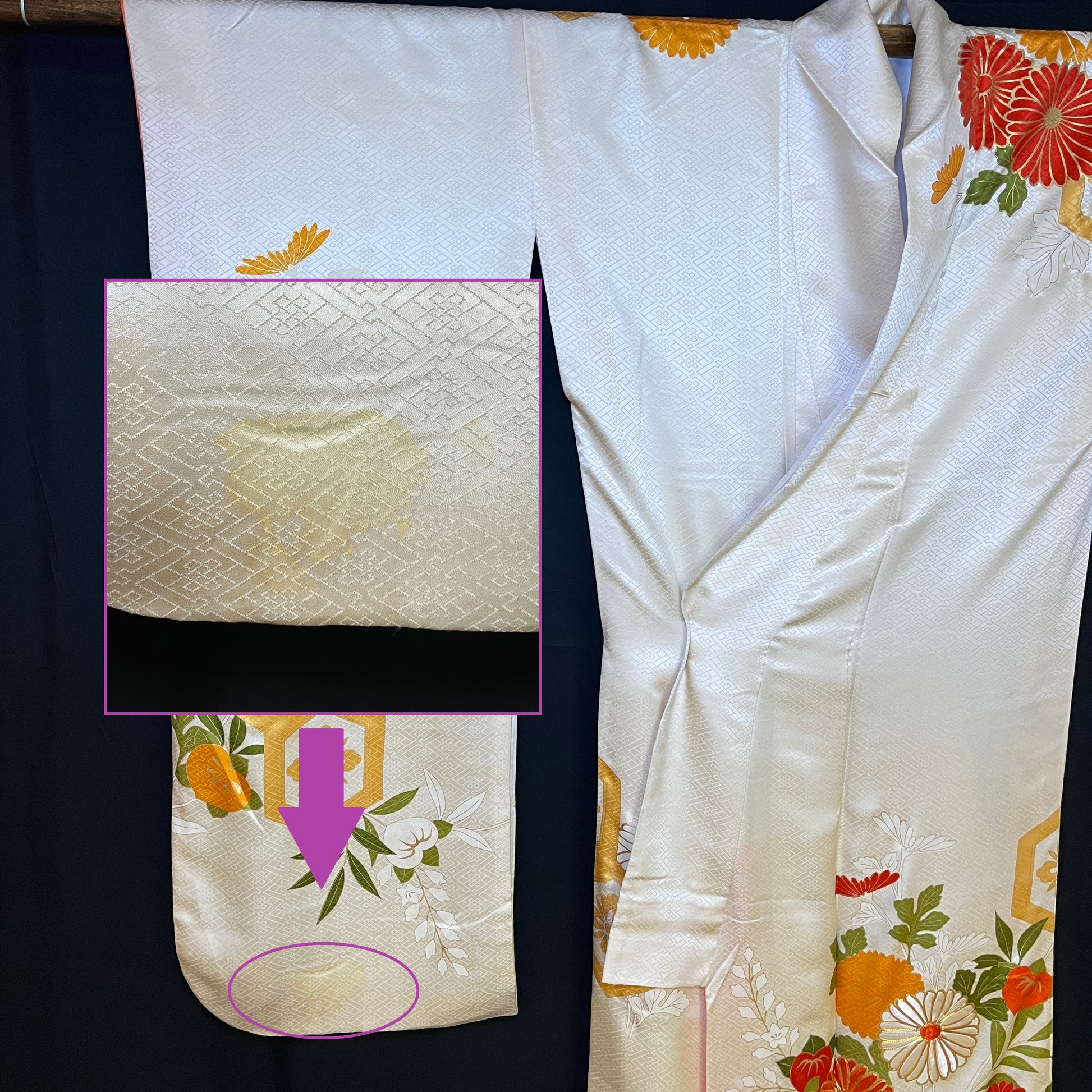 Unfortunately, as with many light-colored kimono, there is a light blemish on the front sleeve bottom, but it is not distracting and would not show if displayed from the back. See last photo.