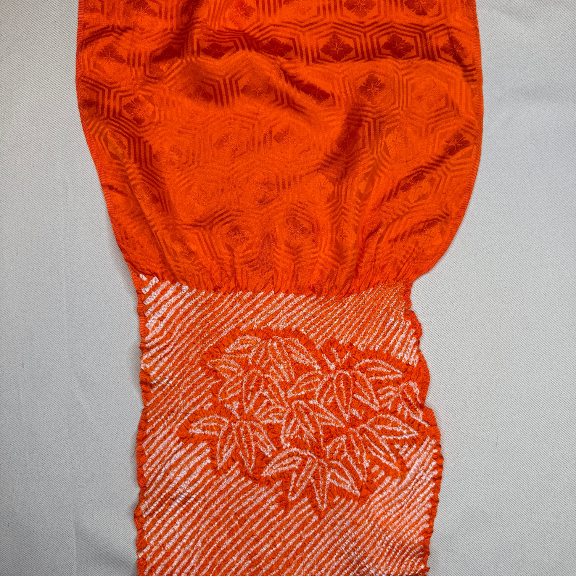 Bright as a festival lantern at dusk, this obiage and obijime set radiates warmth and celebration. The obiage glows in vibrant orange and crisp white, featuring puckered shibori bamboo motifs layered over a subtle hexagon floral jacquard background, adding texture and quiet depth beneath the bold color. The dimensional dye work creates movement across the silk, while the flat orange obijime, accented with white sections and finished with soft white tassels, ties the look together with crisp definition.