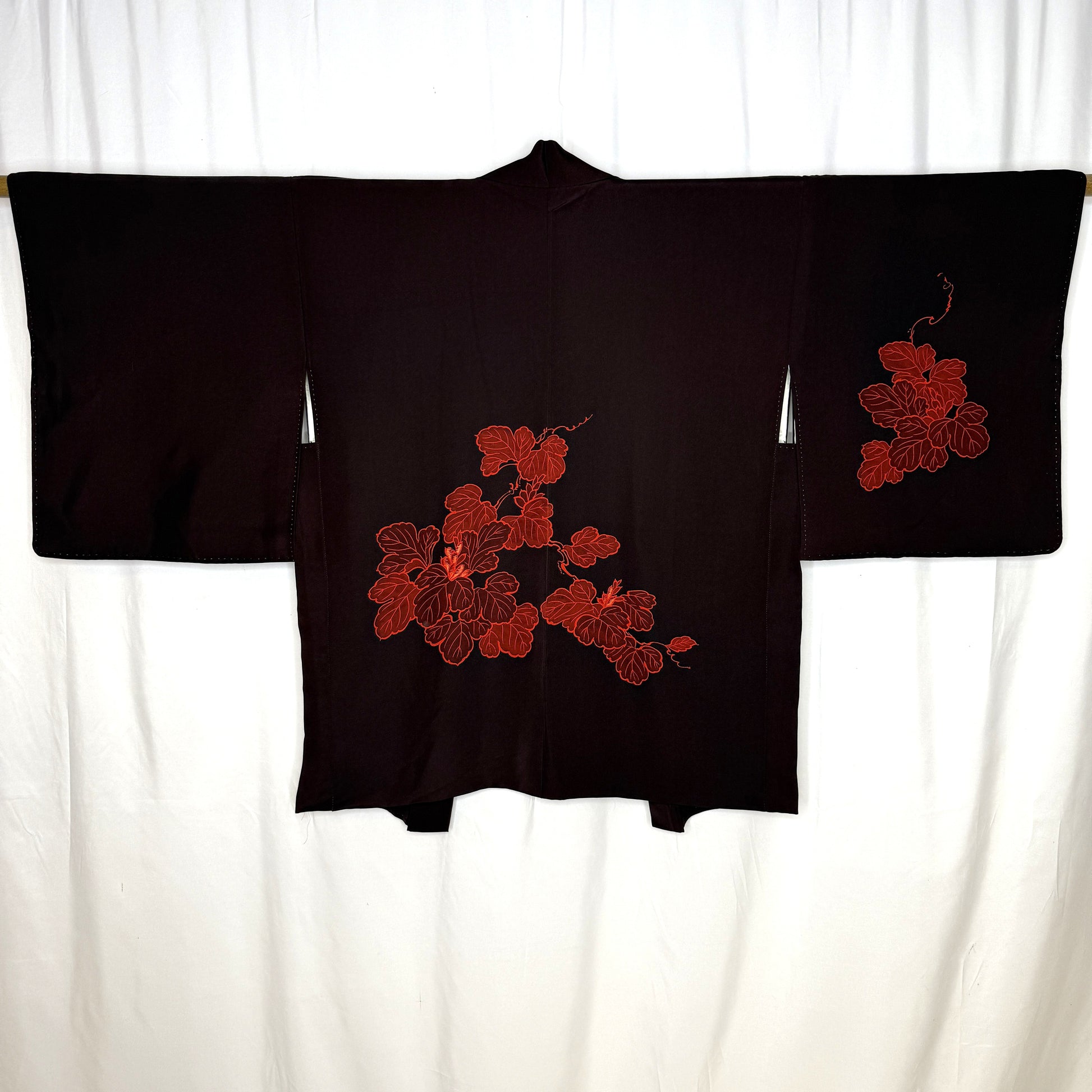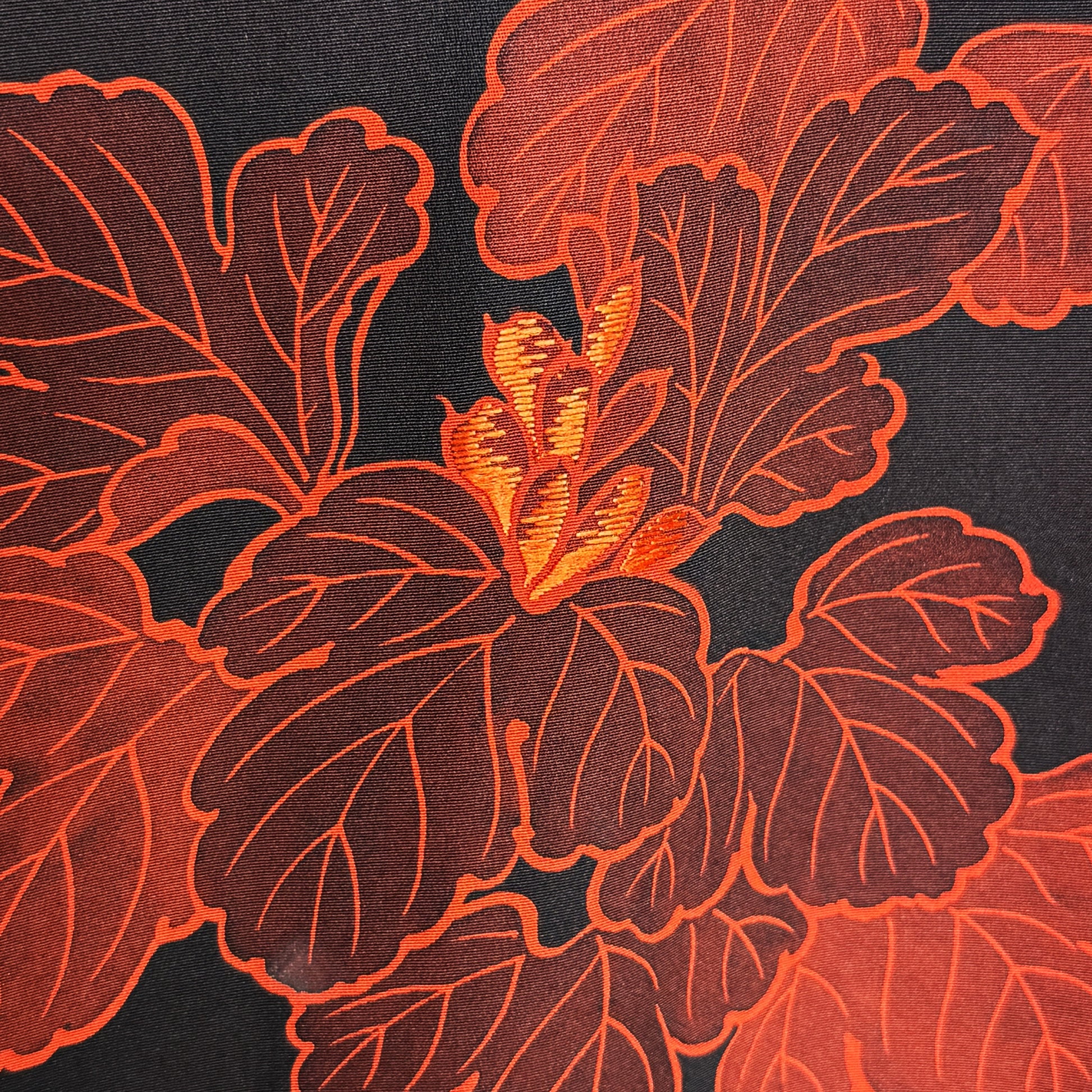 This vintage jacket is sure to attract admirers with its bright design with many shades of orange that contrast beautifully with the deep brown background. The yuzen-created leaves seem to reach like vines across the back, front, and sleeves. The leaves are artfully shaded and outlined - some with satin stitch embroidery - which adds depth and texture to create a striking contrast against the dark, smooth silk.