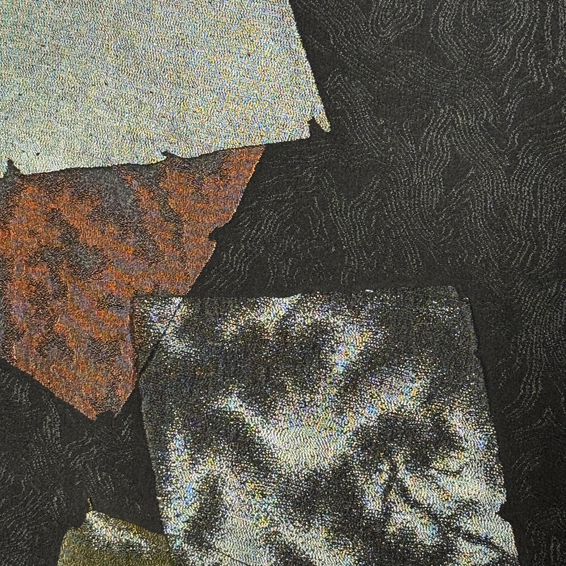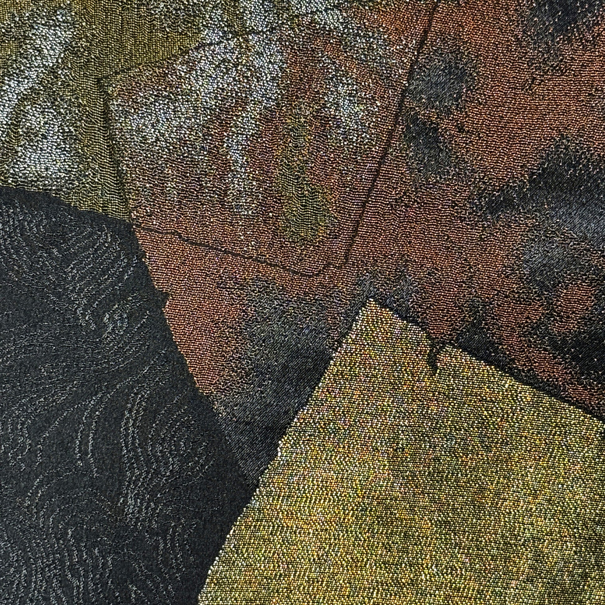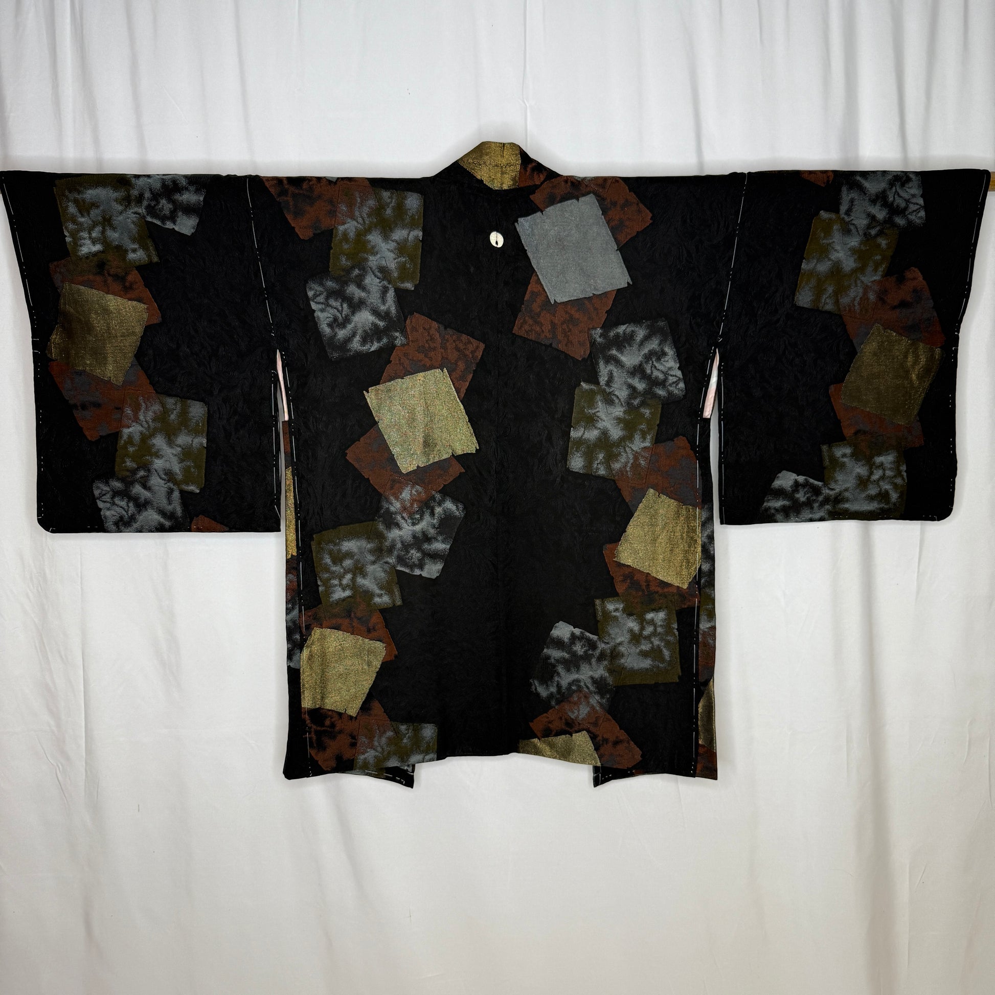 Step into an artful mix of texture and shadow with this dramatic haori jacket. Lacquered (urushi) and metallic threads create layered squares suggesting tattered paper or fabric scraps in bronze, red, pewter, gold, and silver. Each one catches movement like distressed foil. The jacquard background has a subtle swirling pattern that adds more depth, and the single crest on the back gives a more formal, traditional look. Visually bold and wonderfully wearable.