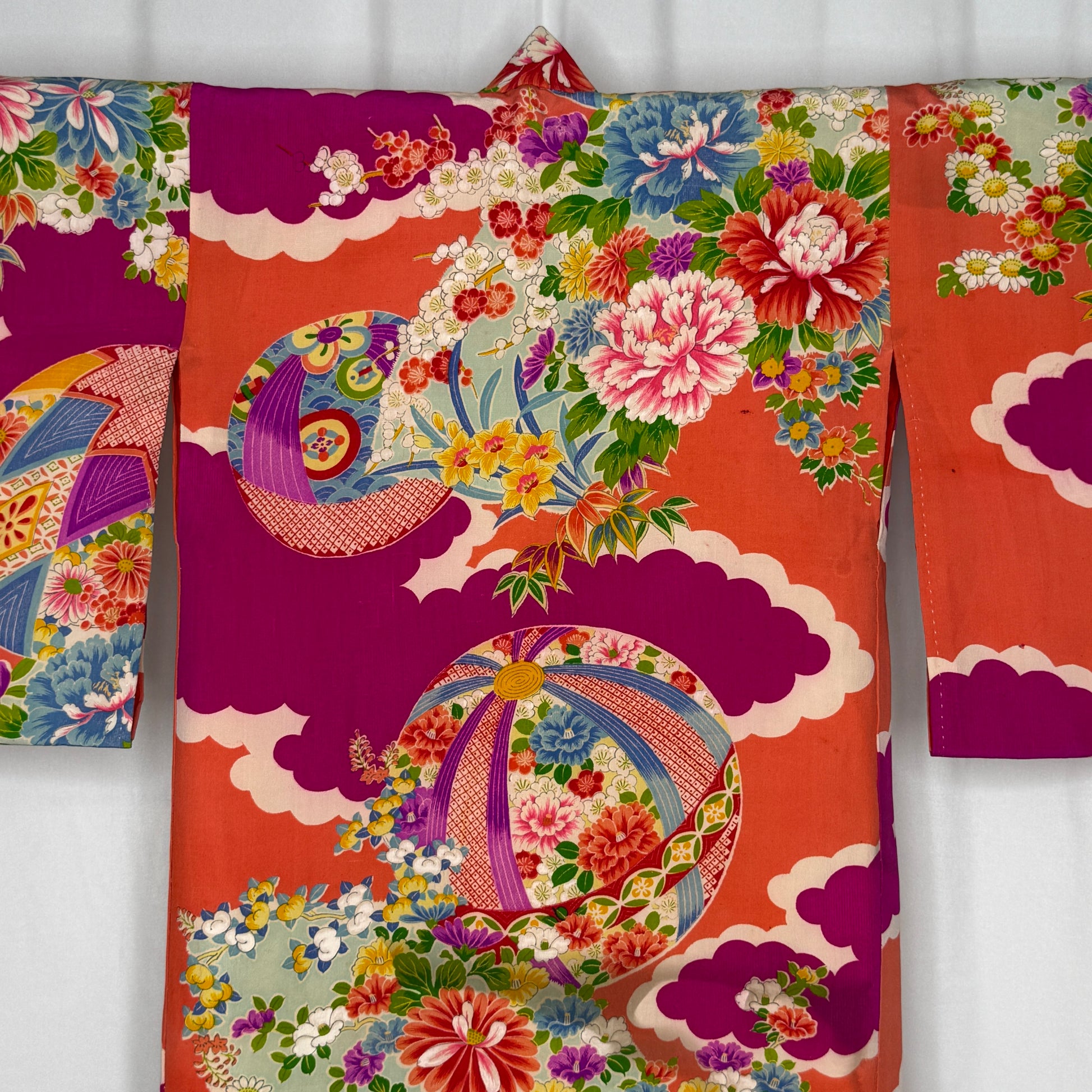 This padded kimono bursts with color and pattern, featuring temari balls drifting among clusters of mums, plum blossoms, and peonies. The deep crimson background sets the backdrop for bold magenta clouds, a motif that suggests shifting skies and the beauty of change. Temari, once handcrafted gifts symbolizing joy and lasting friendship, pair beautifully with the seasonal flowers to embody good fortune and happiness.