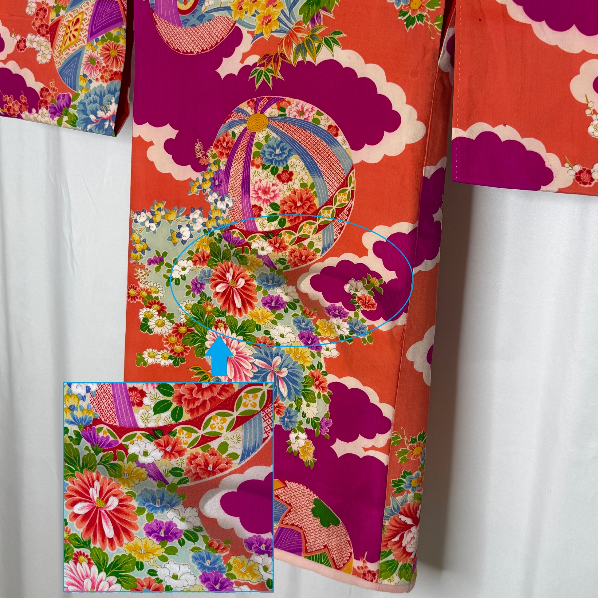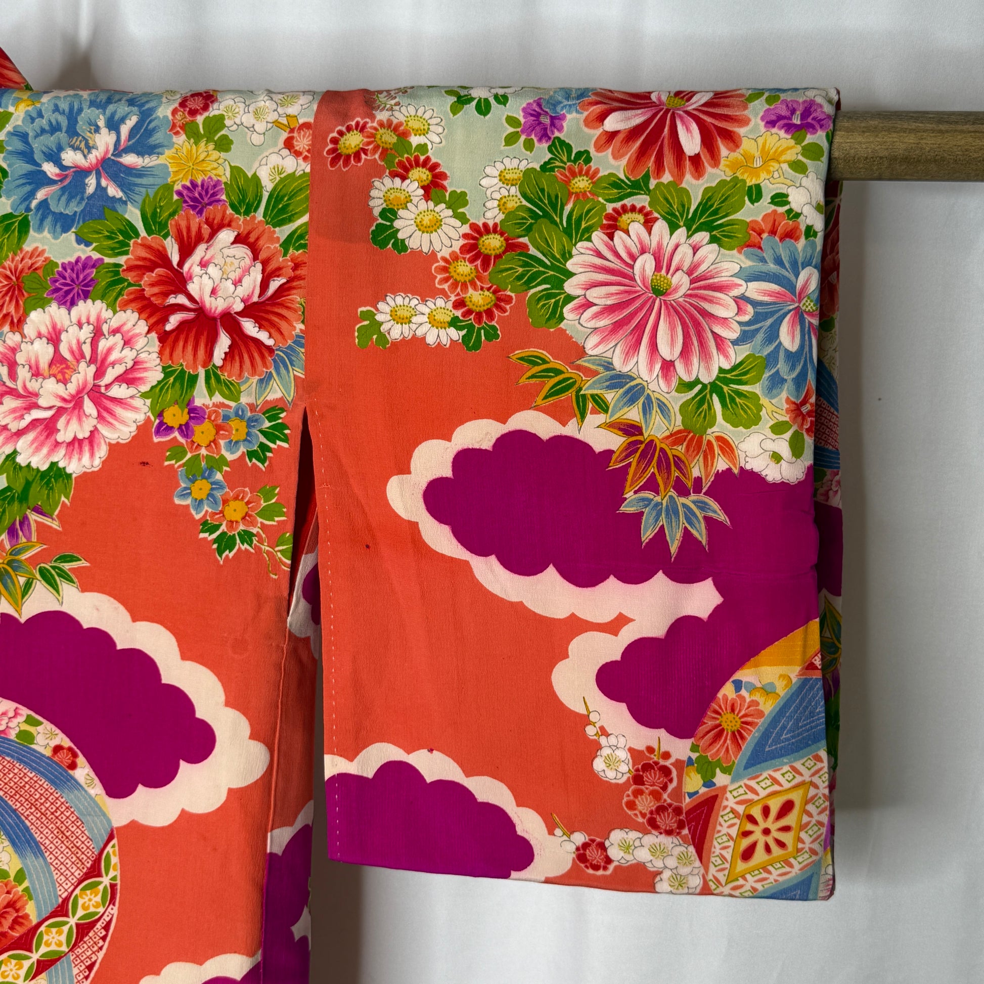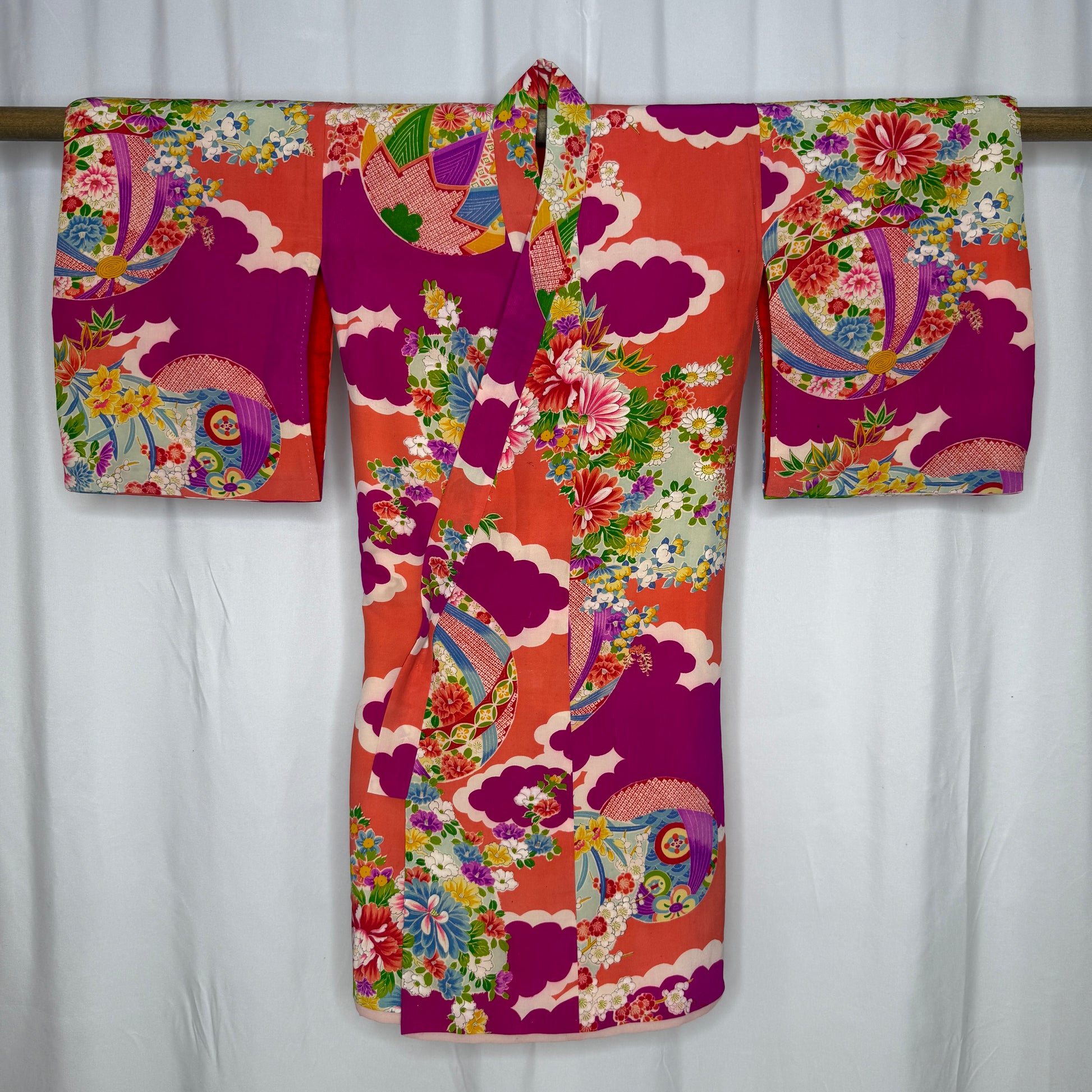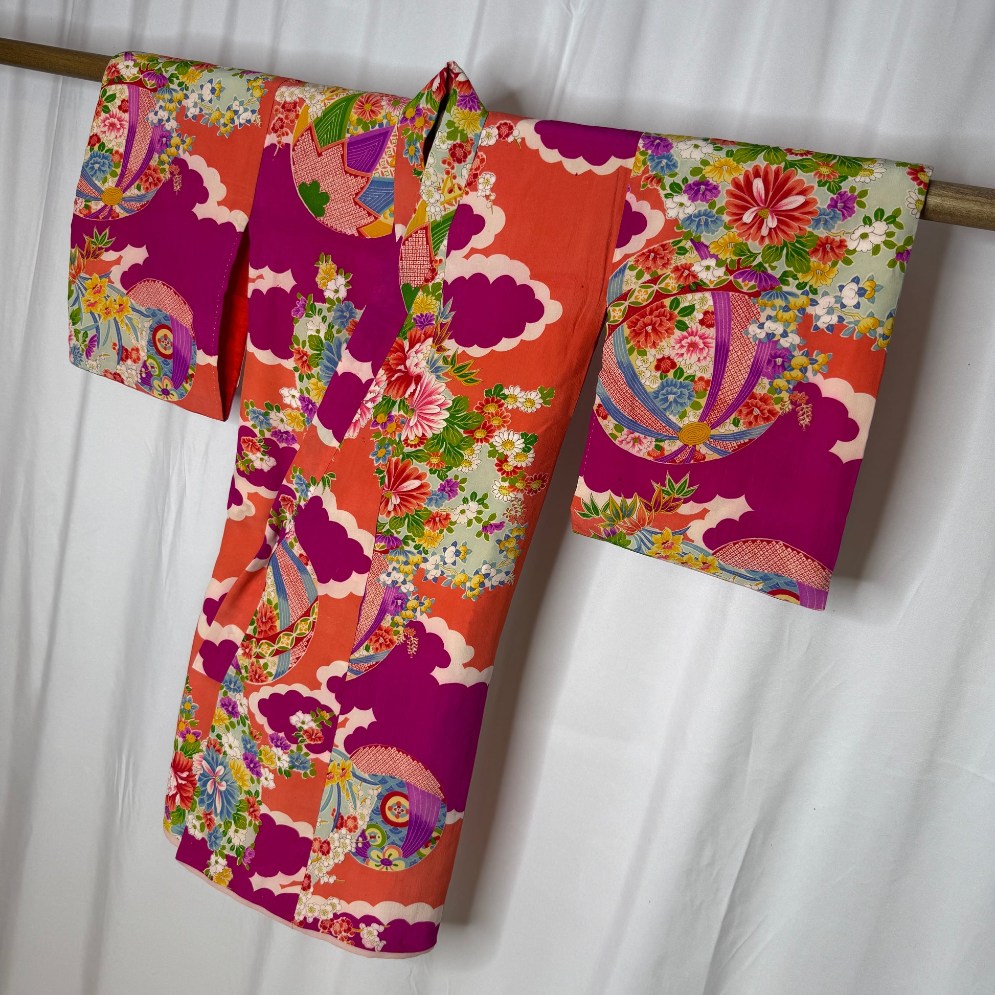 Vintage Japanese children's kimono make eye-catching displays in spaces too small to accommodate a full-sized kimono. We offer display rods (click the tab below) if you're going to display this kimono.