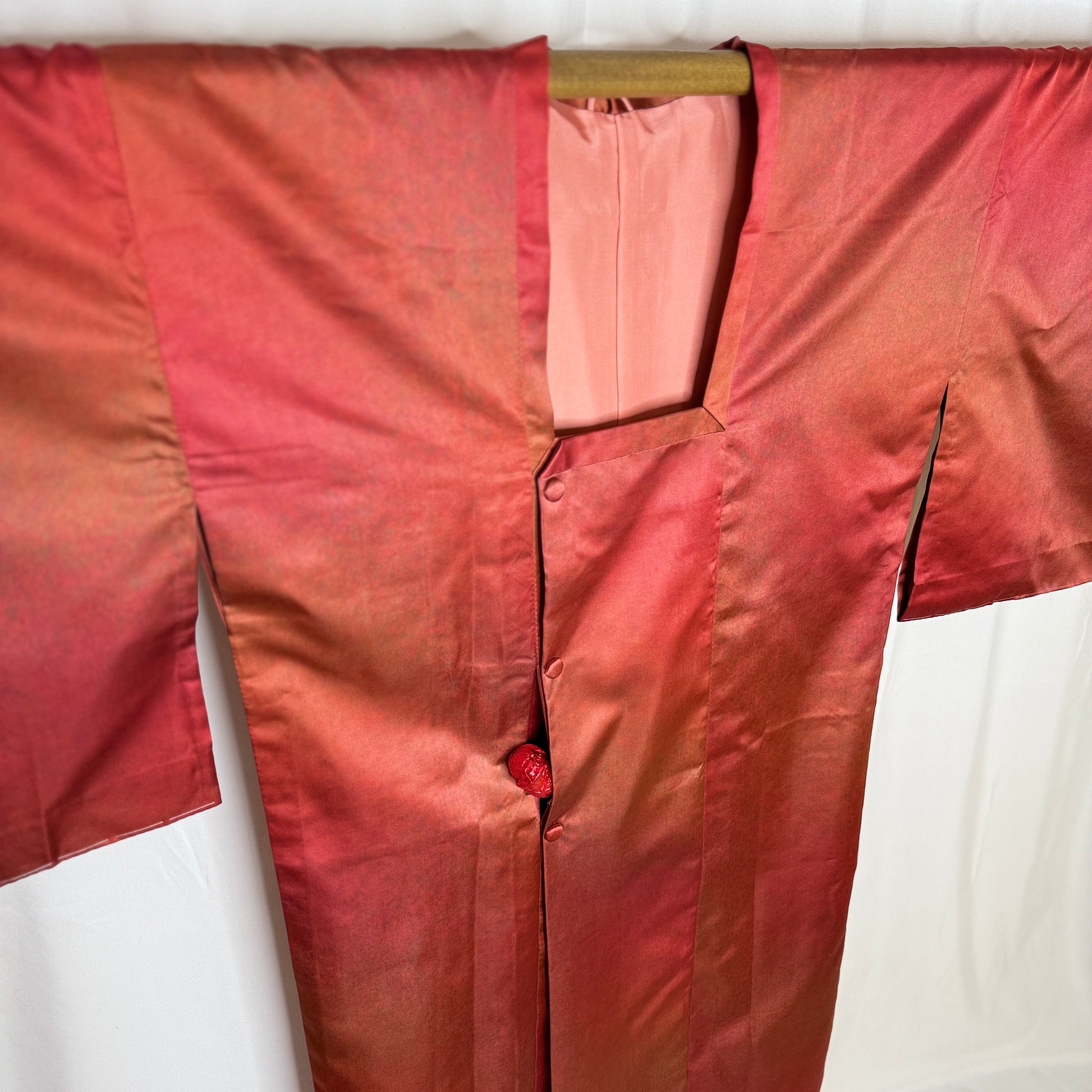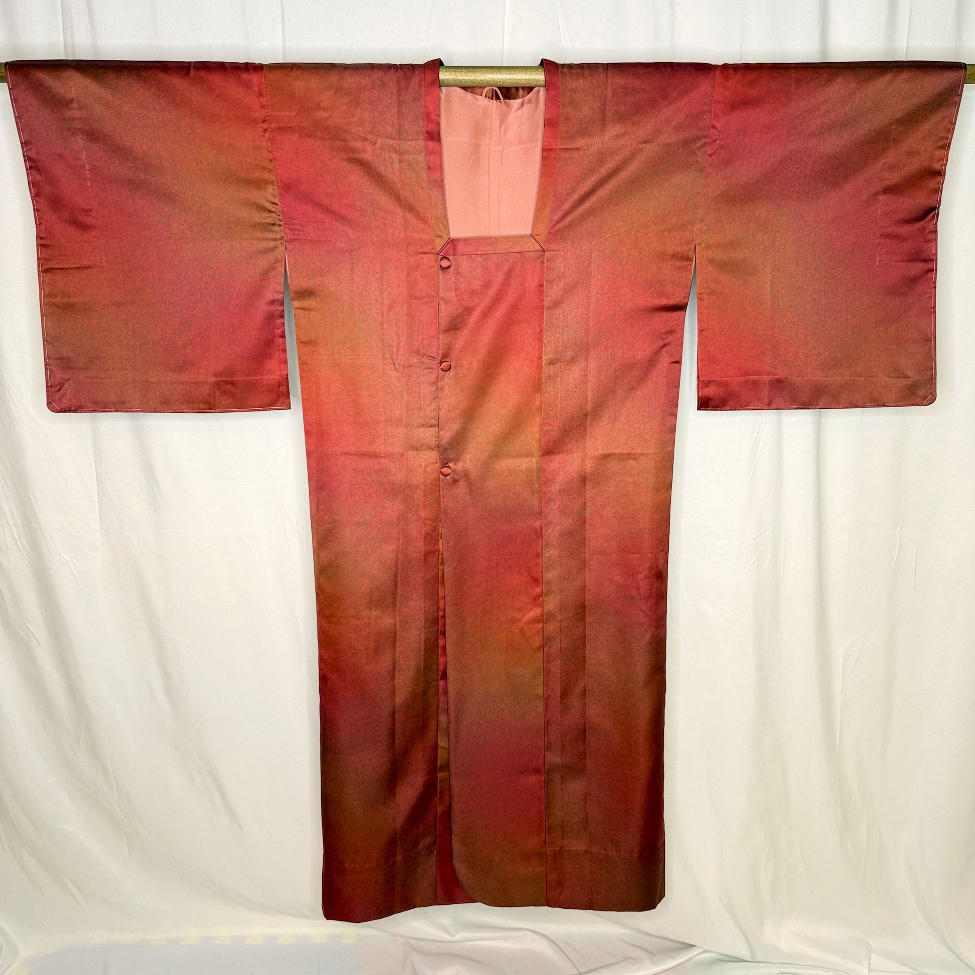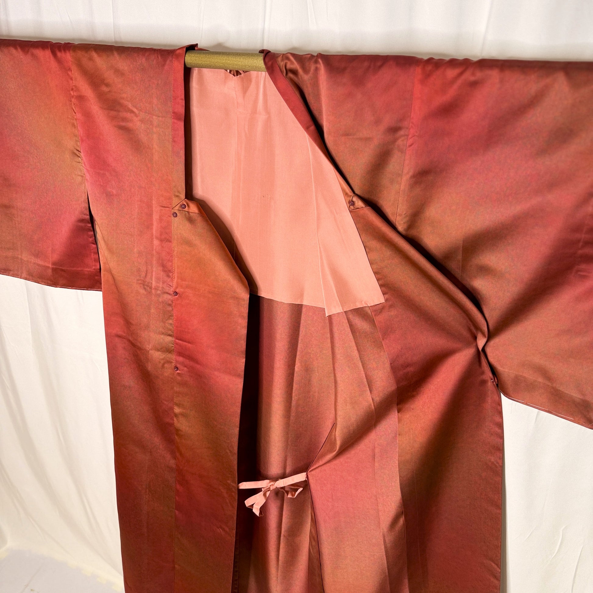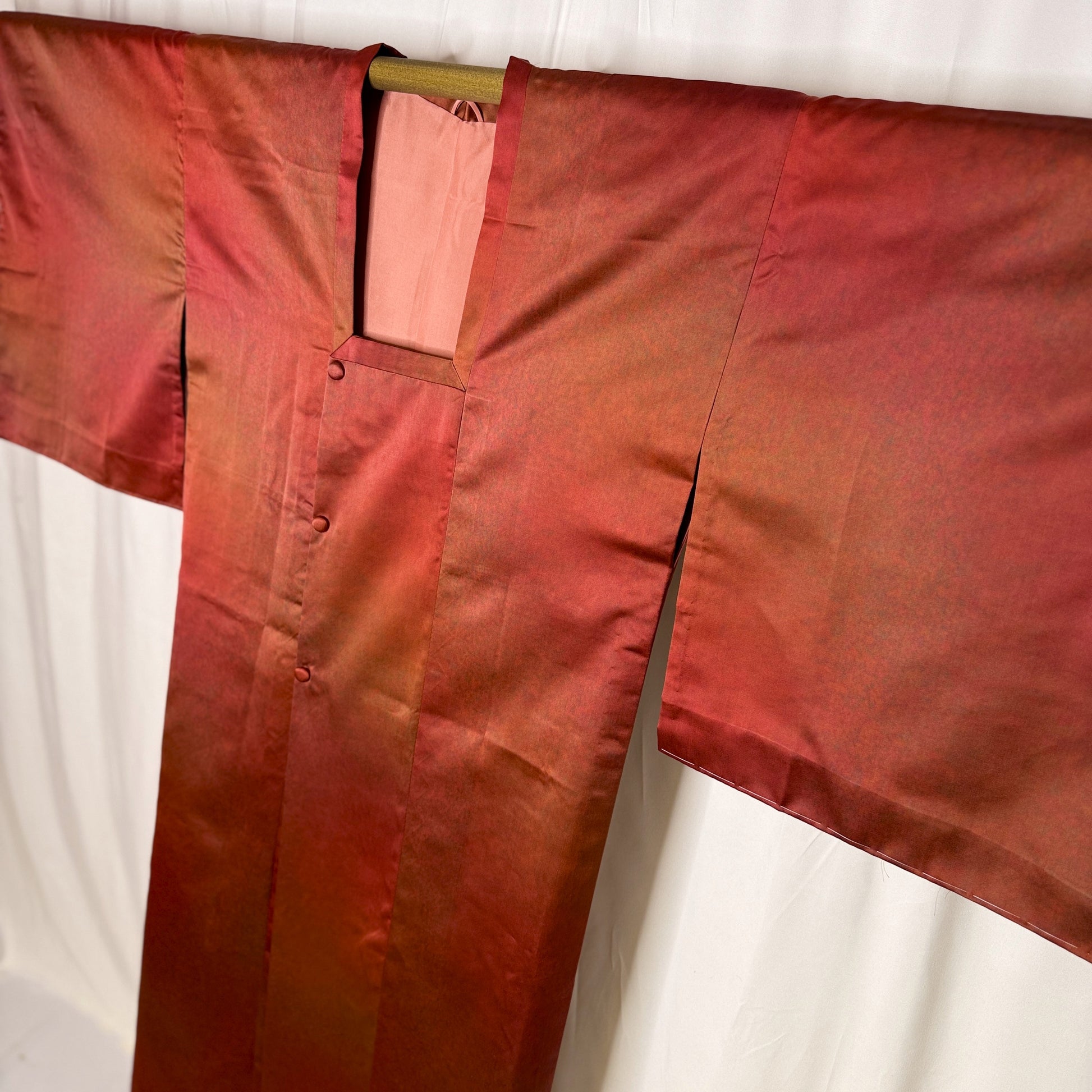 This michiyuki is longer than the usual and of a lighter fabric that was likely meant for warmer weather. The dye work on this jacket is really lovely - subtle, soft tones with a terracotta base but hues of copper, olive, and orange with a misty sheen.