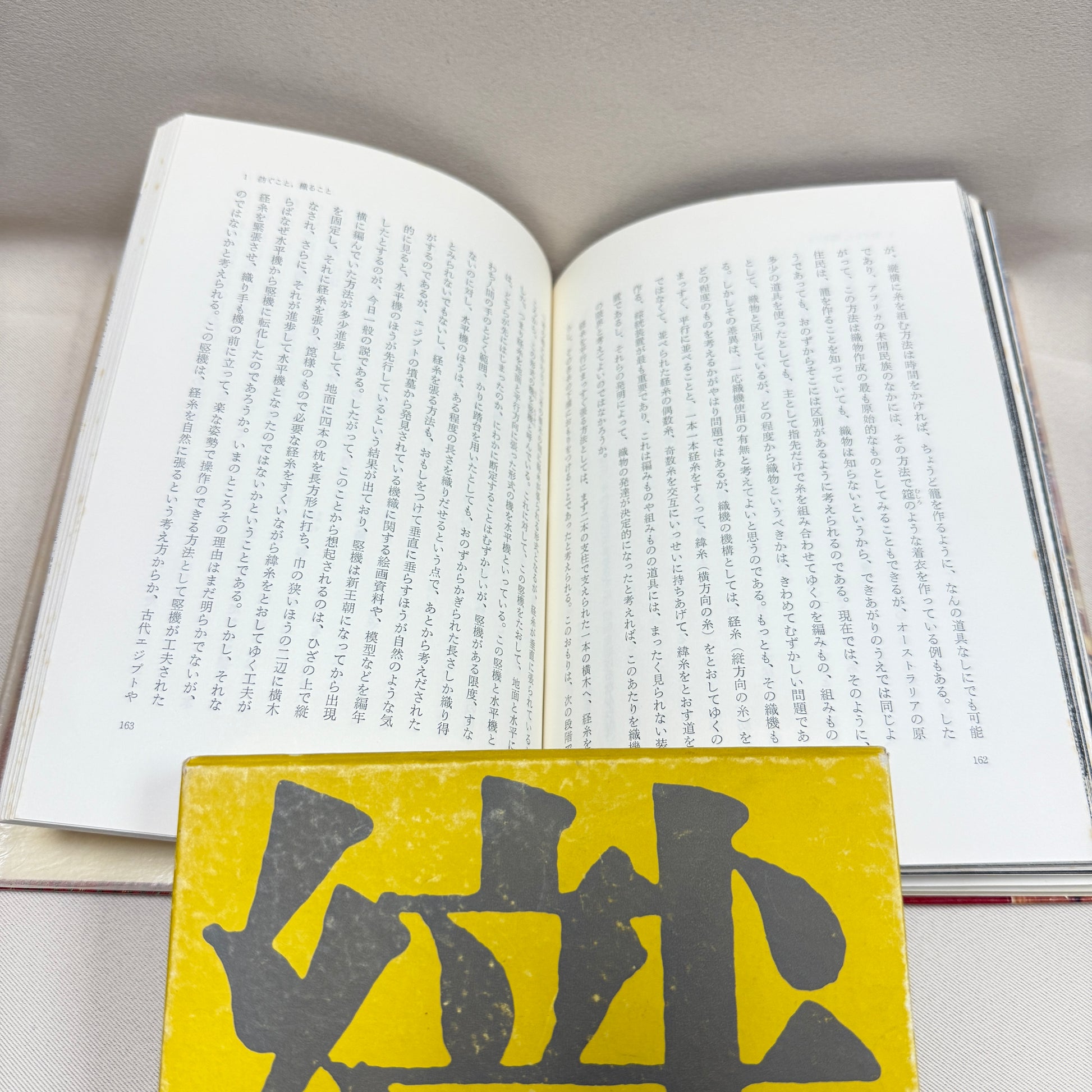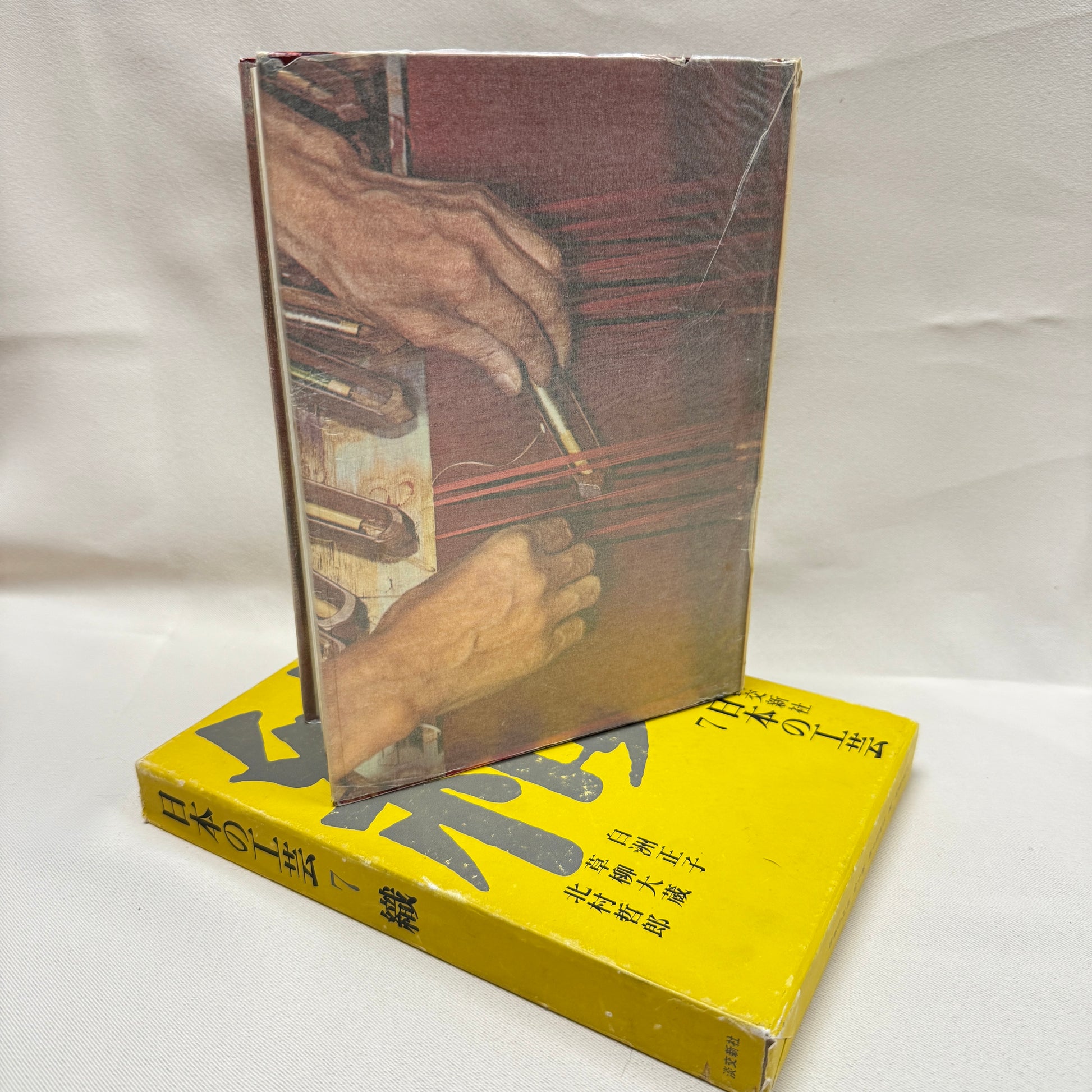 This volume focuses on the weaving side of textile production, showing looms, thread, ands weaving techniques used to create traditional Japanese fabrics. The cover image showing hands working on a loom reflects the subject of the book. It includes black and white photography with some color images and Japanese text explaining the craft.
