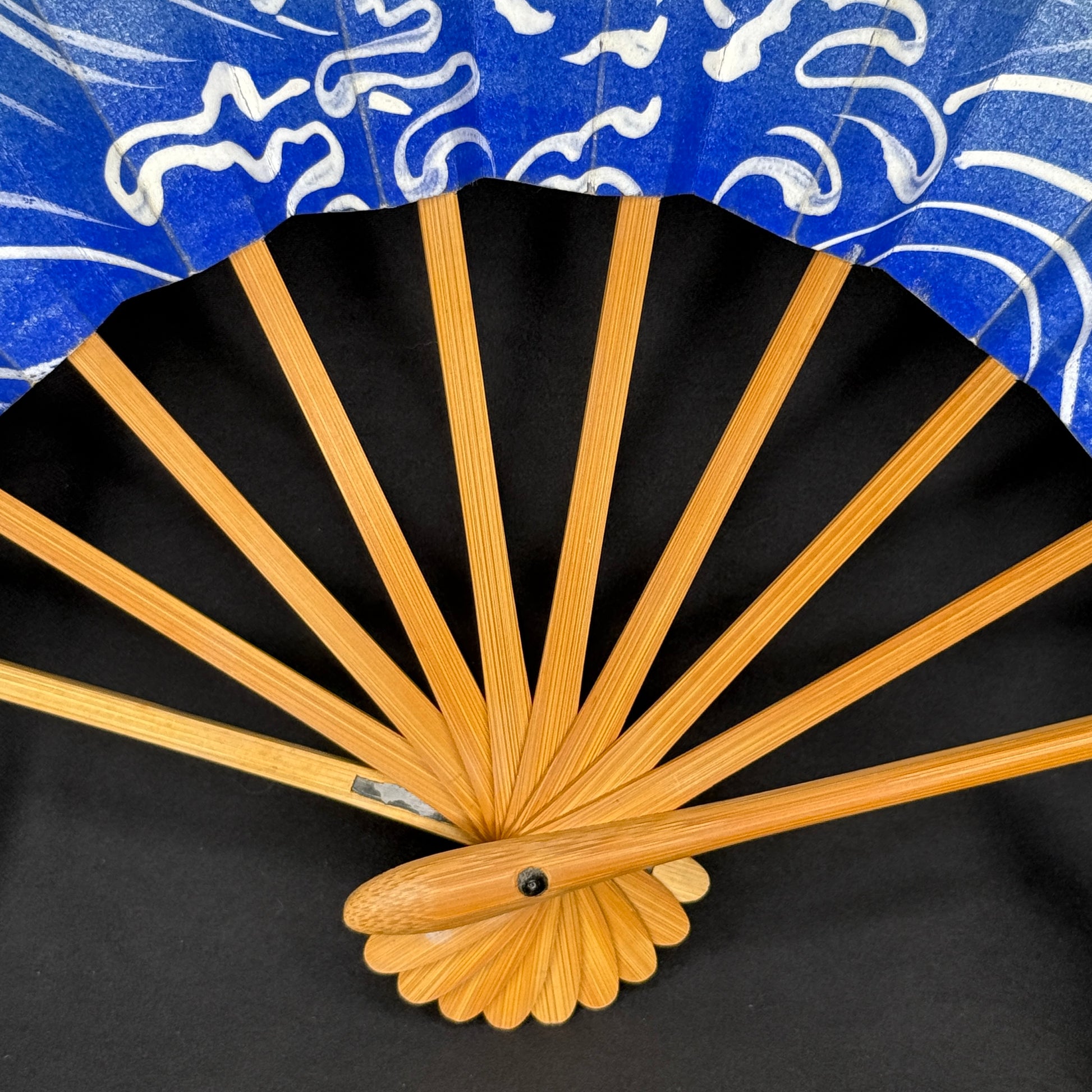 This Kyoto dance fan (Kyo-Sensu) captures the beauty and rhythm of the sea with elegant restraint. Silver and pearl tones fade into bright ocean blue, where stylized waves crest in soft white, evoking a scene reminiscent of traditional Japanese woodblock prints. The design conveys motion and serenity, balanced by natural bamboo ribs. Crafted by Iwasa Mokubei, one of Kyoto's historic fan makers, it arrives in its original box stamped with the maker's red seal. The design is the same on both sides.