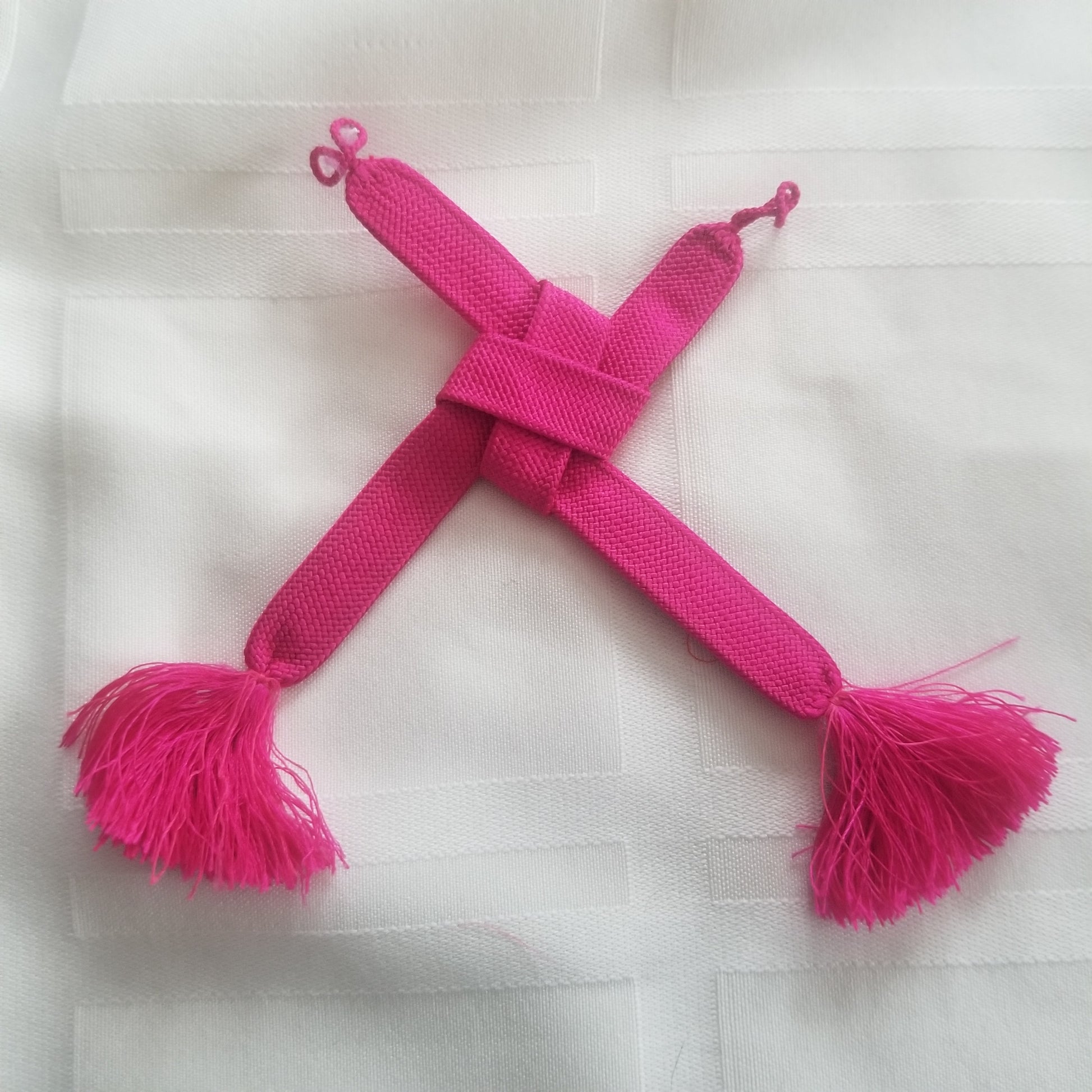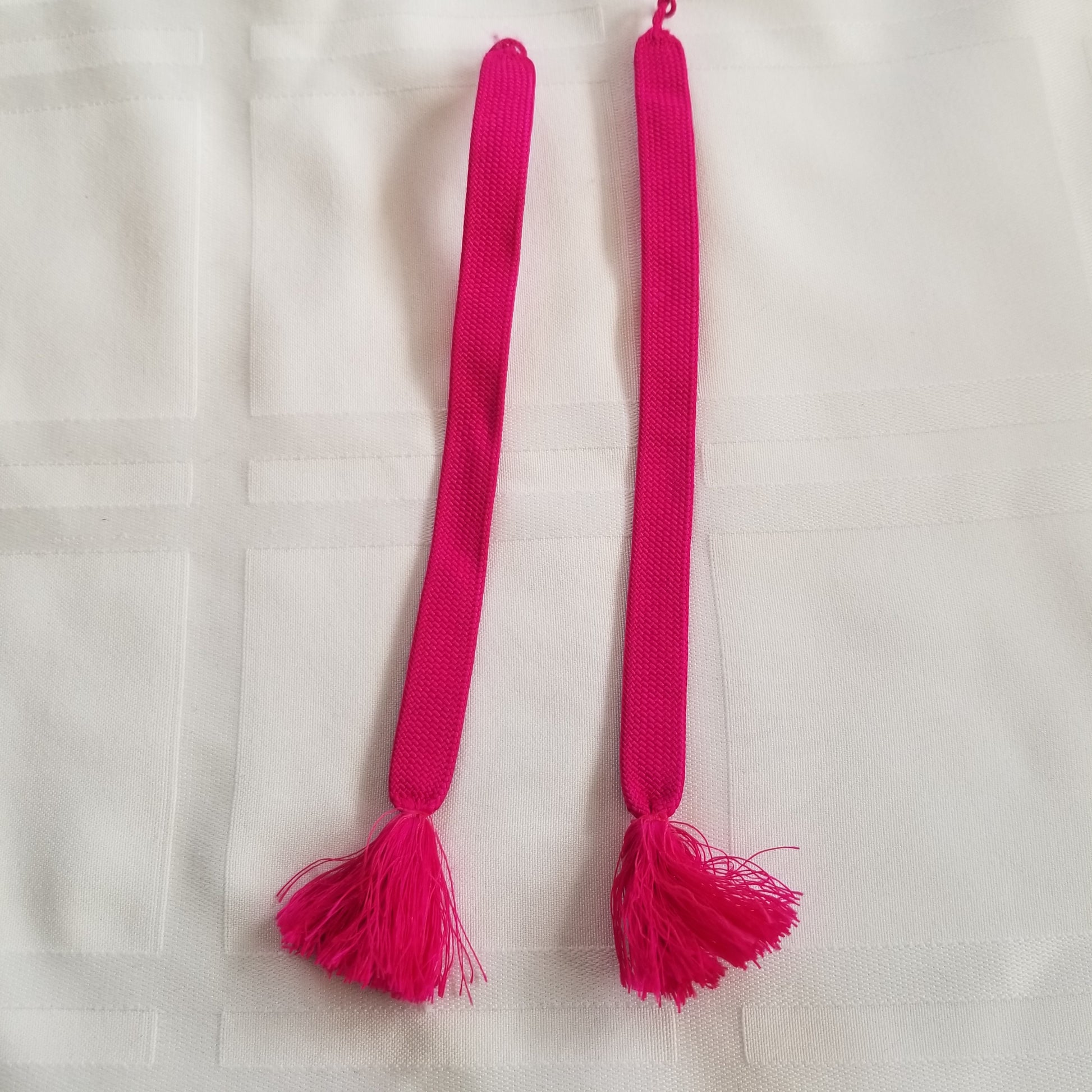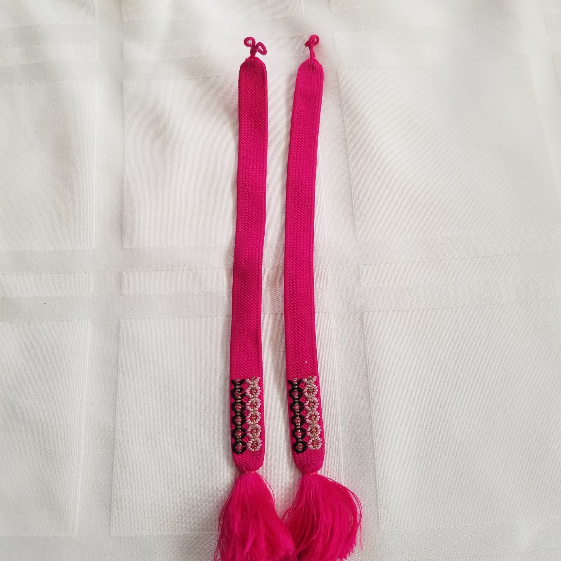 This listing is for a pair of vintage himo ties in a fuchsia pink with a pattern of black and white little flowers lined up at the tassel end of the ties. Very cute.