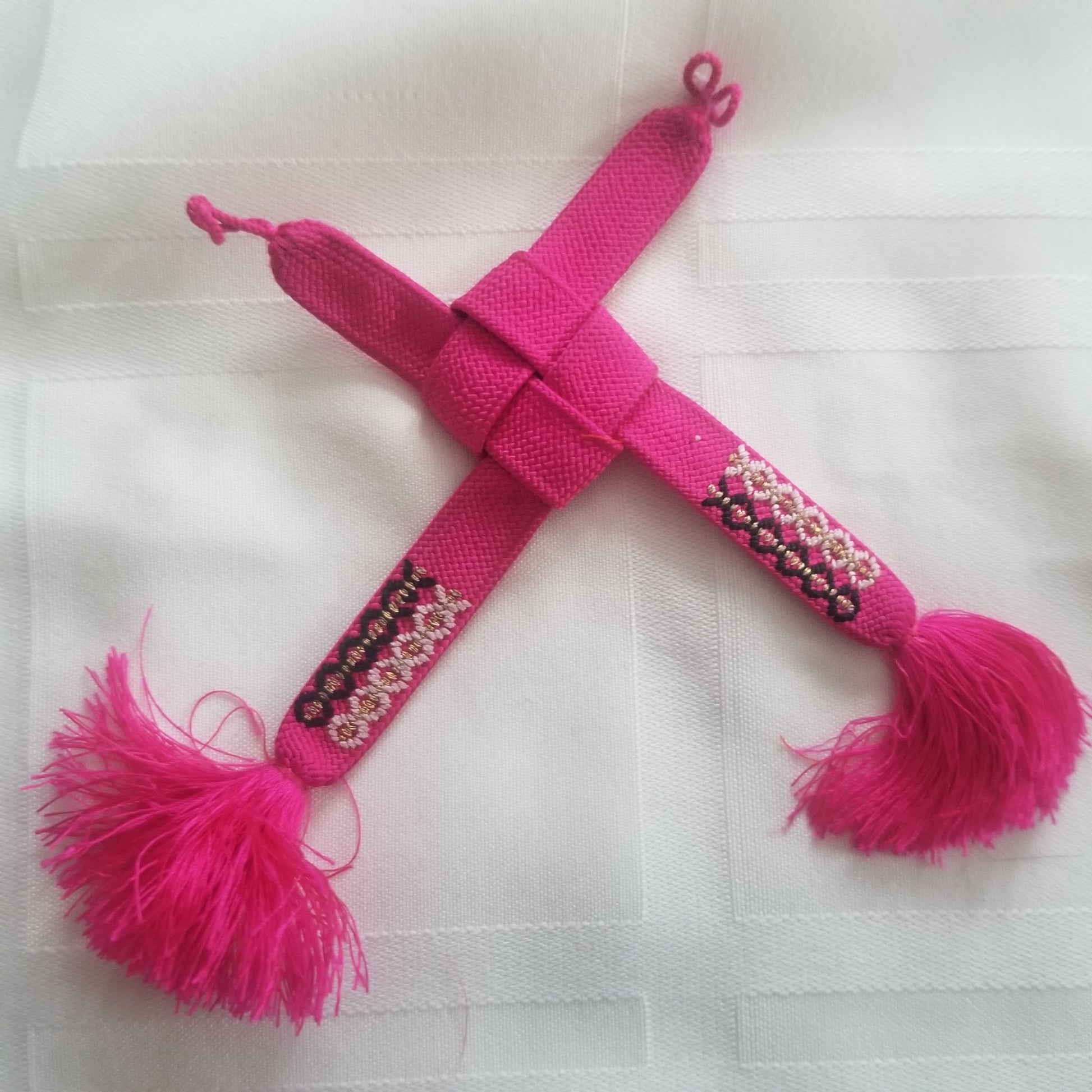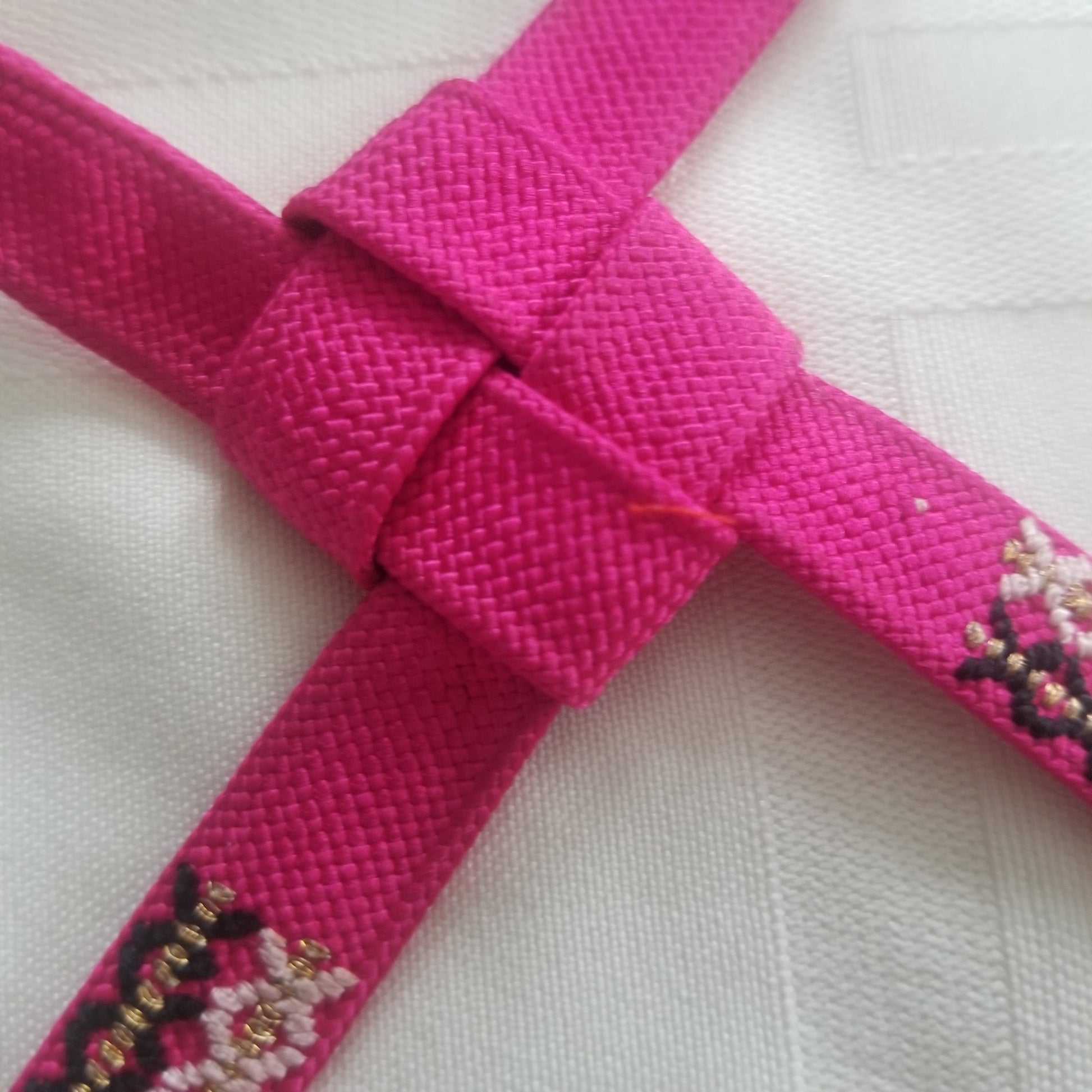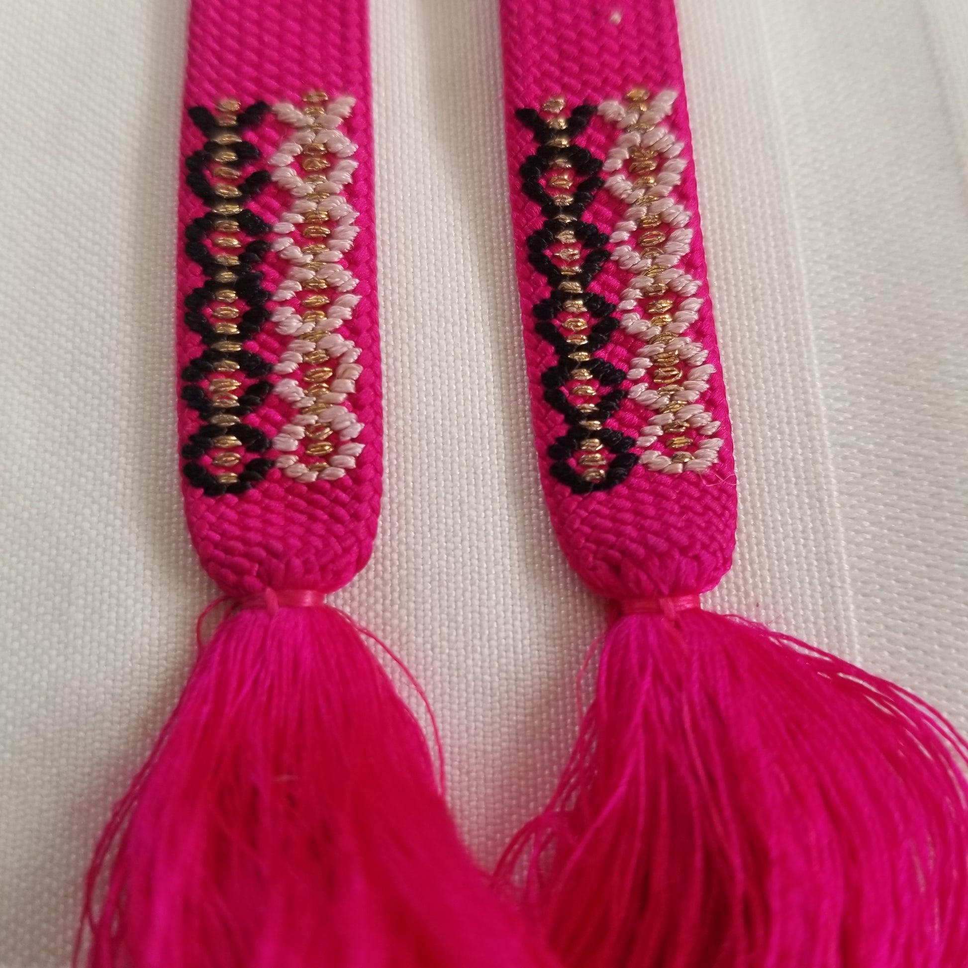 This listing is for a pair of vintage himo ties in a fuchsia pink with a pattern of black and white little flowers lined up at the tassel end of the ties. Very cute.