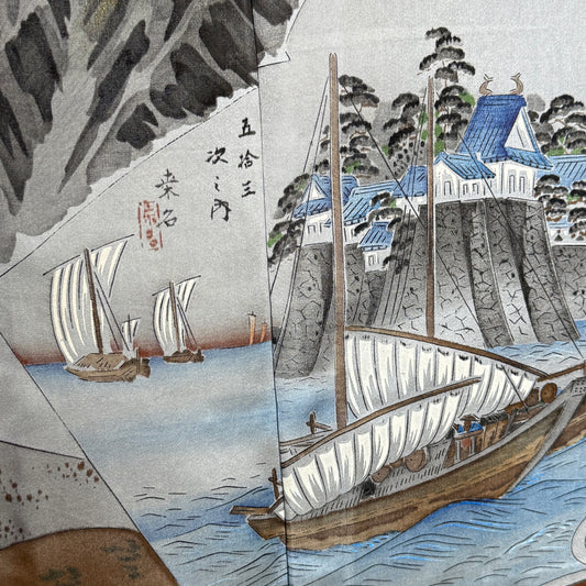Beautifully painted sailboats, trees, and a castle are among the details. See the artist's signature in the corner. The calligraphy near the sailboats translates to Gojusan-tsugi (53 stations) and refers to "The 53 Stations of the Tokaido" - a famous travel route between Edo and Kyoto.