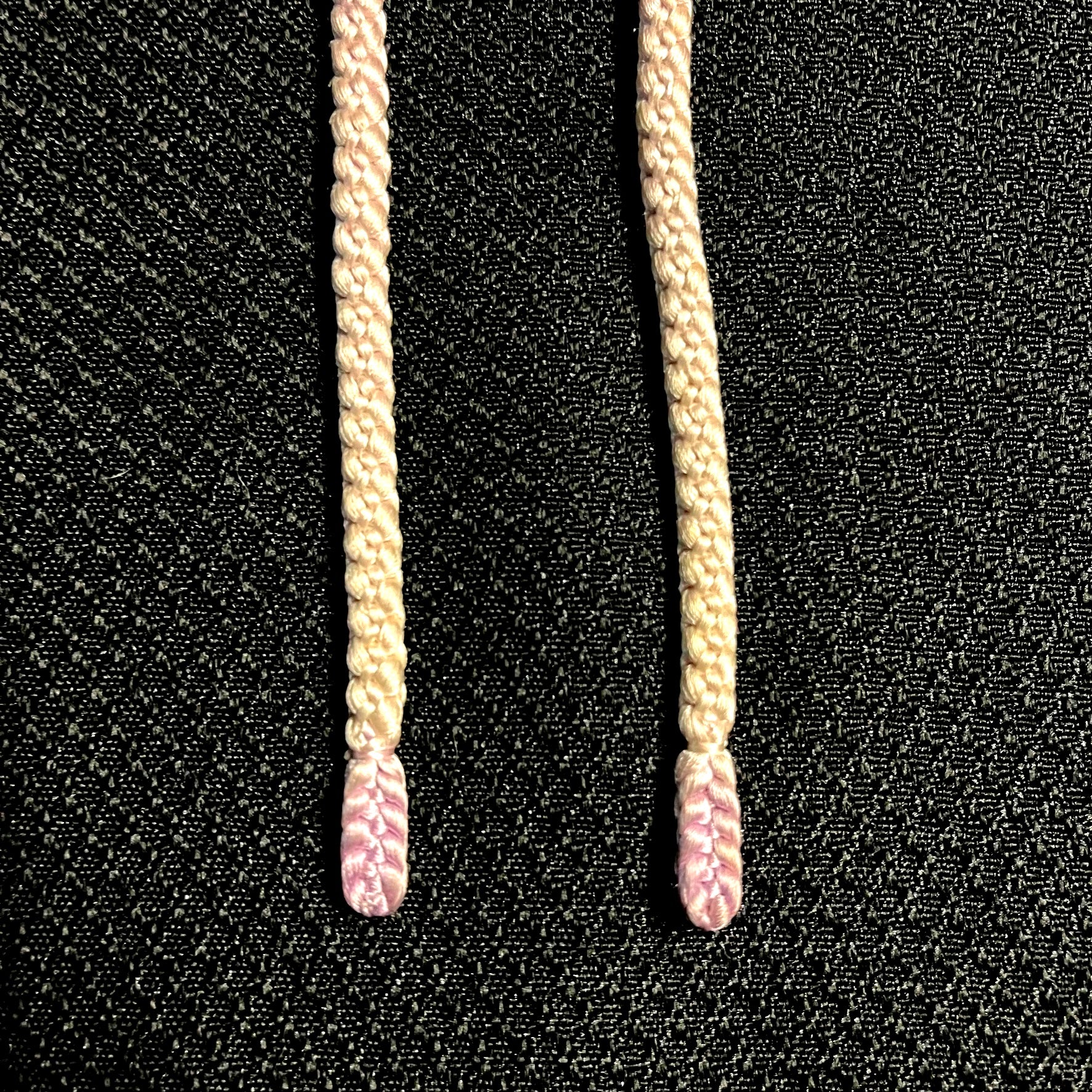 This listing is for a pair of vintage himo ties is subtle and soft. It's a rounded braid in cream and very light purple that is a but darker at the rounded ends. No tassle.