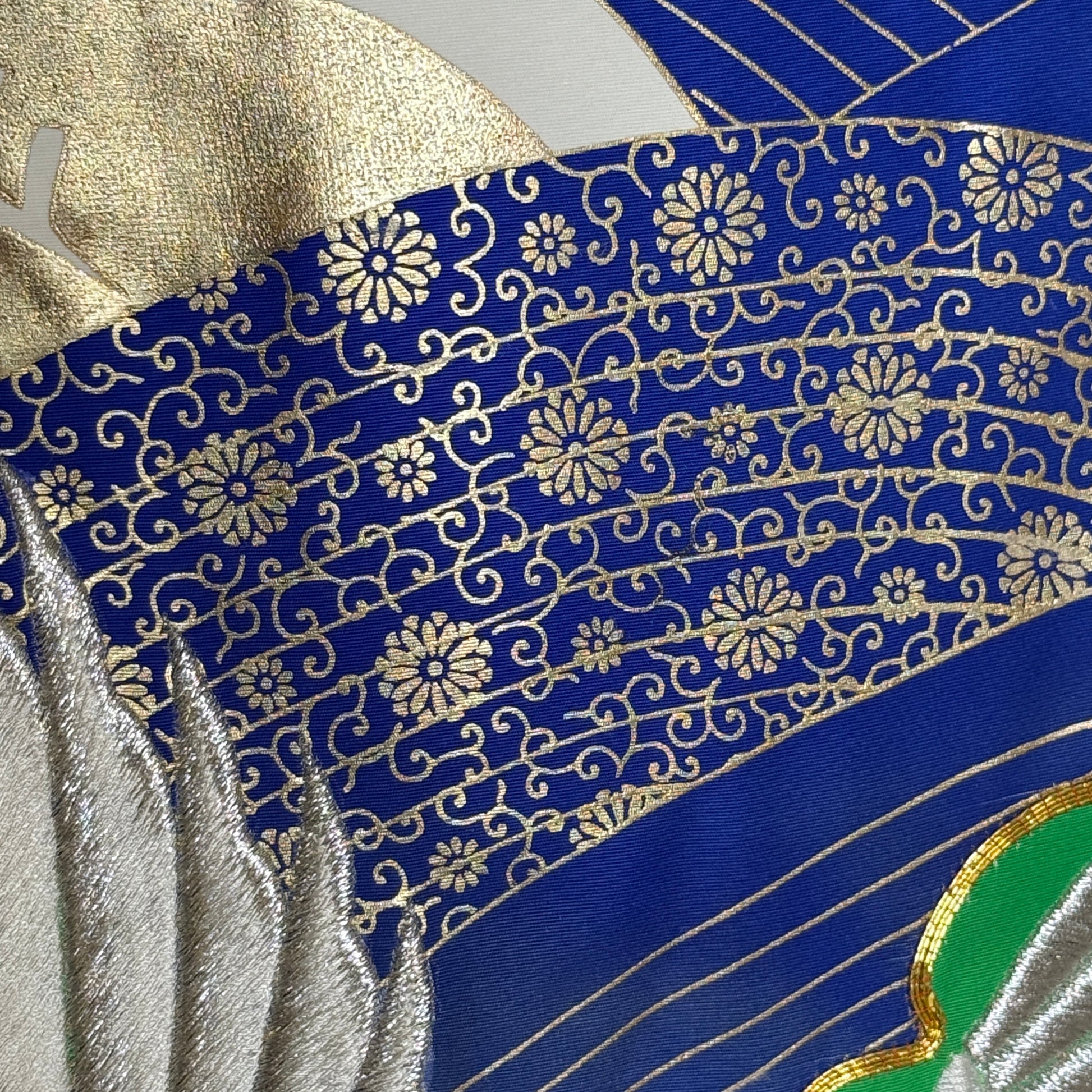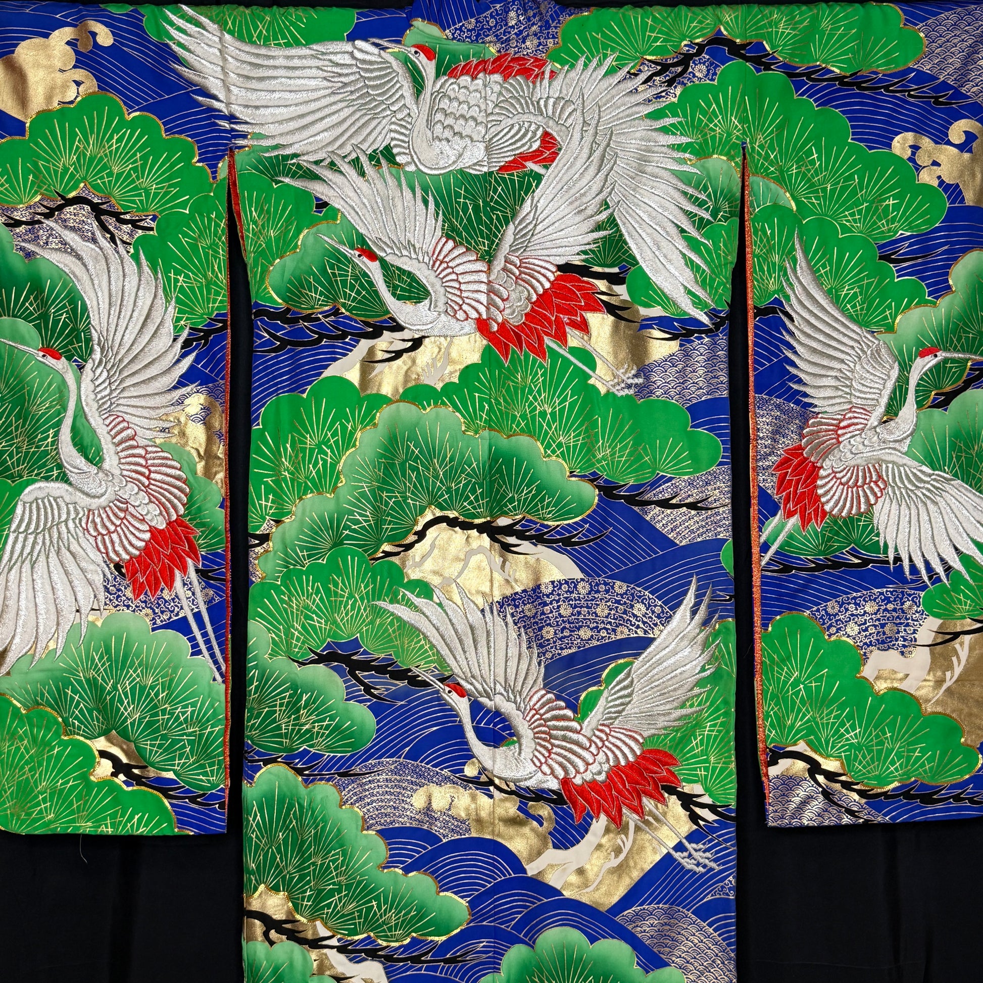 This uchikake features large cranes (tsuru) soaring above pine boughs (matsu). These motifs are well-matched, as they both symbolize longevity - a common wedding motif. Cranes mate for life and are thought to live 1,000 years according to Japanese mythology. Pine trees are evergreen, symbolizing endurance and longevity.