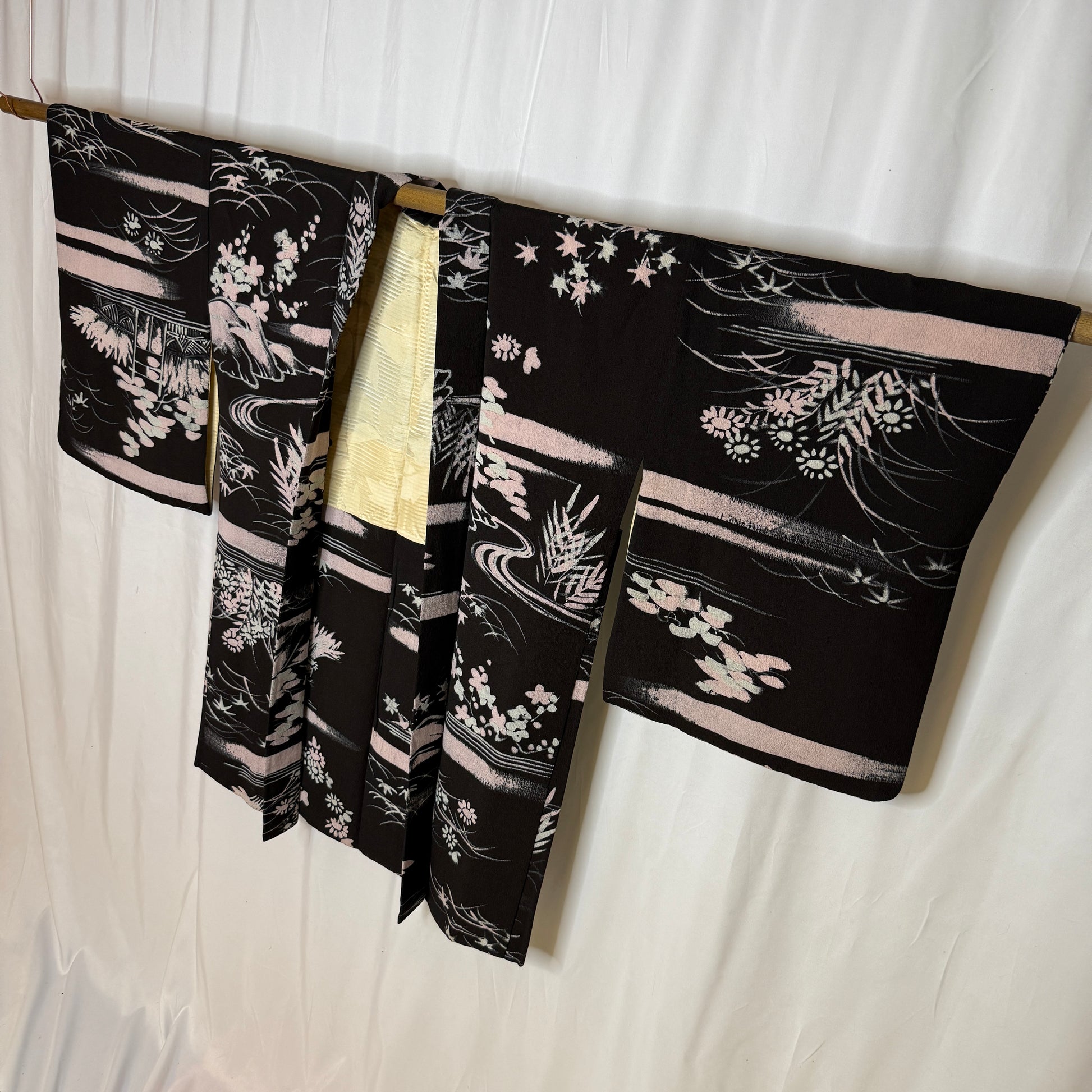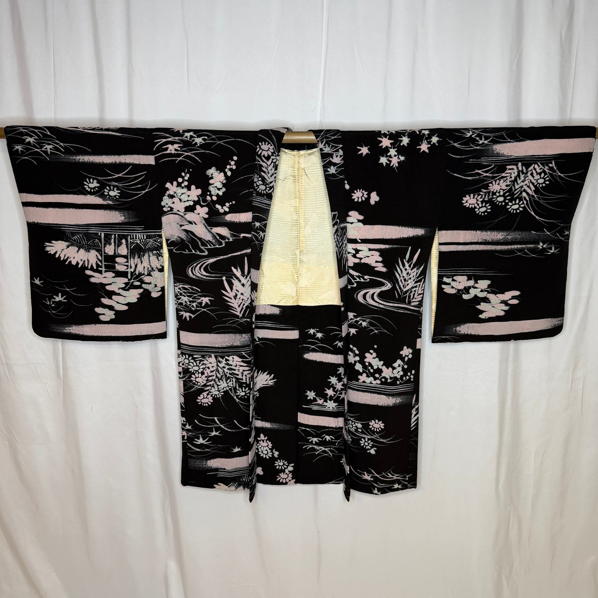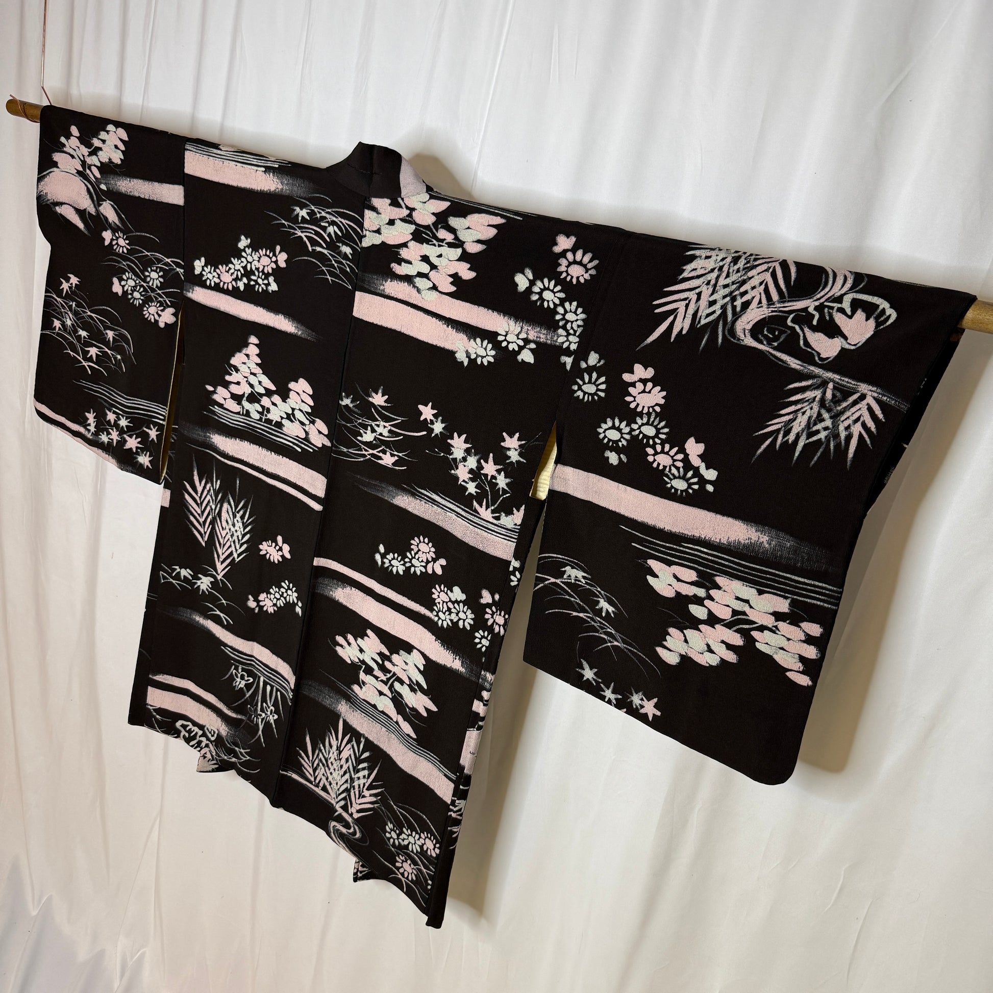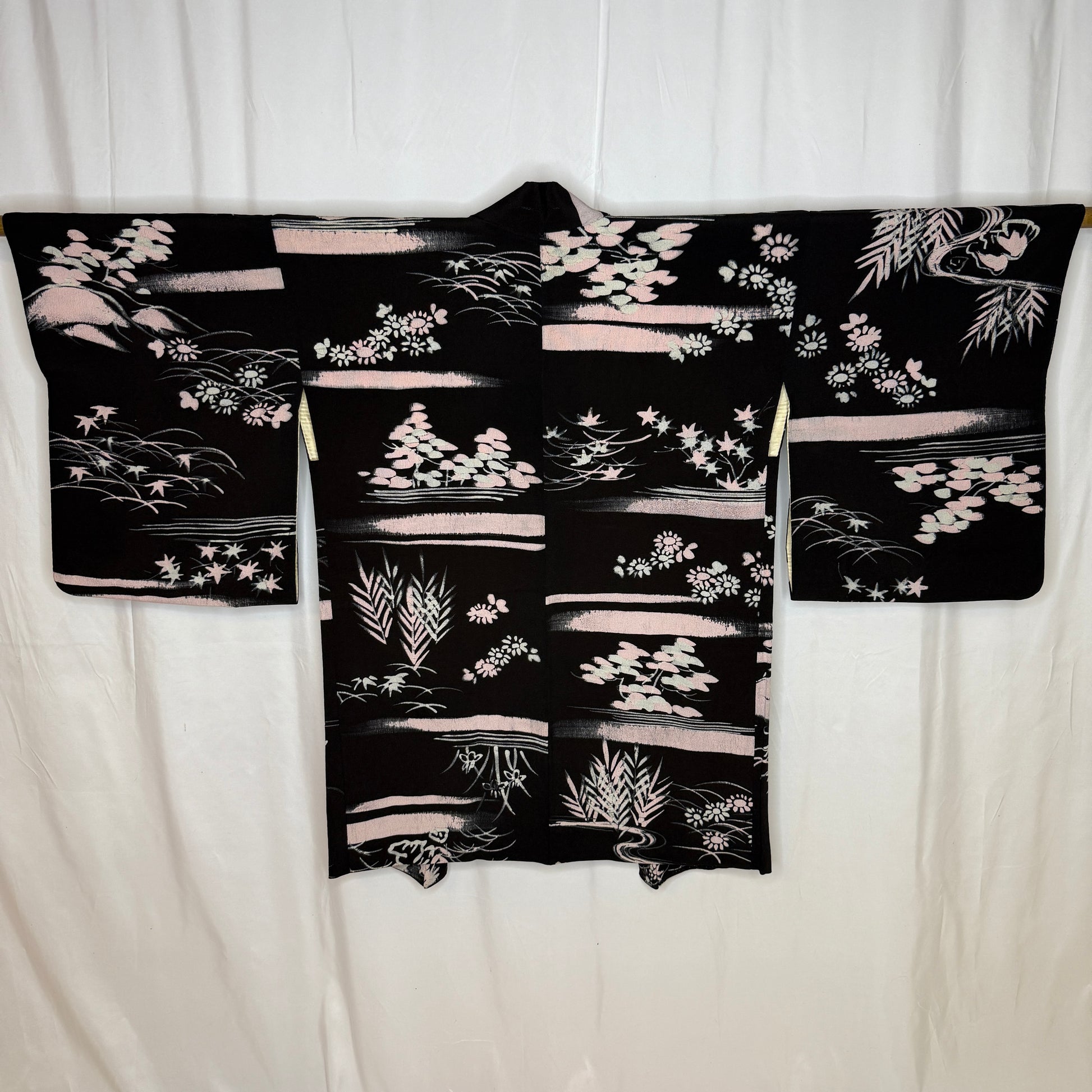 This woman's haori jacket showcases the artistry of traditional resist-dye techniques that appear to be hand brushed, not stenciled. The black silk is patterned with various florals, trees, grasses, and other foliage in a pale pink and cream. The motifs leave behind soft edges which gives a free-style, hand-painted feel. The colors offer a high contrast - like a moonlit garden at night.