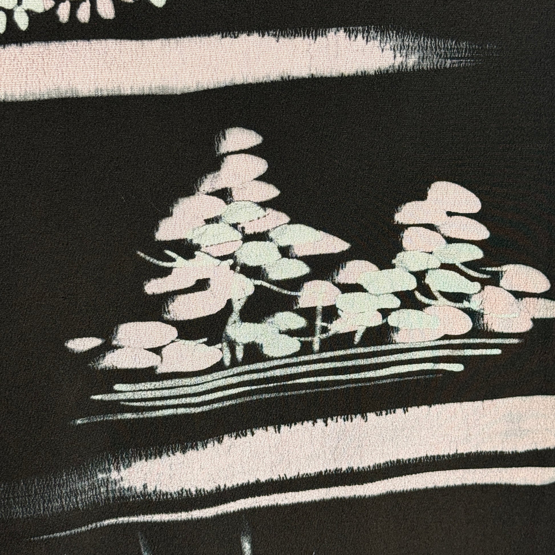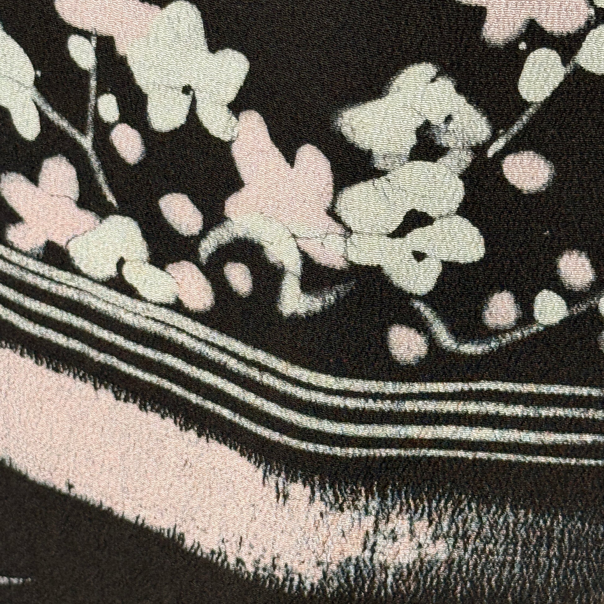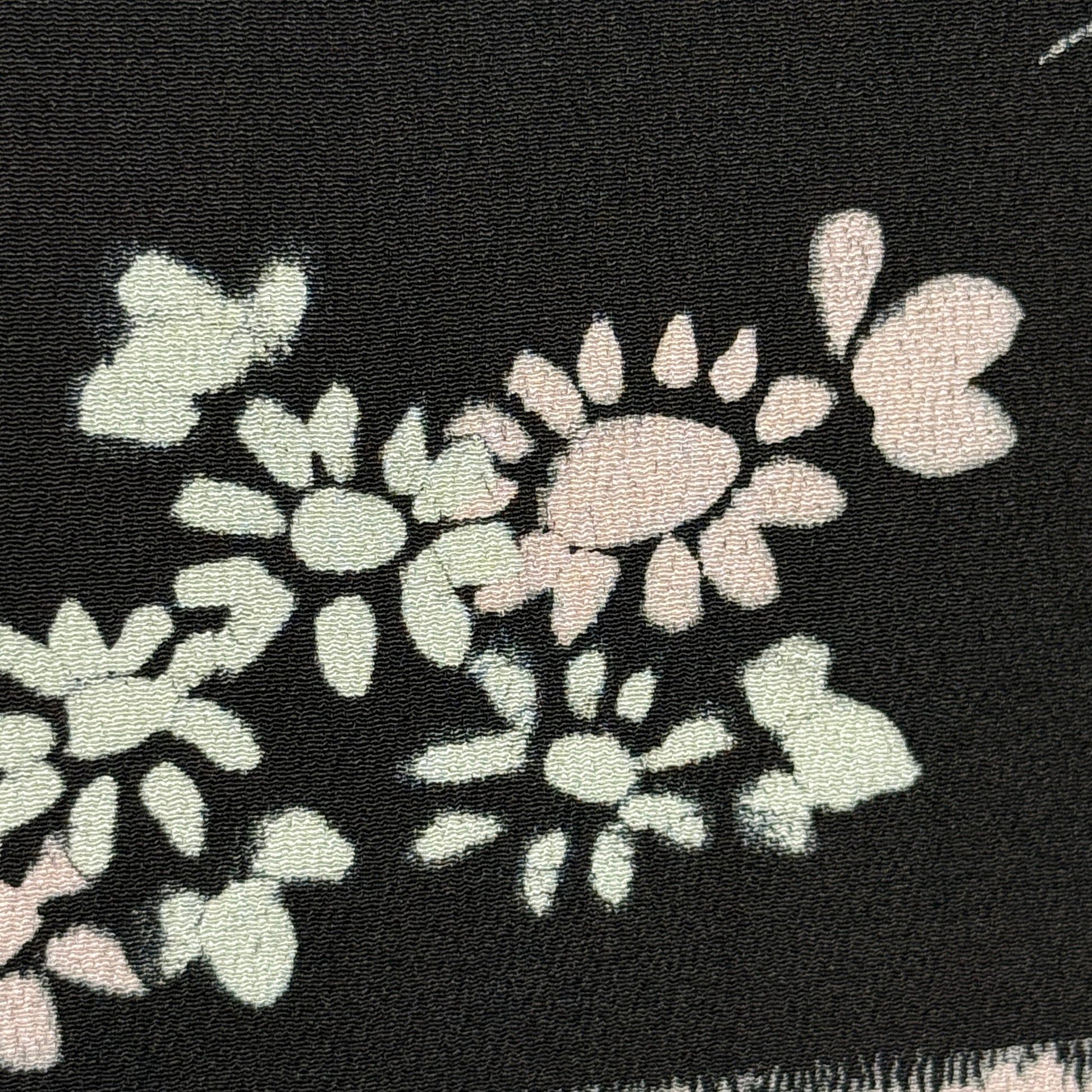 This woman's haori jacket showcases the artistry of traditional resist-dye techniques that appear to be hand brushed, not stenciled. The black silk is patterned with various florals, trees, grasses, and other foliage in a pale pink and cream. The motifs leave behind soft edges which gives a free-style, hand-painted feel. The colors offer a high contrast - like a moonlit garden at night.
