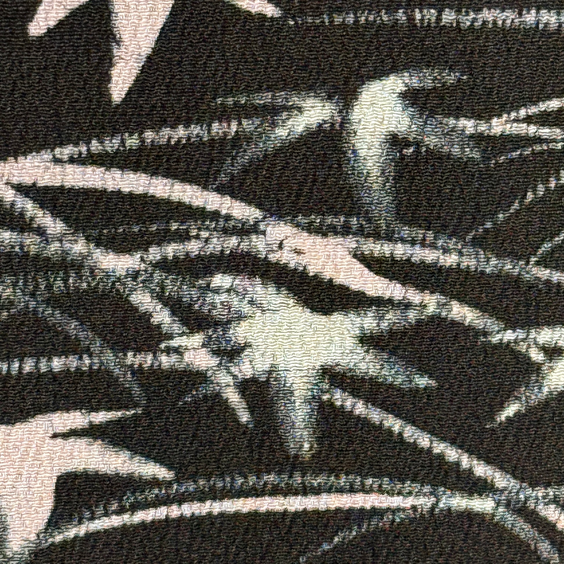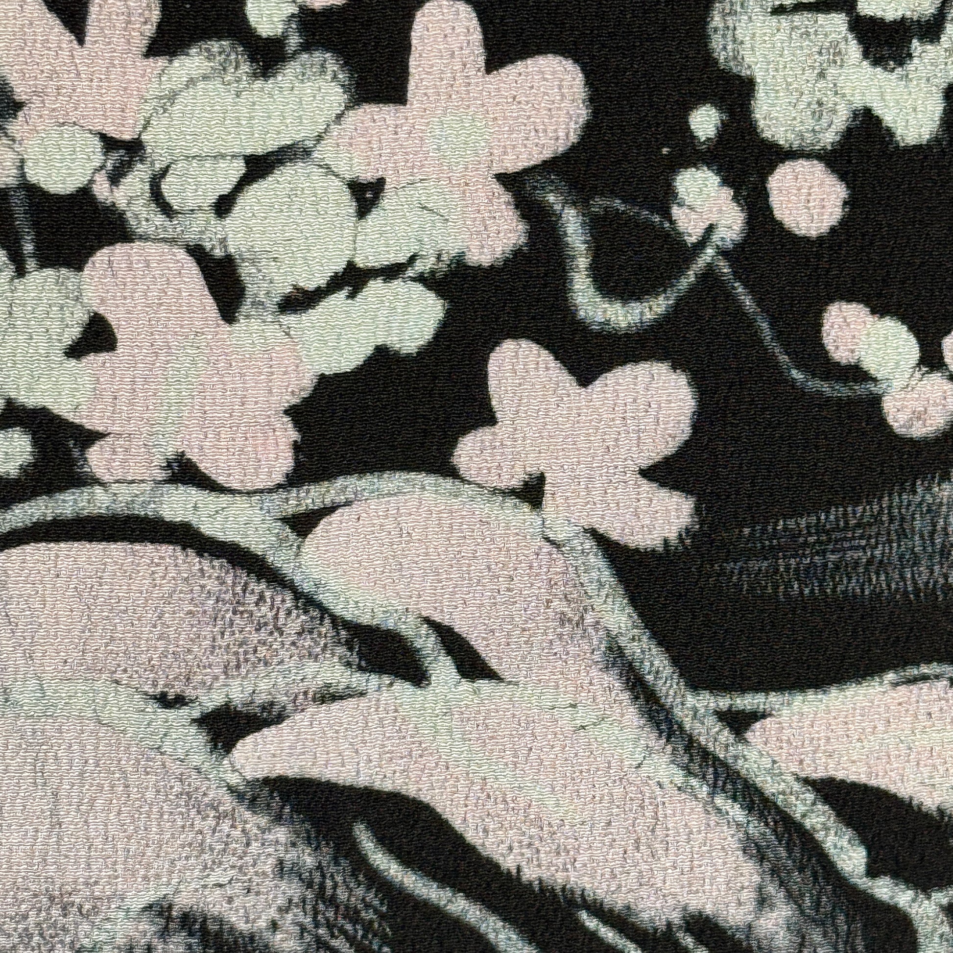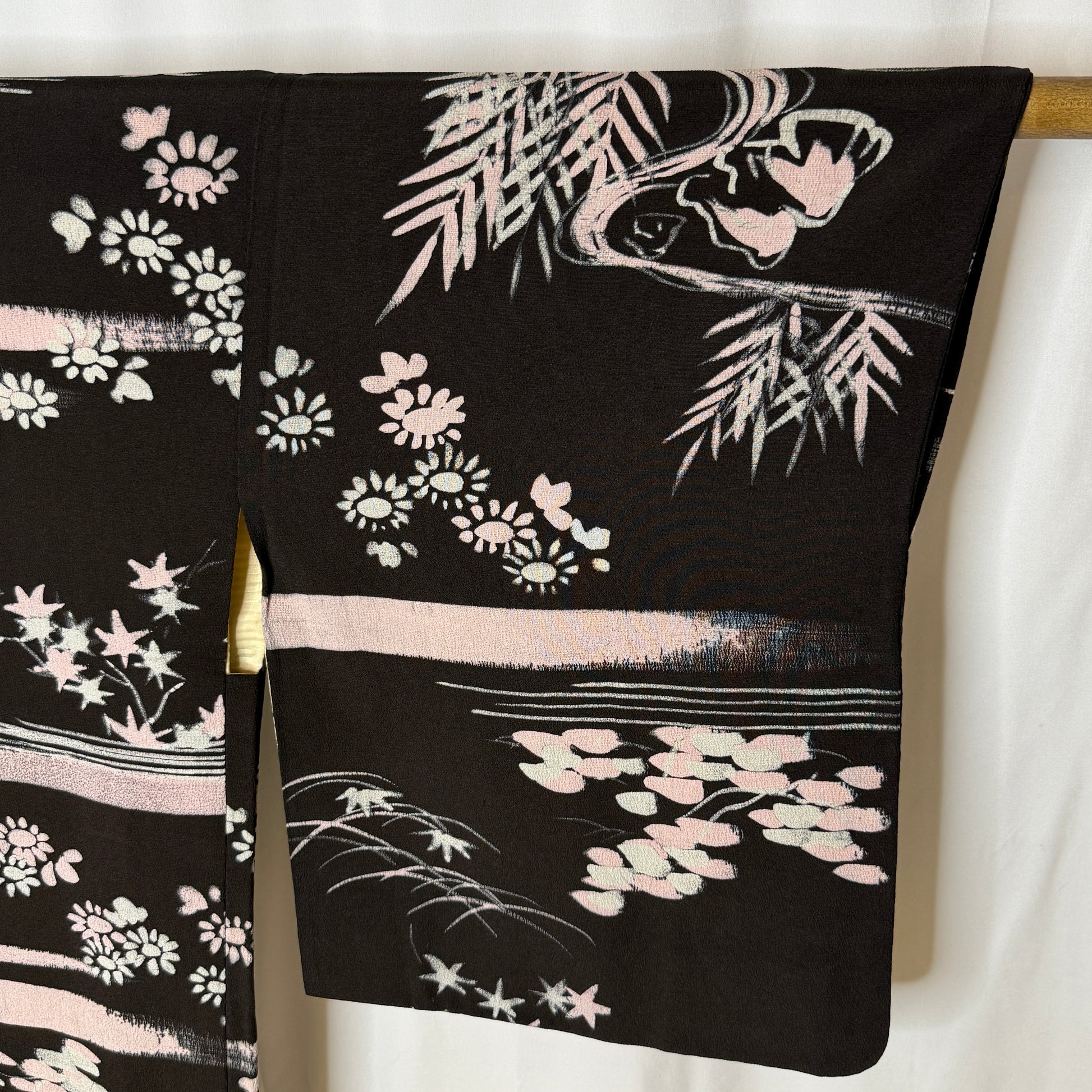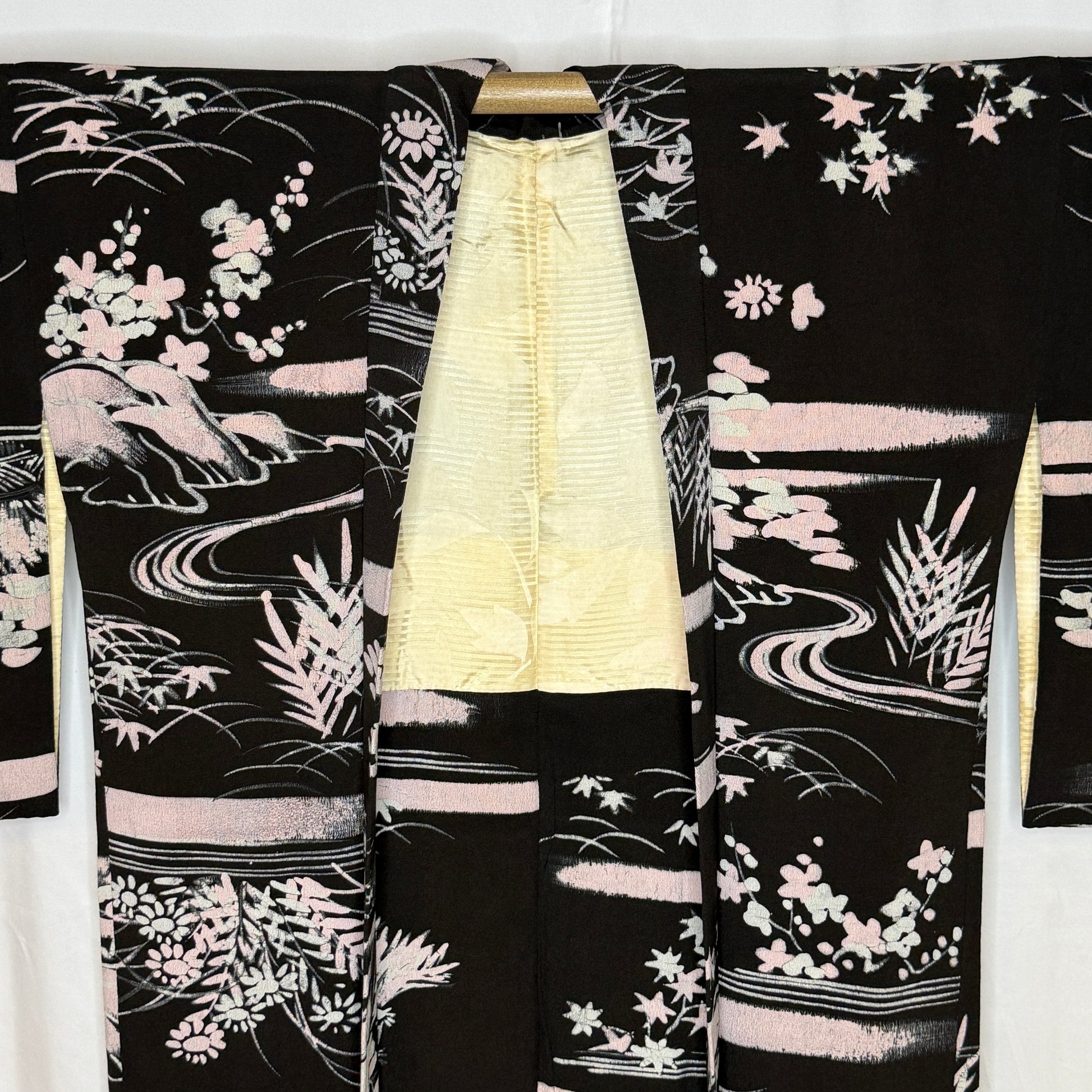 This woman's haori jacket showcases the artistry of traditional resist-dye techniques that appear to be hand brushed, not stenciled. The black silk is patterned with various florals, trees, grasses, and other foliage in a pale pink and cream. The motifs leave behind soft edges which gives a free-style, hand-painted feel. The colors offer a high contrast - like a moonlit garden at night.
