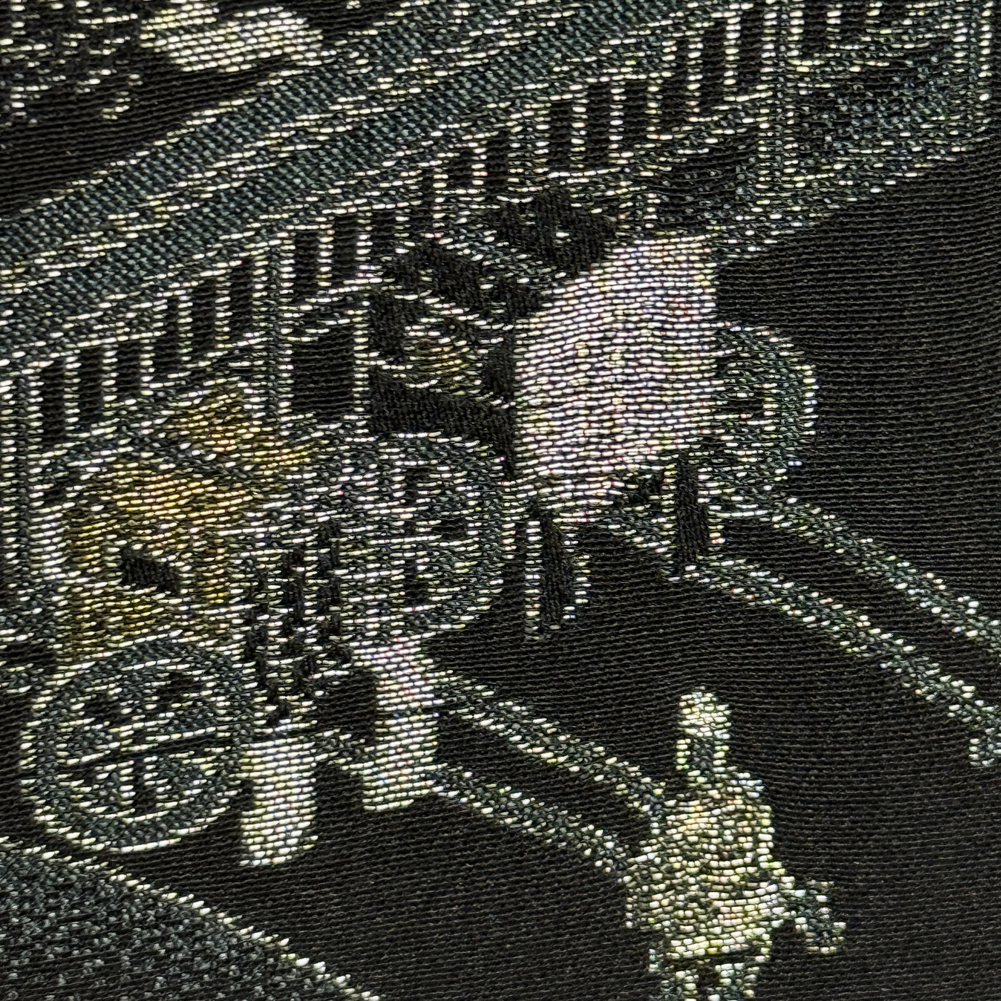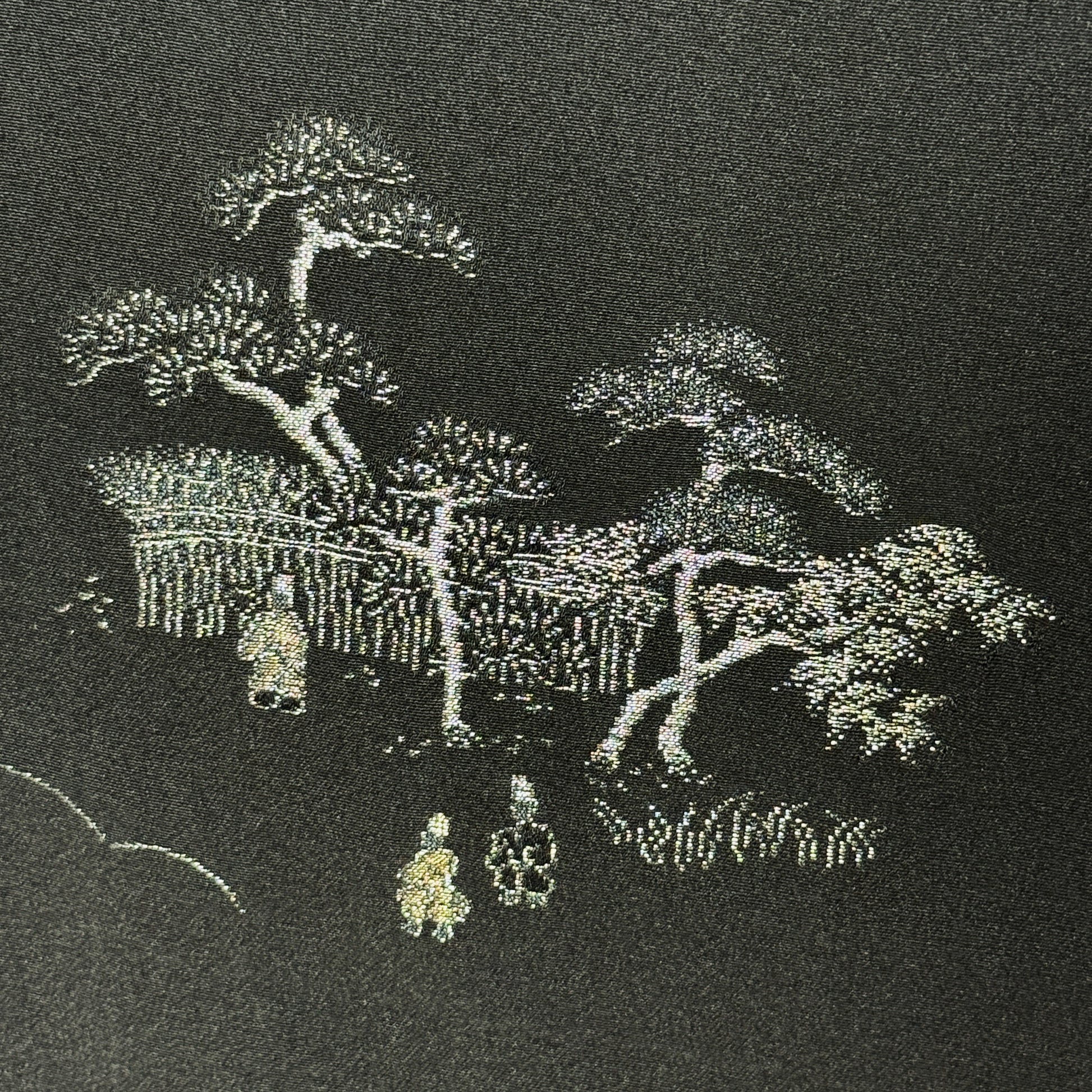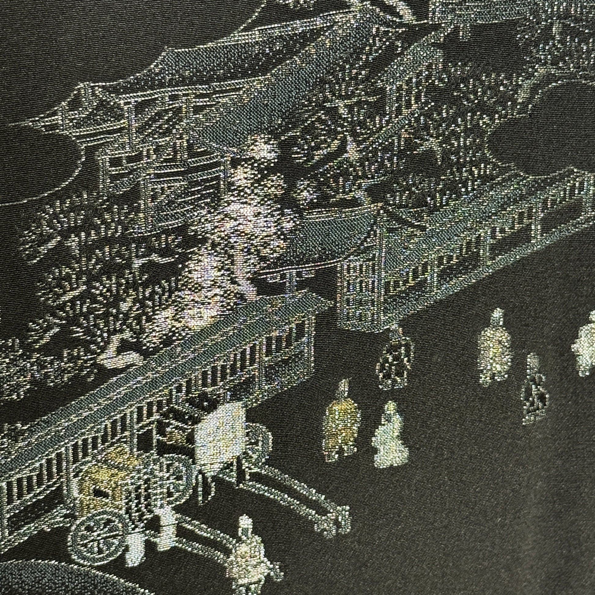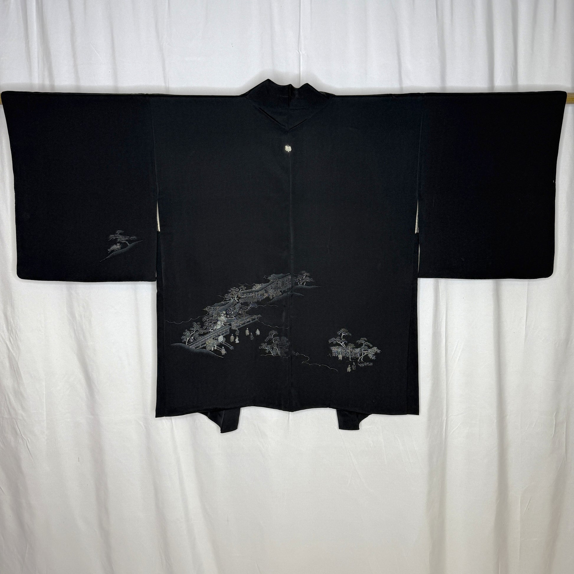 This haori Invites you into the quiet world, of an extraordinary landscape. Rendered in shimmering metallic threads, it captures village rooftops, lantern-lit walkways, and graceful pine trees with exquisite miniature detail. The design floats on deep black silk that adds both drama and calm, while a single paulownia crest at the neck subtly marks formality and heritage. Every woven figure and architectural line reflects masterful craftsmanship, creating the wearable artwork of a scene paused in time.