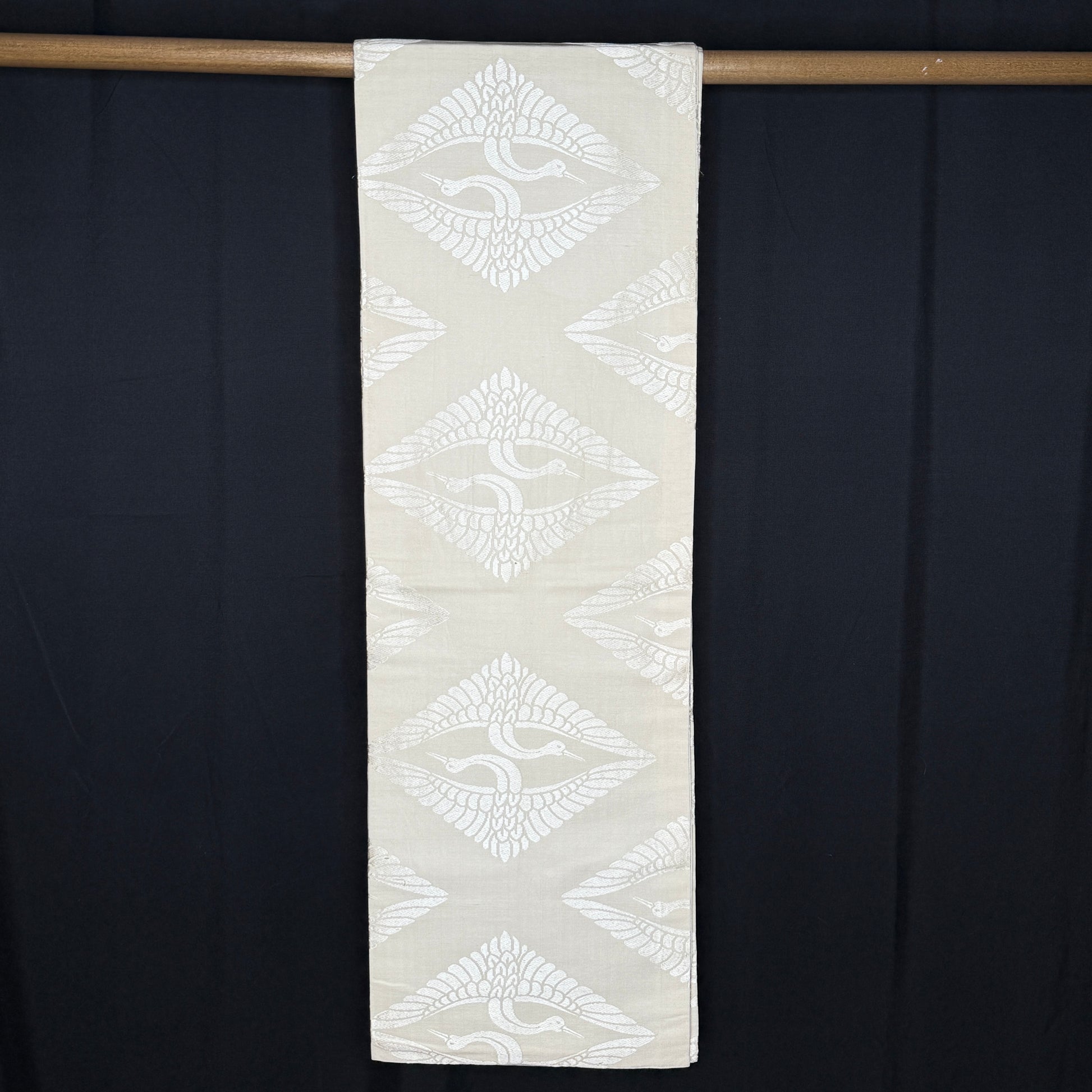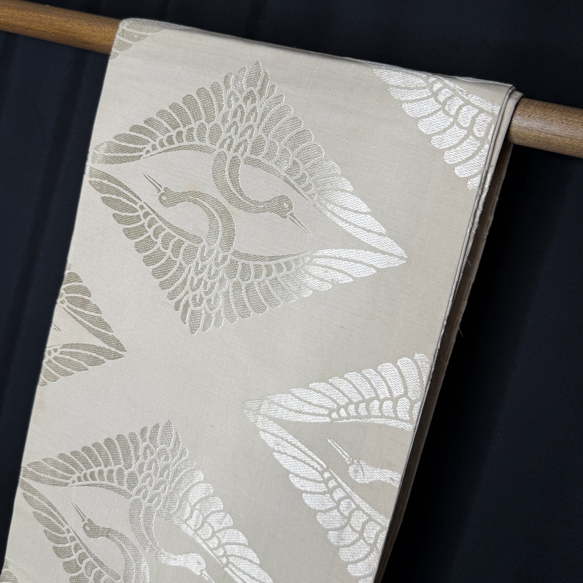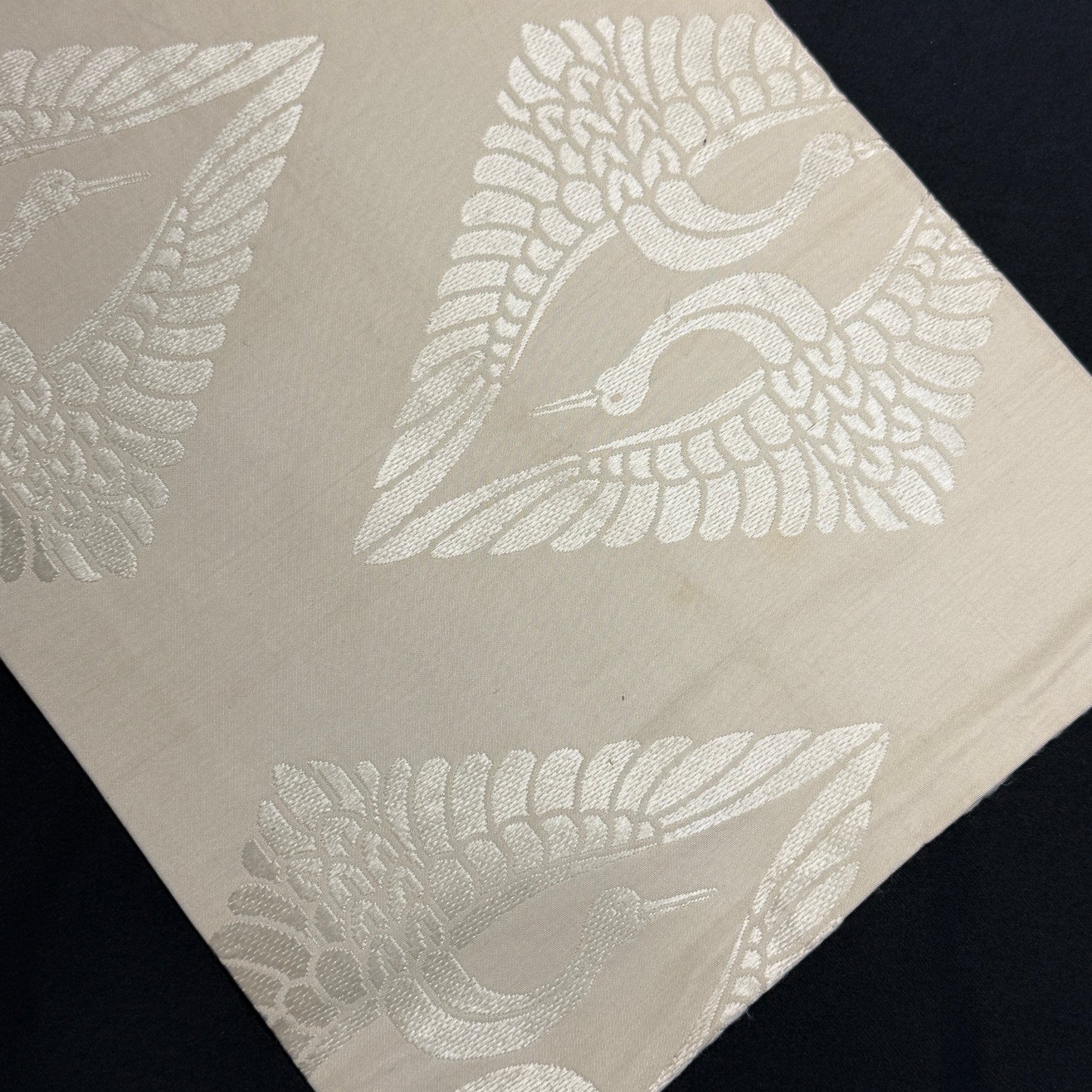 There is something almost sacred about cranes in flight, and this cream maru obi captures that symbolism in luminous woven silk. Mirrored cranes spread their wings in rhythmic symmetry, their feathers rendered in textured jacquard that catches the light with quiet elegance. The soft ivory background creates a celebratory refinement, making it equally stunning for bridal styling, formal kimono, or as a dramatic textile for display.