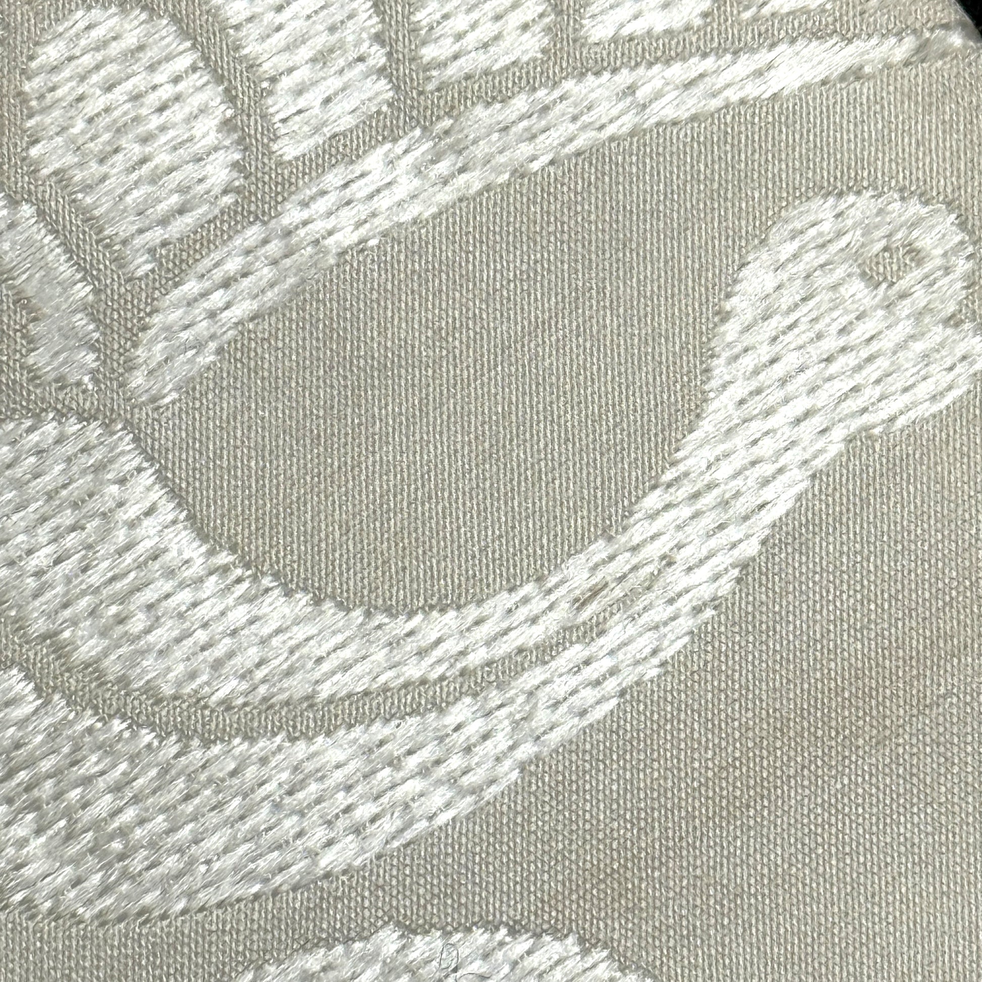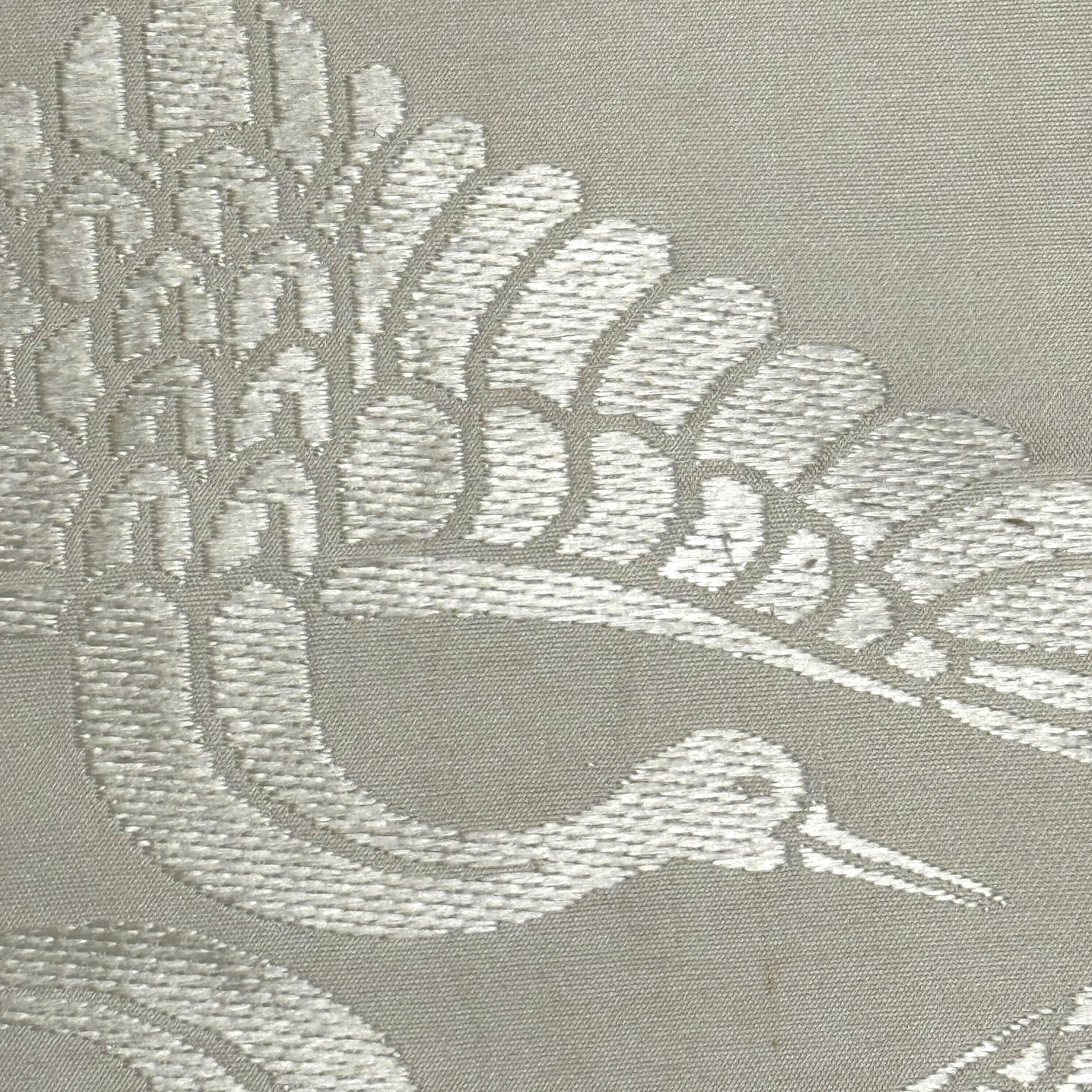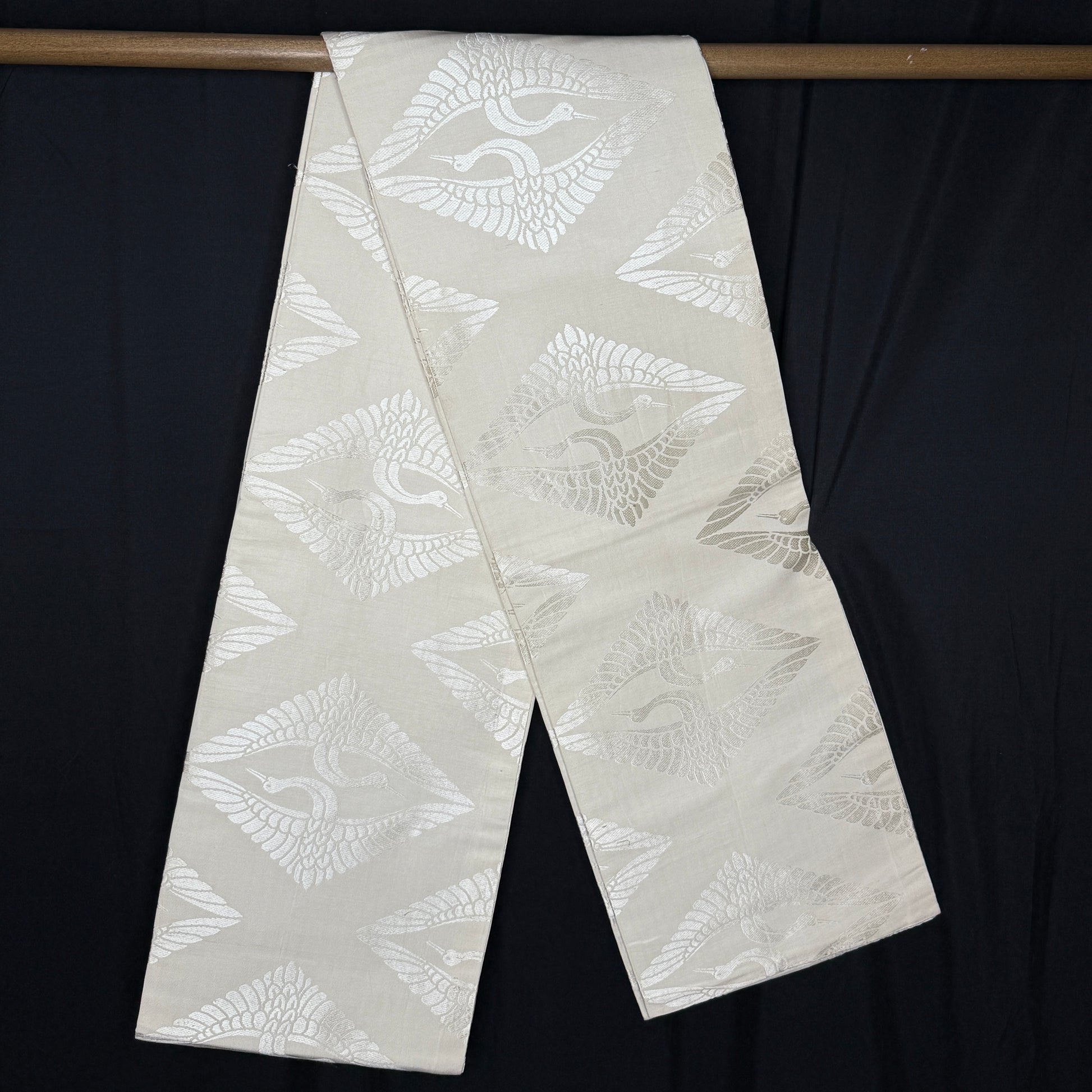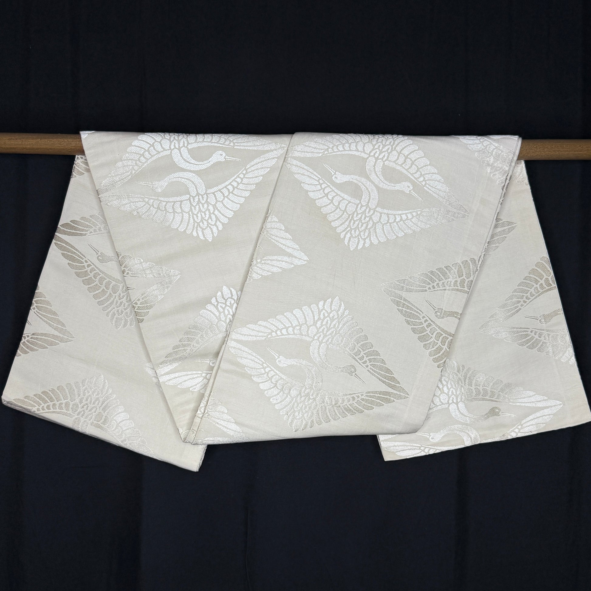 There is something almost sacred about cranes in flight, and this cream maru obi captures that symbolism in luminous woven silk. Mirrored cranes spread their wings in rhythmic symmetry, their feathers rendered in textured jacquard that catches the light with quiet elegance. The soft ivory background creates a celebratory refinement, making it equally stunning for bridal styling, formal kimono, or as a dramatic textile for display.