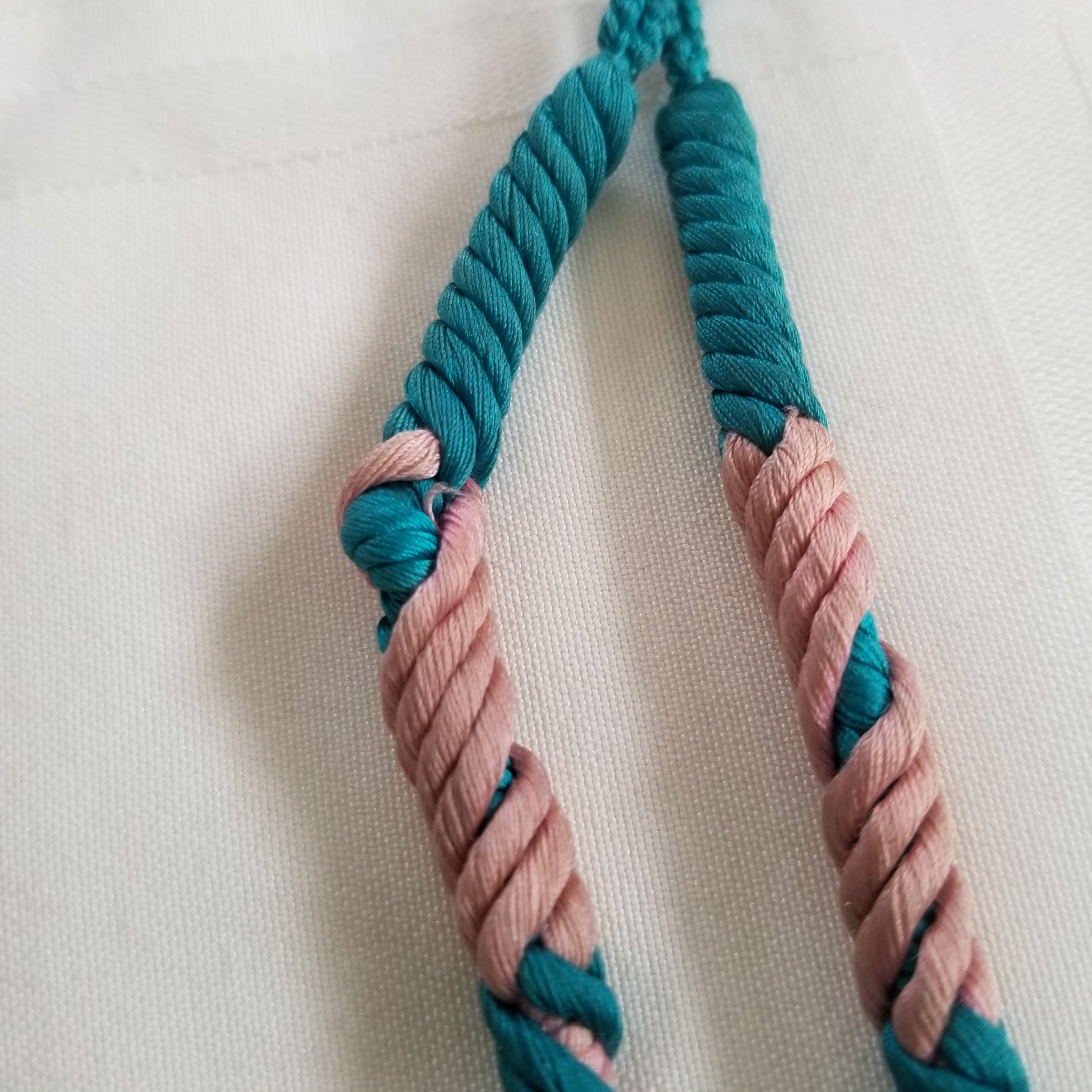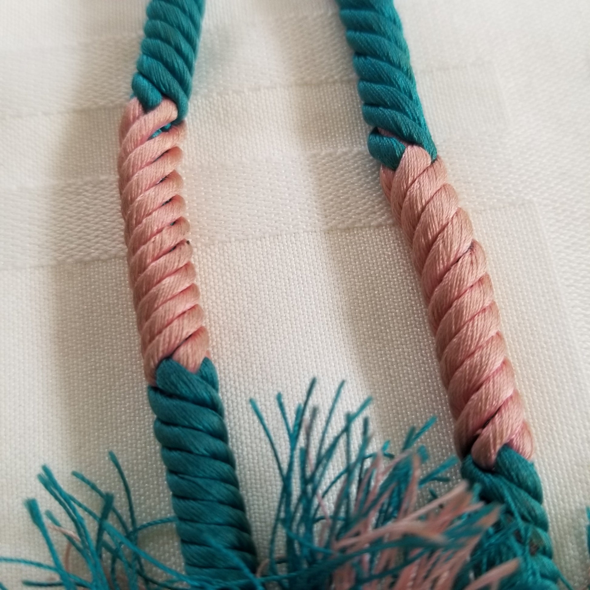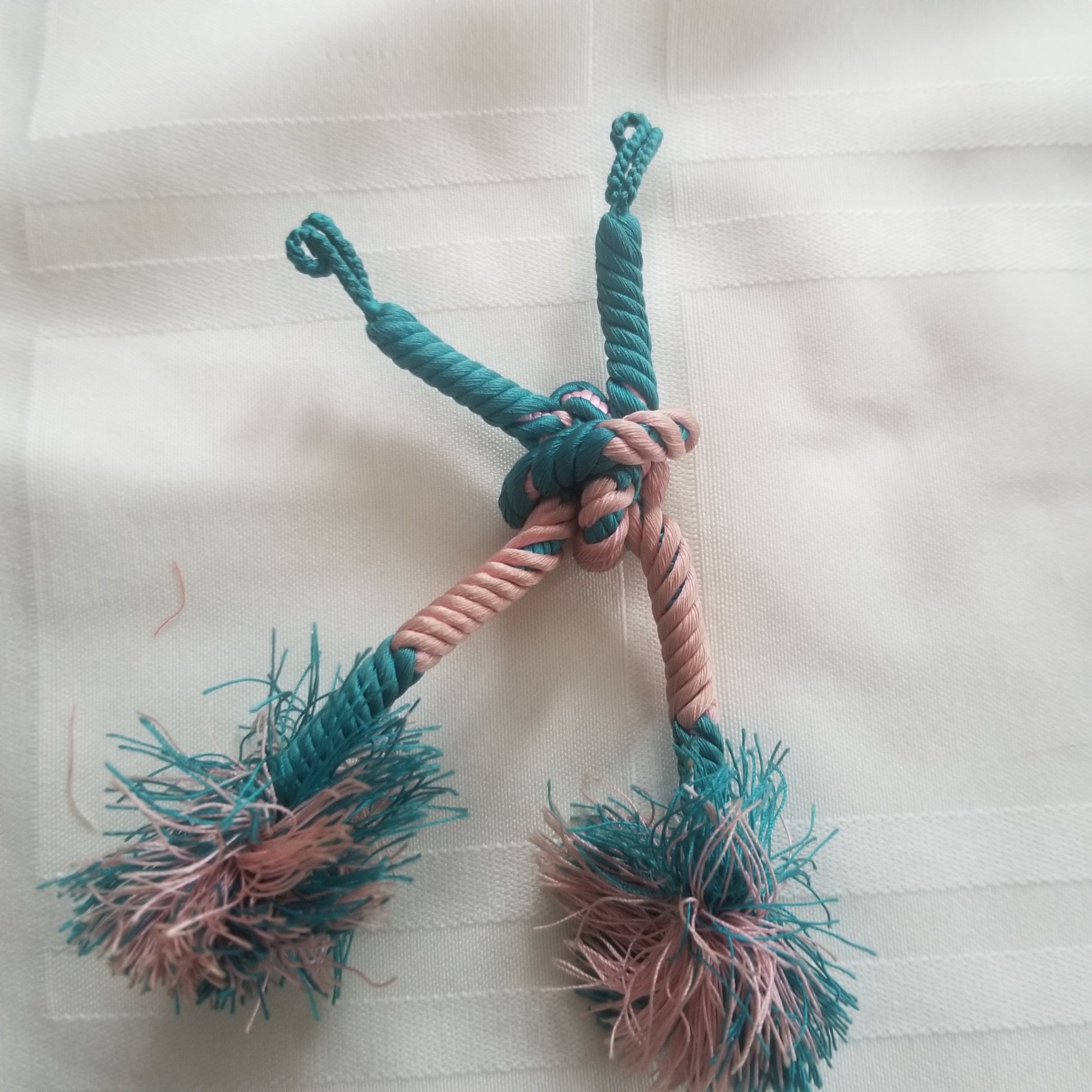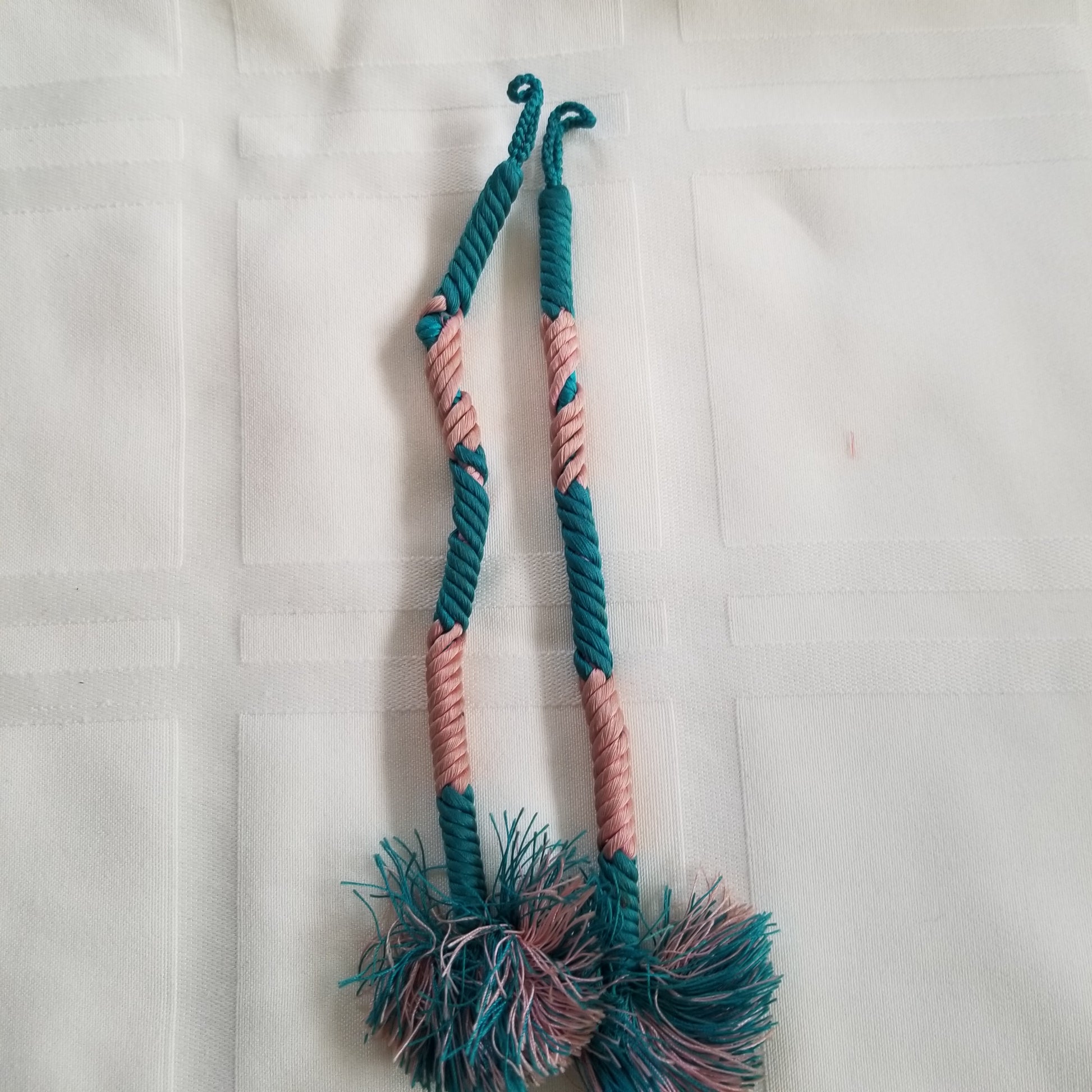 This listing is for a pair of vintage himo ties in an unusual braid: twisted bundles of teal and pink silk is wrapped around a core bundle of more teal threads. Big fluffy tassels at each end. The wrapping has become a bit look around the center - see photos - but this would be hidden when tied.