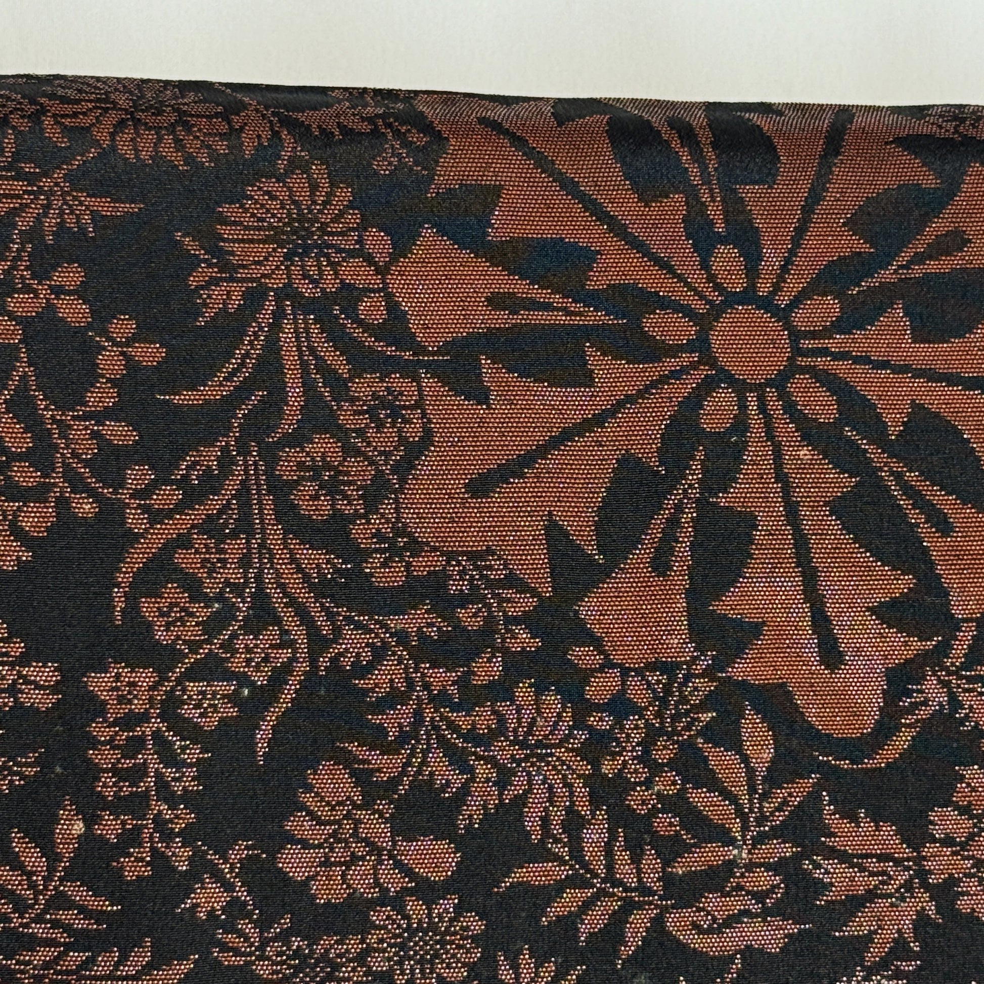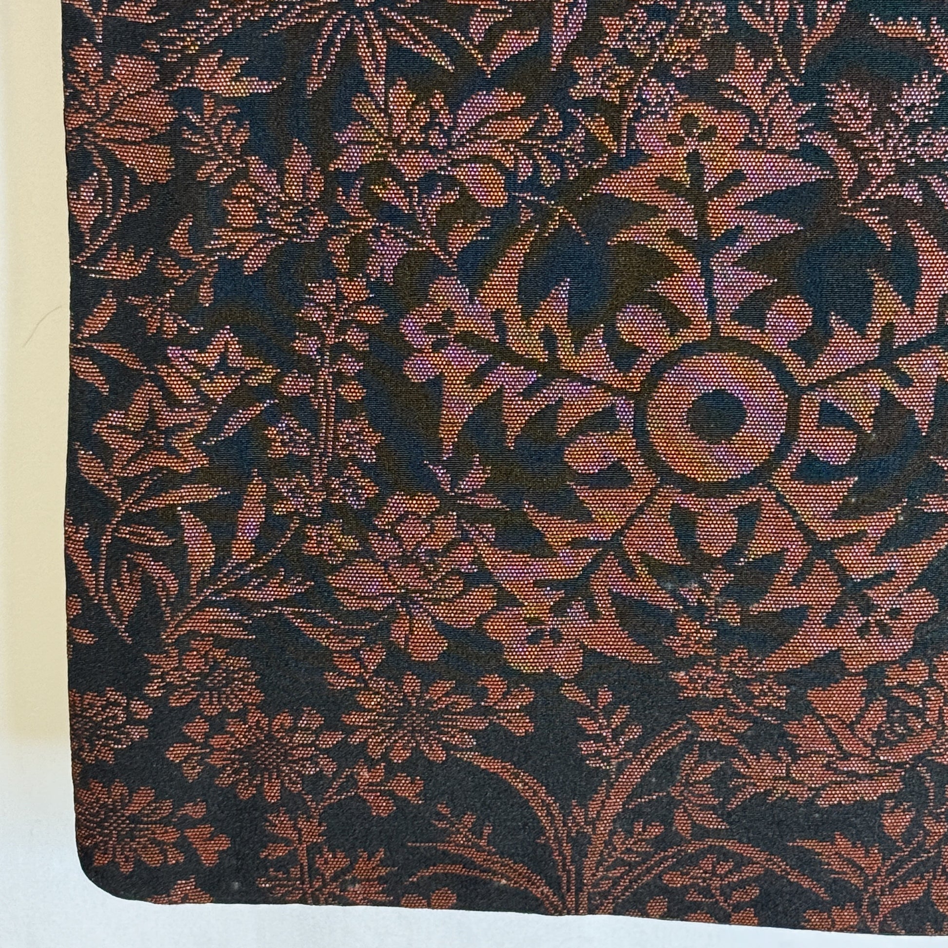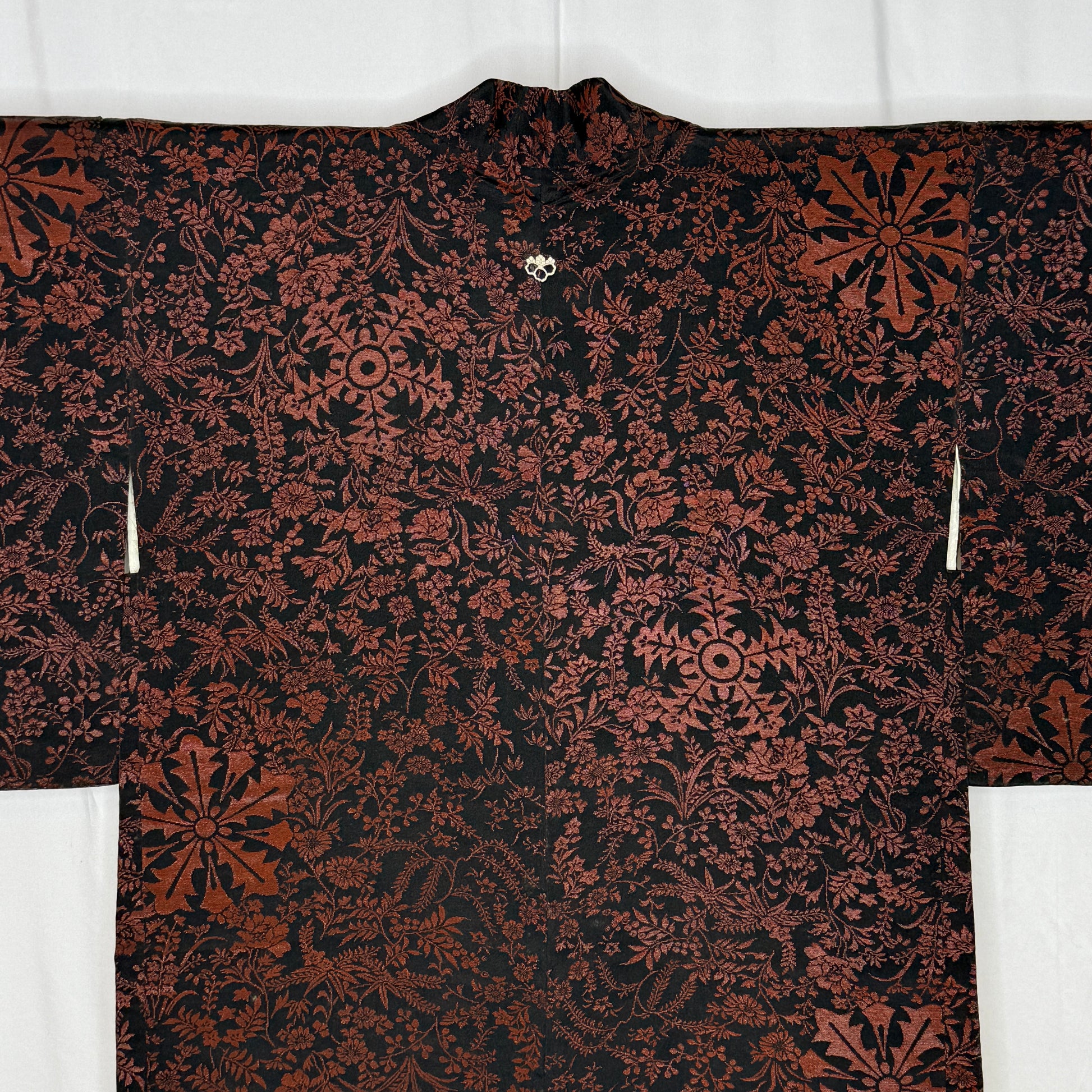 This haori glows with a quiet luxury emanating from its rich urushi lacquered threads. The entire jacket shimmers with an intricate floral landscape in deep brick red, against black silk, creating a warm metallic effect that reveals new details with every shift of light. Delicate blooms, curling vines, and stylized botanical forms emerge from the black background, giving the haori a lush, tapestry-like presence. At the neck is a paulownia crest, a symbol of dignity and auspicious beginnings.