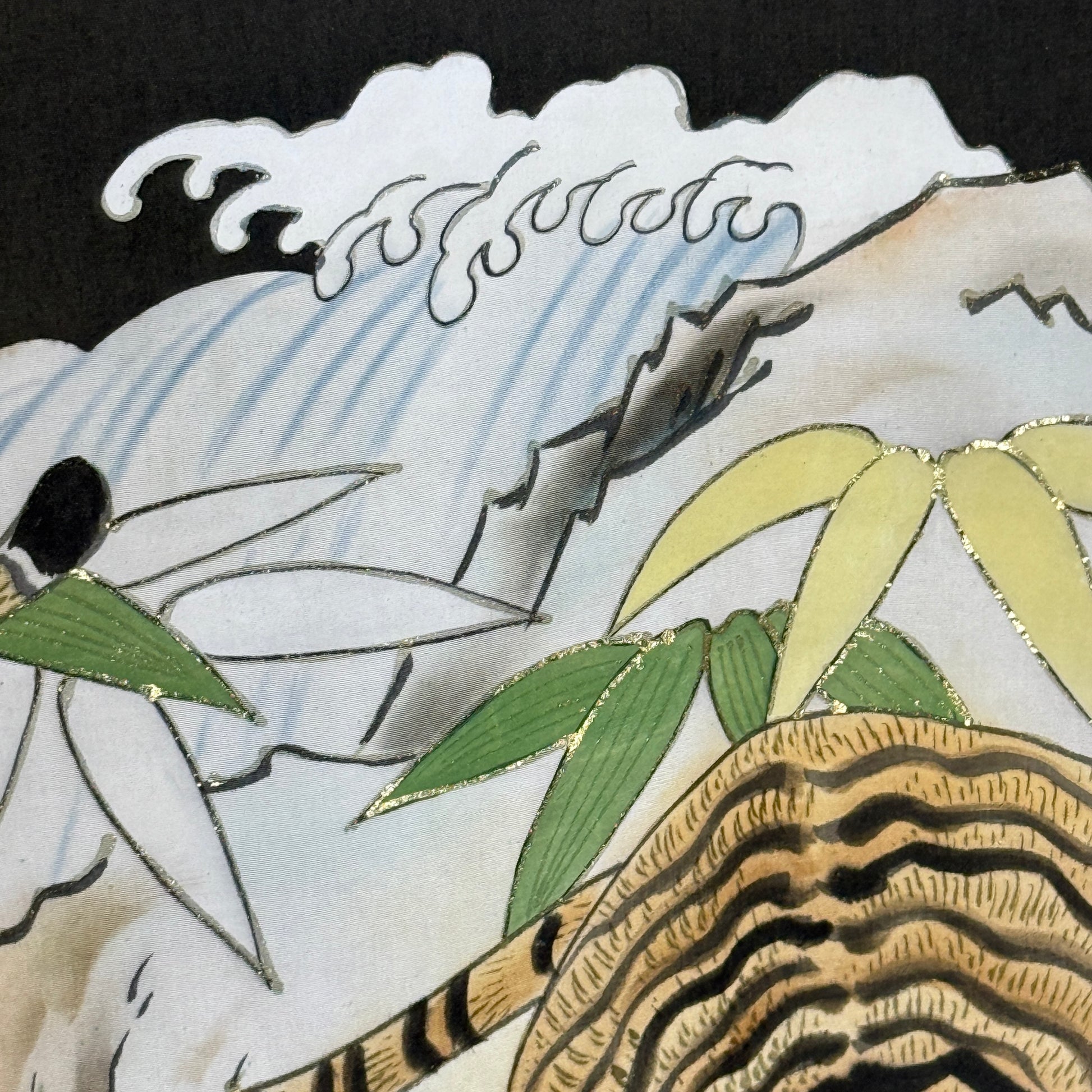This kimono features a large tiger strolling along the rocks and bamboo at the bottom of a waterfall. Many artistic details - including small areas of embroidery on the teeth and claws - add to the interest and desirability of the display. The blue water motif continues from the back onto the front.
