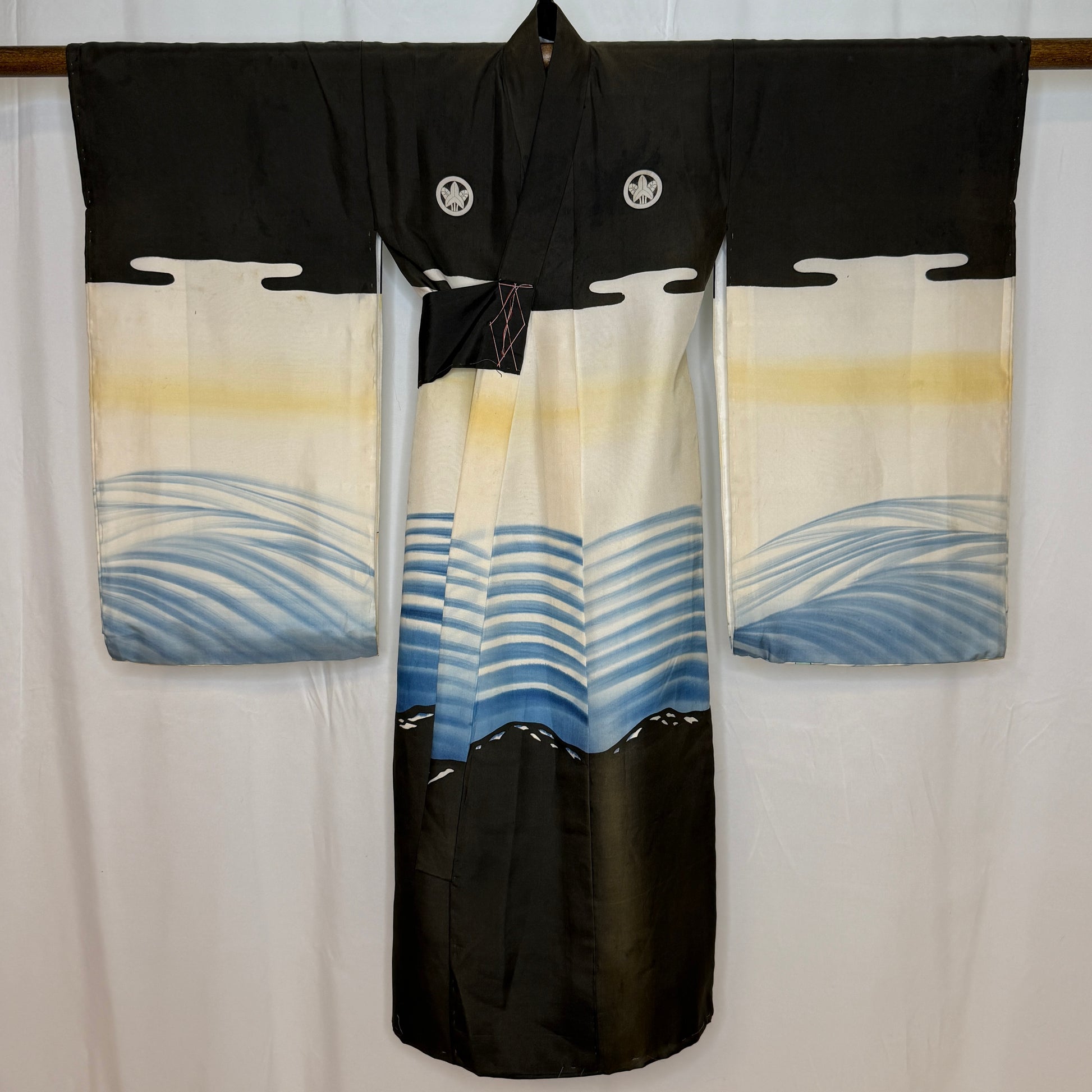 This listing is for a vintage Japanese boy's formal kimono, called a miyamairi. These ceremonial kimono typically have a dramatic design in the center and are framed across the top and bottom with a dark band of color. Family crests are typically stenciled across the top section. This style of kimono makes a beautiful display and though they are wearable, they are not play clothes and are not likely to survive the play life of an active child! See video below for more about how these are worn at festivals.