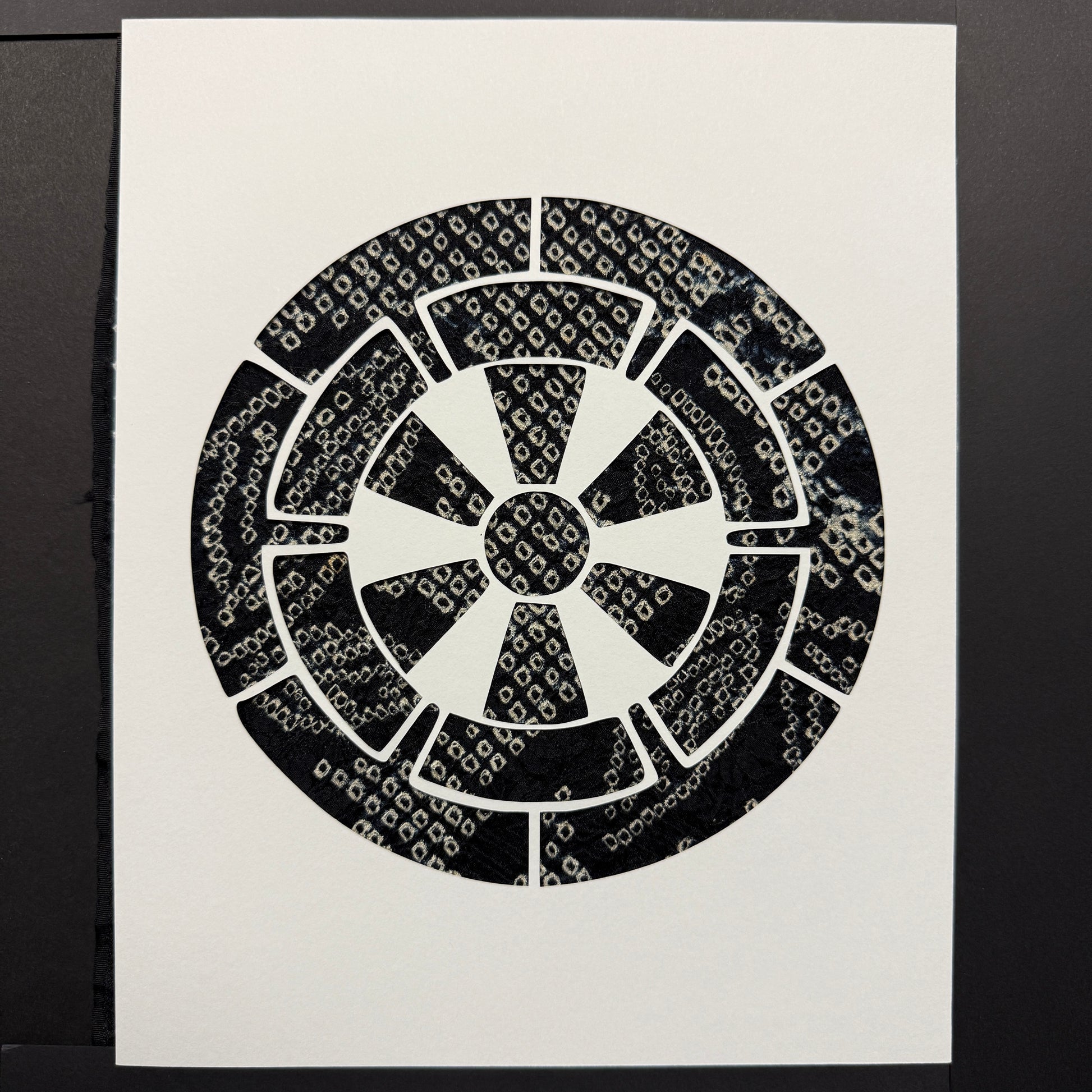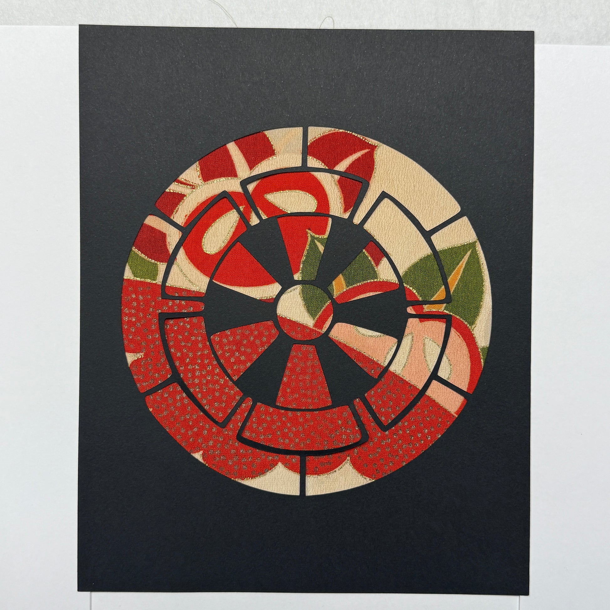 Photos show examples of how a carefully chosen piece of kimono fabric placed behind the crest adds depth, texture, and cultural resonance, allowing the colors and patterns of the textile to animate the design and transform into a layered work of art.