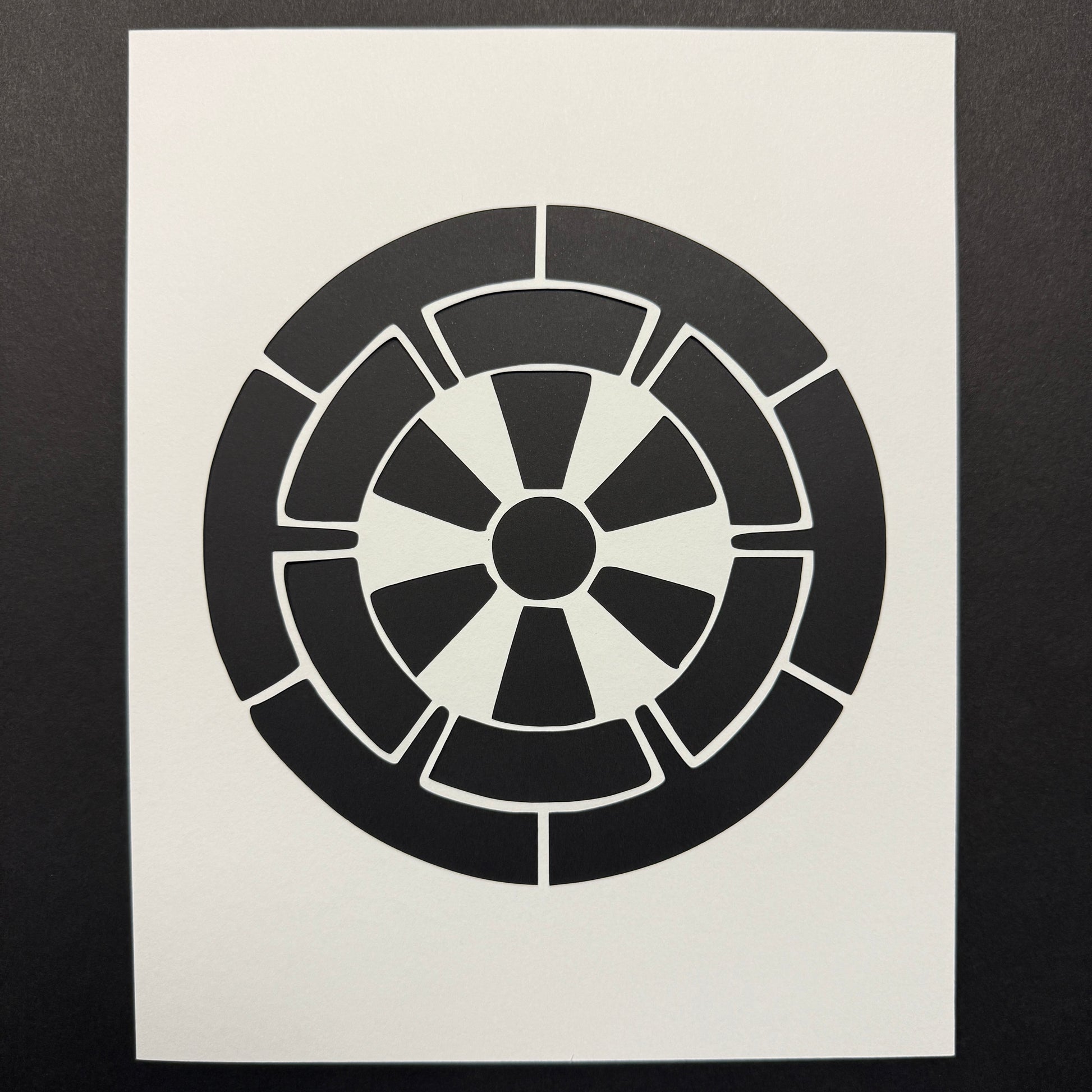 This is a wheel crest (kuruma-mon), a bold geometric emblem symbolizing movement, continuity, and the turning of fate, with roots in both aristocratic culture and Buddhist imagery. Its clean, radial design conveys balance and enduring strength, making it a timeless motif used by multiple samurai families across Japan.