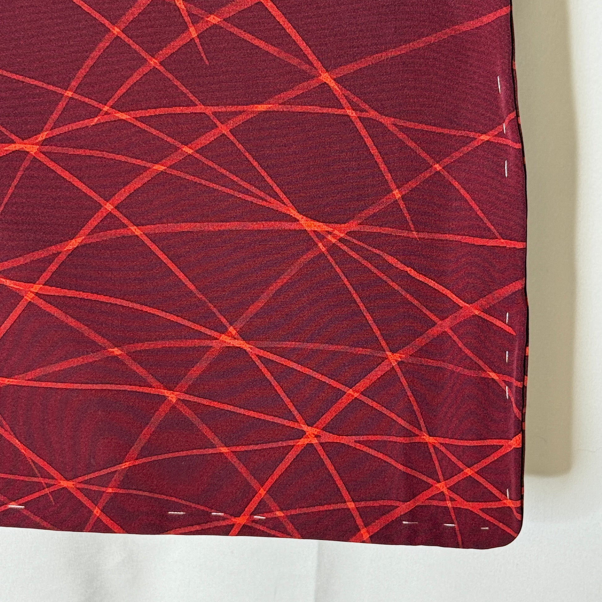 This vintage jacket makes an instant impact with its deep wine-red background covered in energetic, overlapping lighter red lines that create an abstract web across the entire surface. The pattern feels like windblown reeds or grasses, giving the fabric movement and depth. Look closely to see the artistic design touch as the grasses grow more densely from the bottom of the garment.