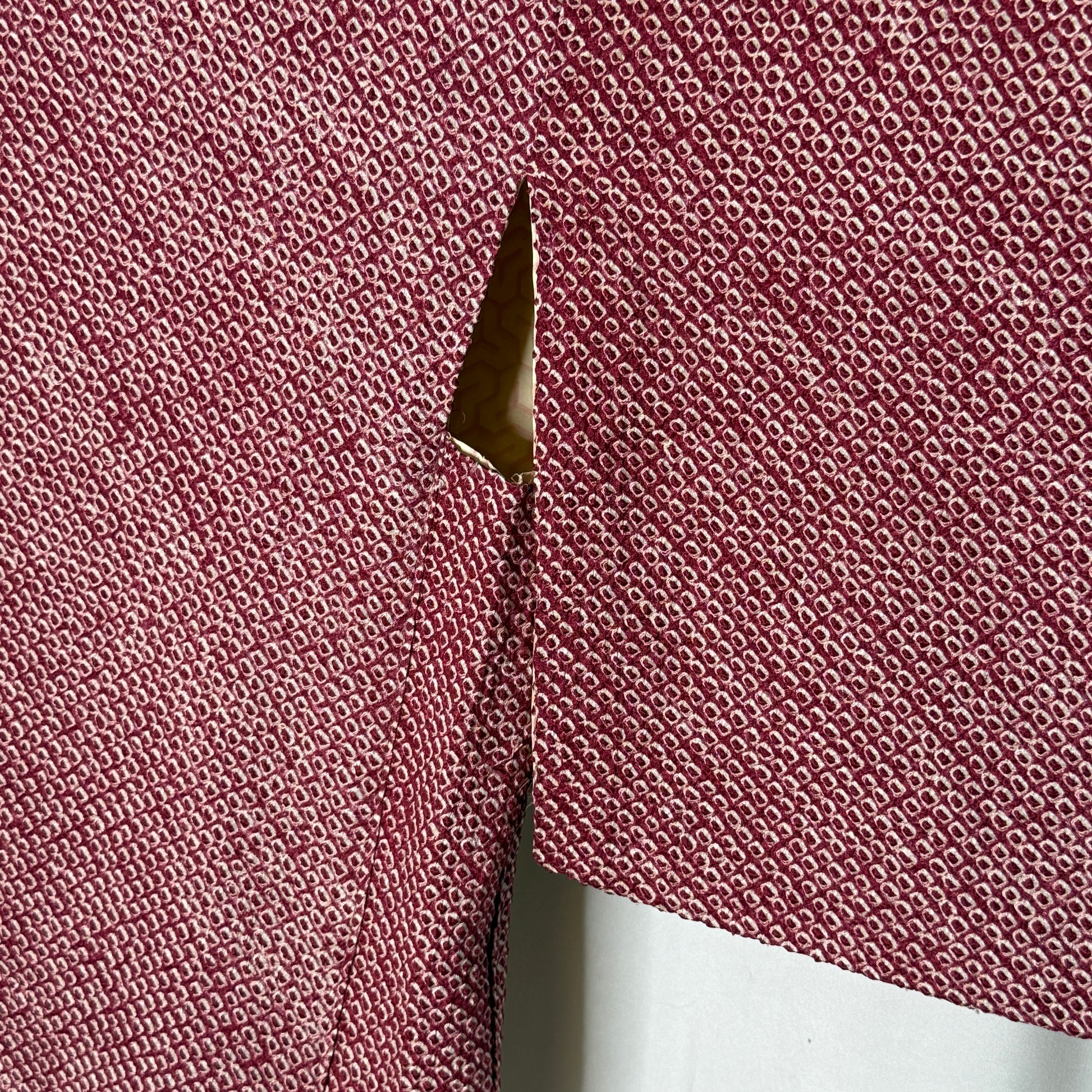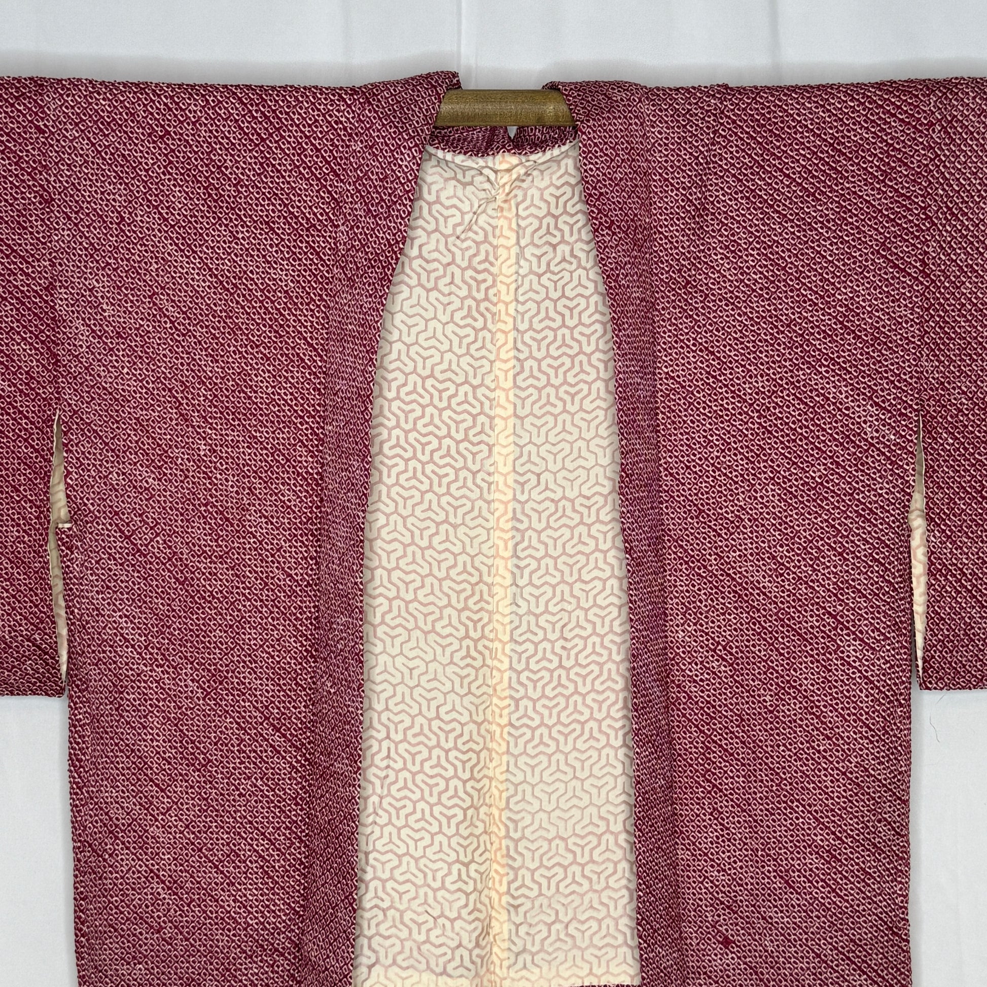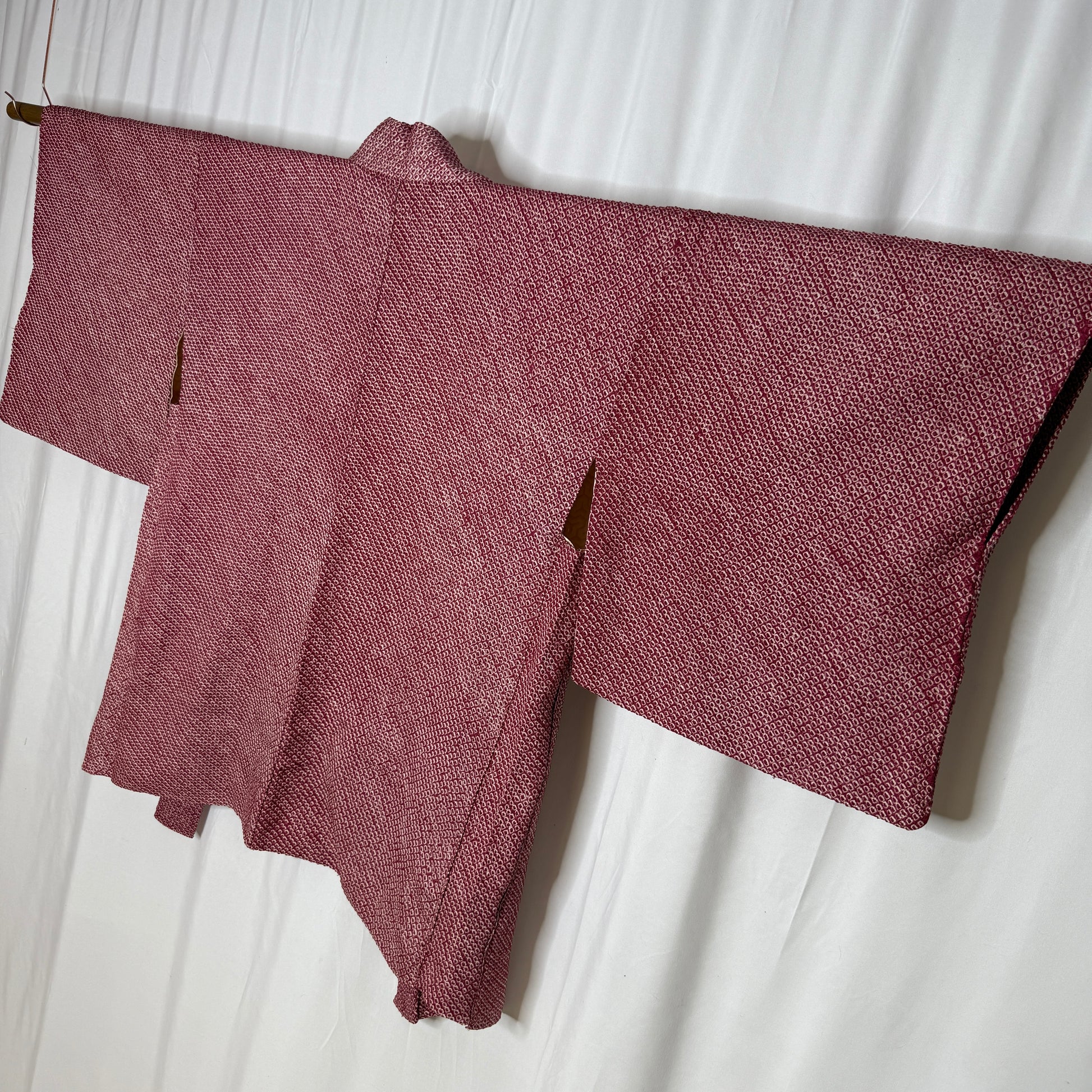 This vibrant vintage haori is covered in an intricate field of kanoko shibori, the iconic fawn-spot resist pattern that gives the surface a soft, dotted pucker texture. The deep berry red silk is punctuated with hundreds of tiny dots that create a beautifully irregular rhythm, almost like jumbled rice kernels or graphic pixels. From afar it forms a rich, dimensional landscape that feels warm, nostalgic, and unmistakably Japanese.