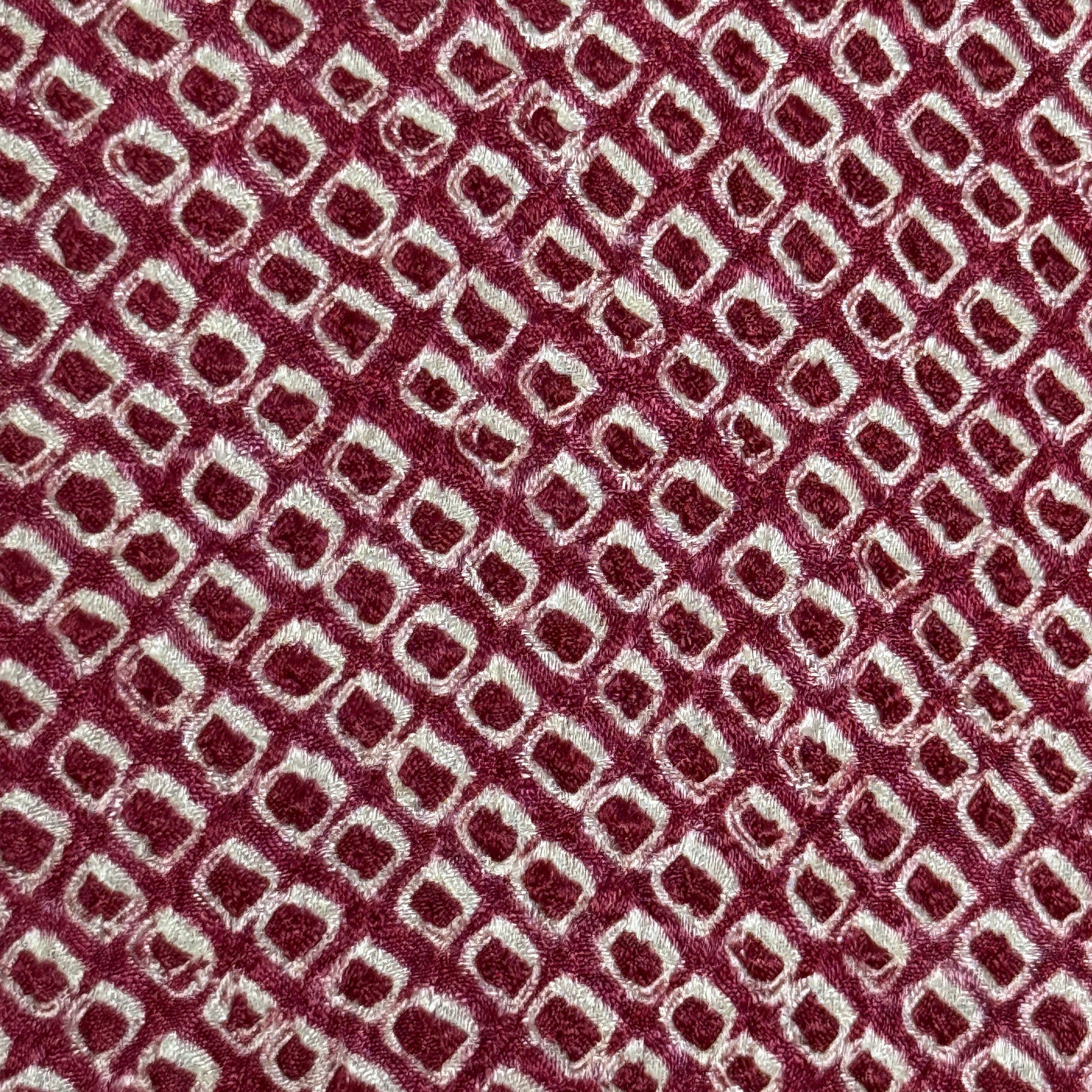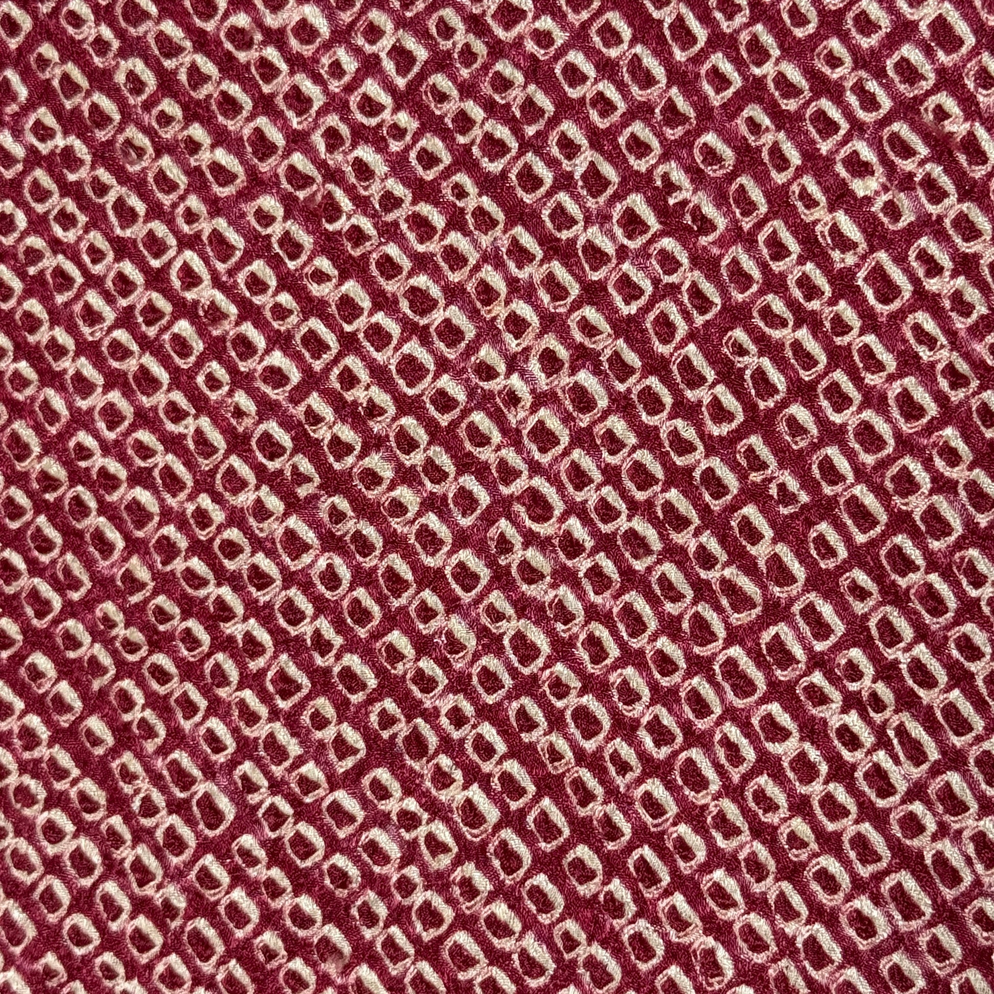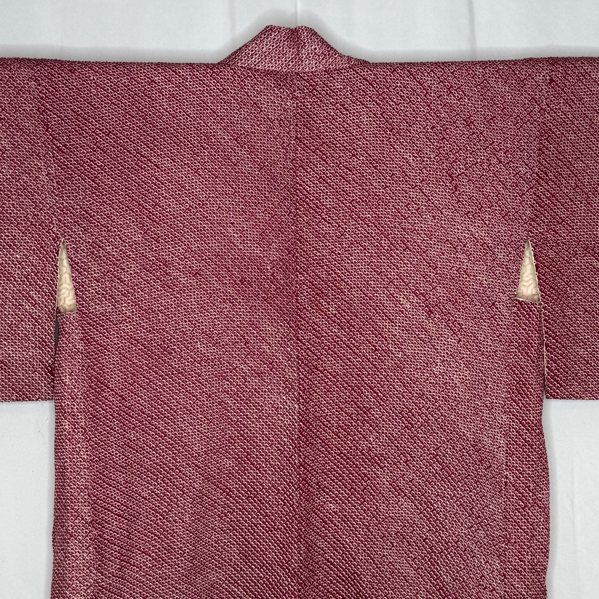 This vibrant vintage haori is covered in an intricate field of kanoko shibori, the iconic fawn-spot resist pattern that gives the surface a soft, dotted pucker texture. The deep berry red silk is punctuated with hundreds of tiny dots that create a beautifully irregular rhythm, almost like jumbled rice kernels or graphic pixels. From afar it forms a rich, dimensional landscape that feels warm, nostalgic, and unmistakably Japanese.