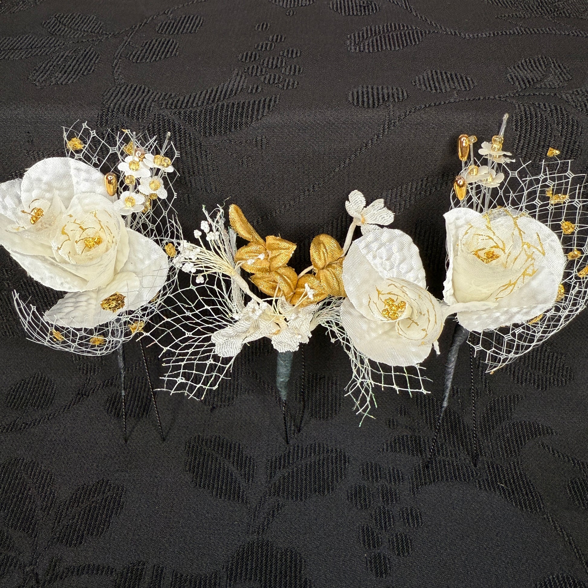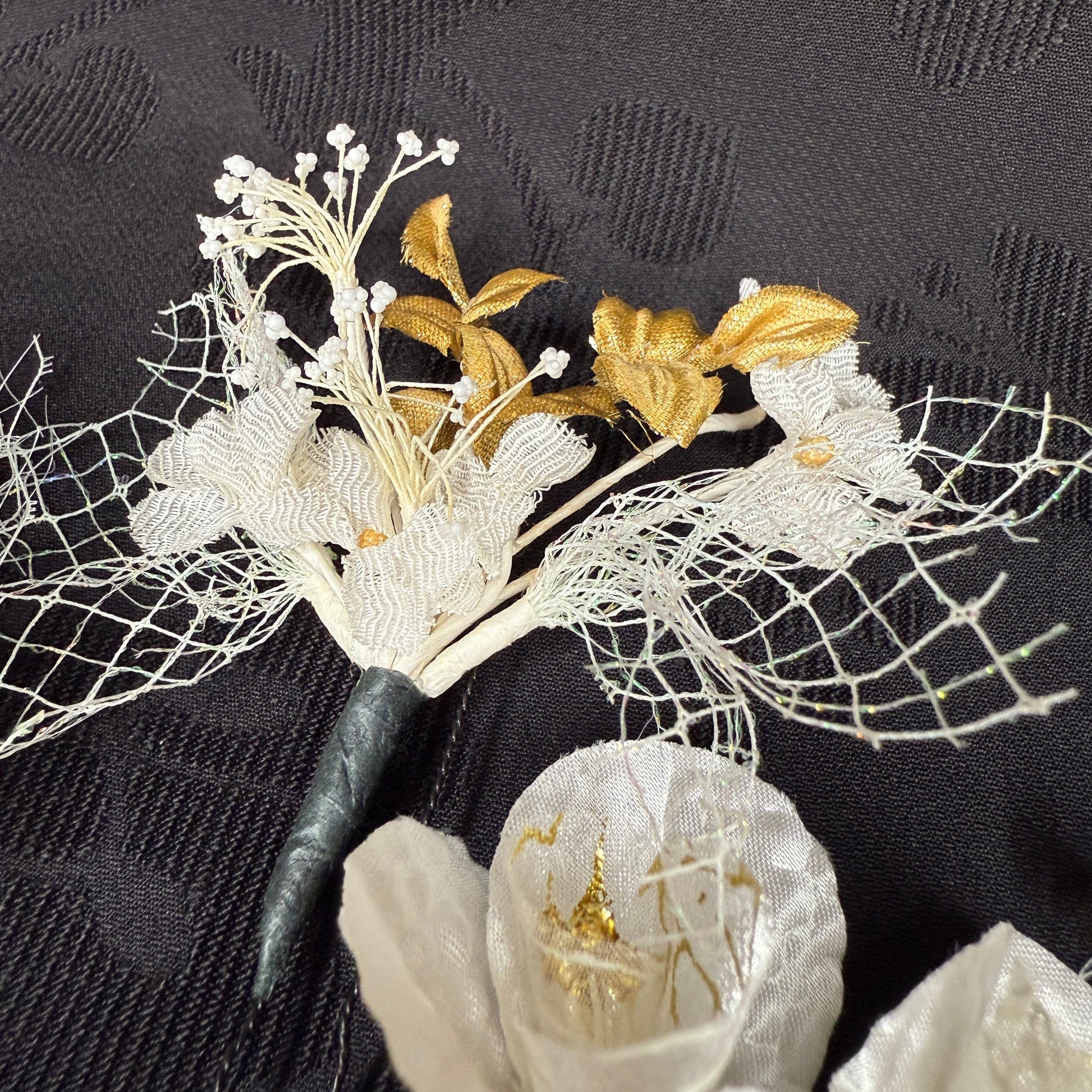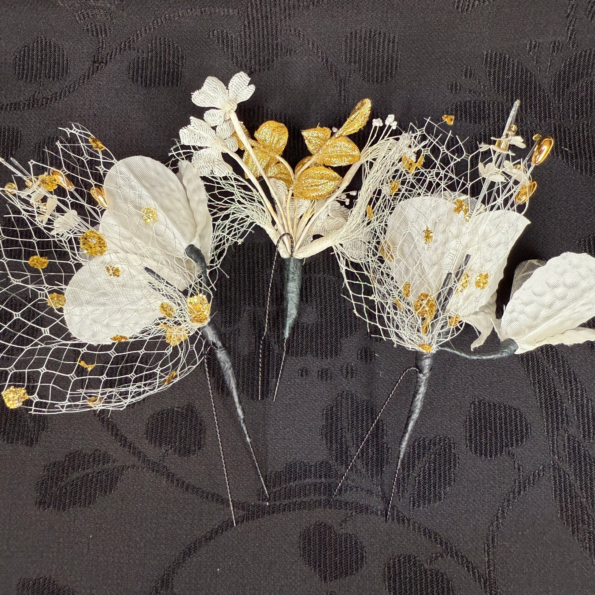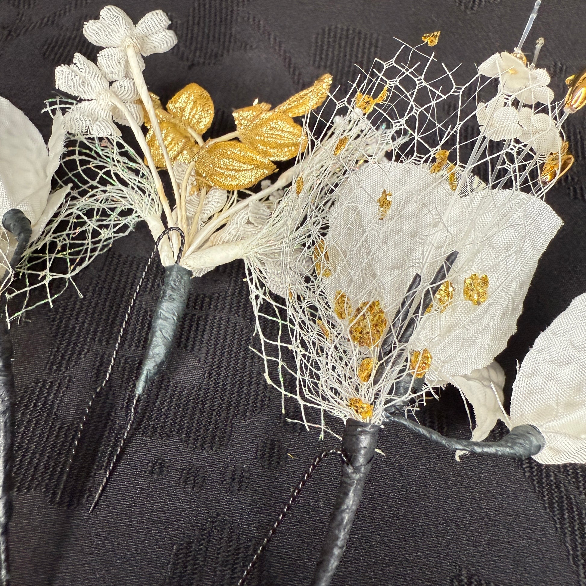 This vintage Japanese kanzashi hair pin set of three glows with bridal elegance! The roses, dusted with golden accents and encircled by delicate netting, suggest the shimmer of sunlight caught in morning frost. Clusters of gold-tipped buds and tiny blossoms add texture and dimension, balancing refinement with a hint of theatrical charm. A blend of timeless romance and opulent artistry.