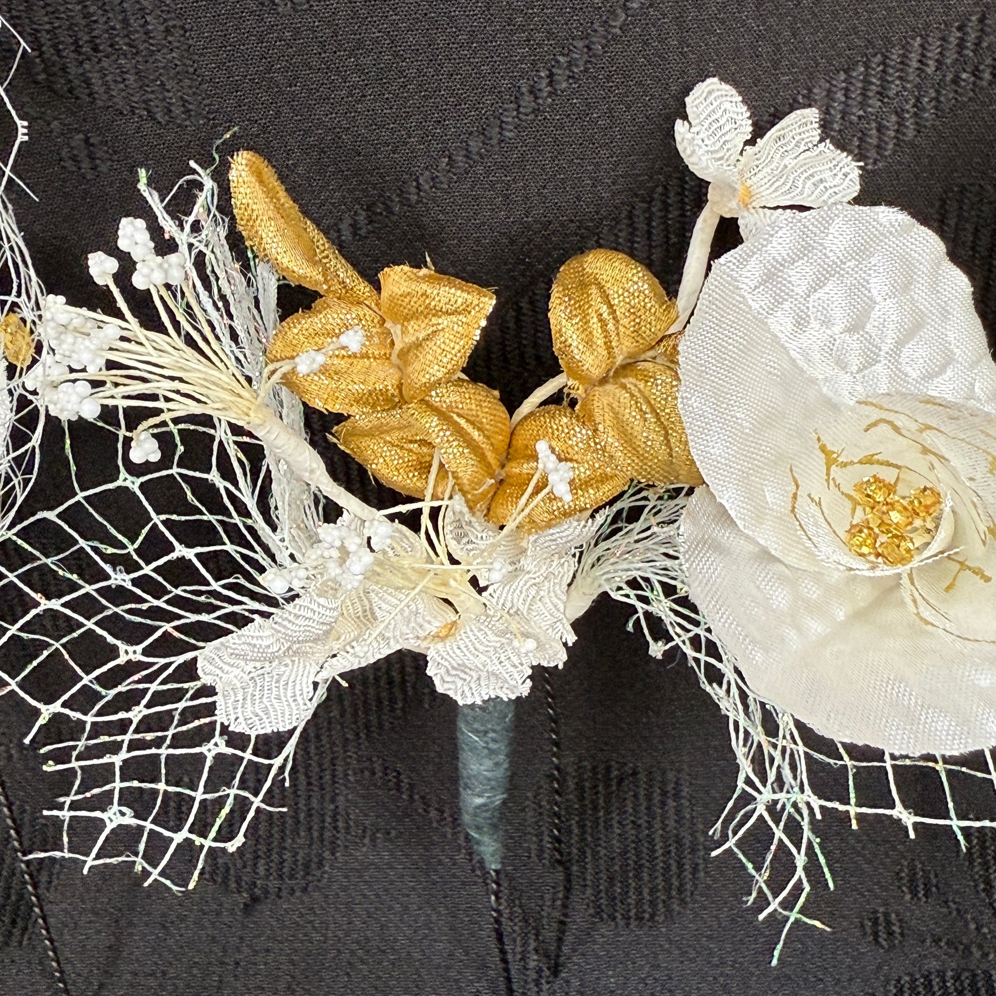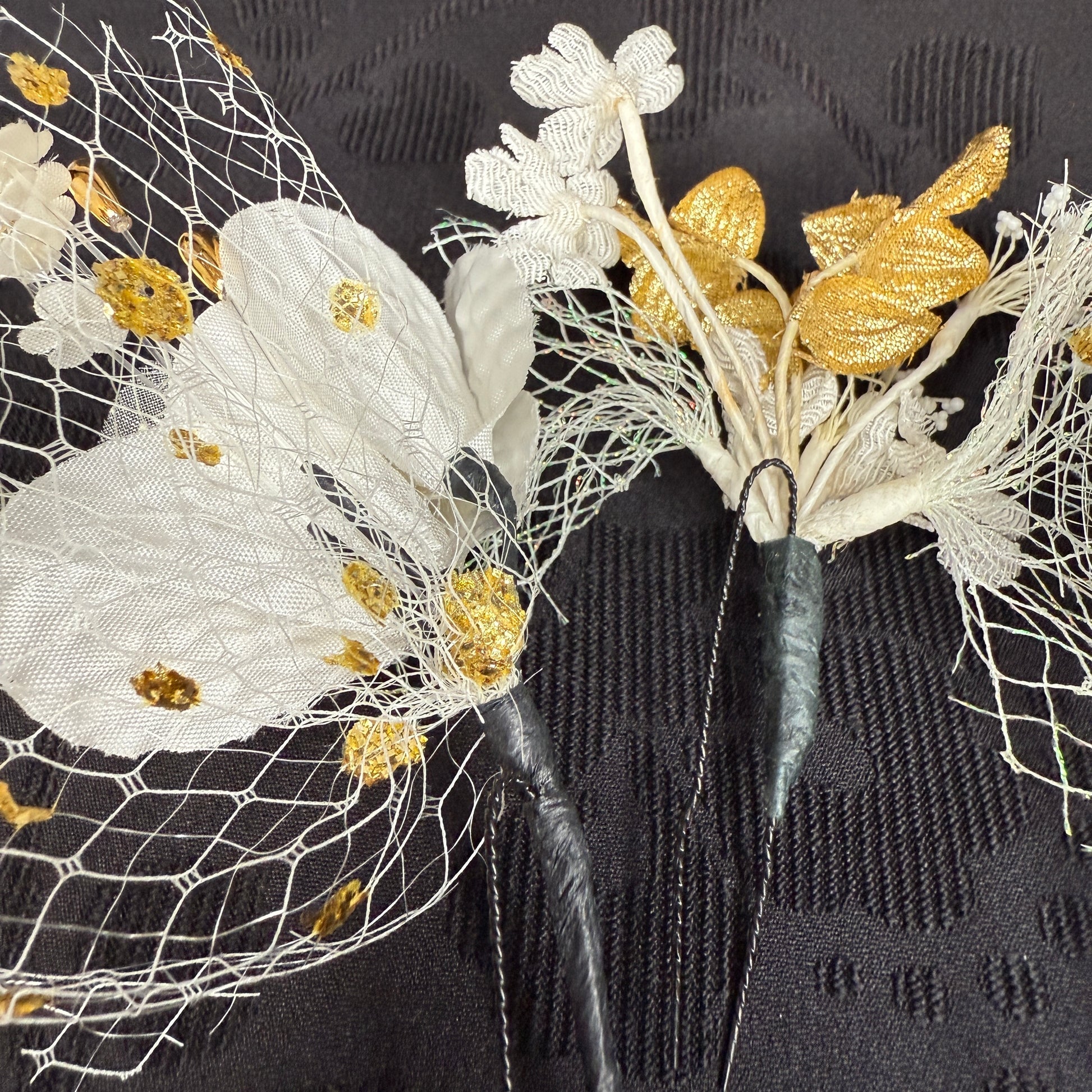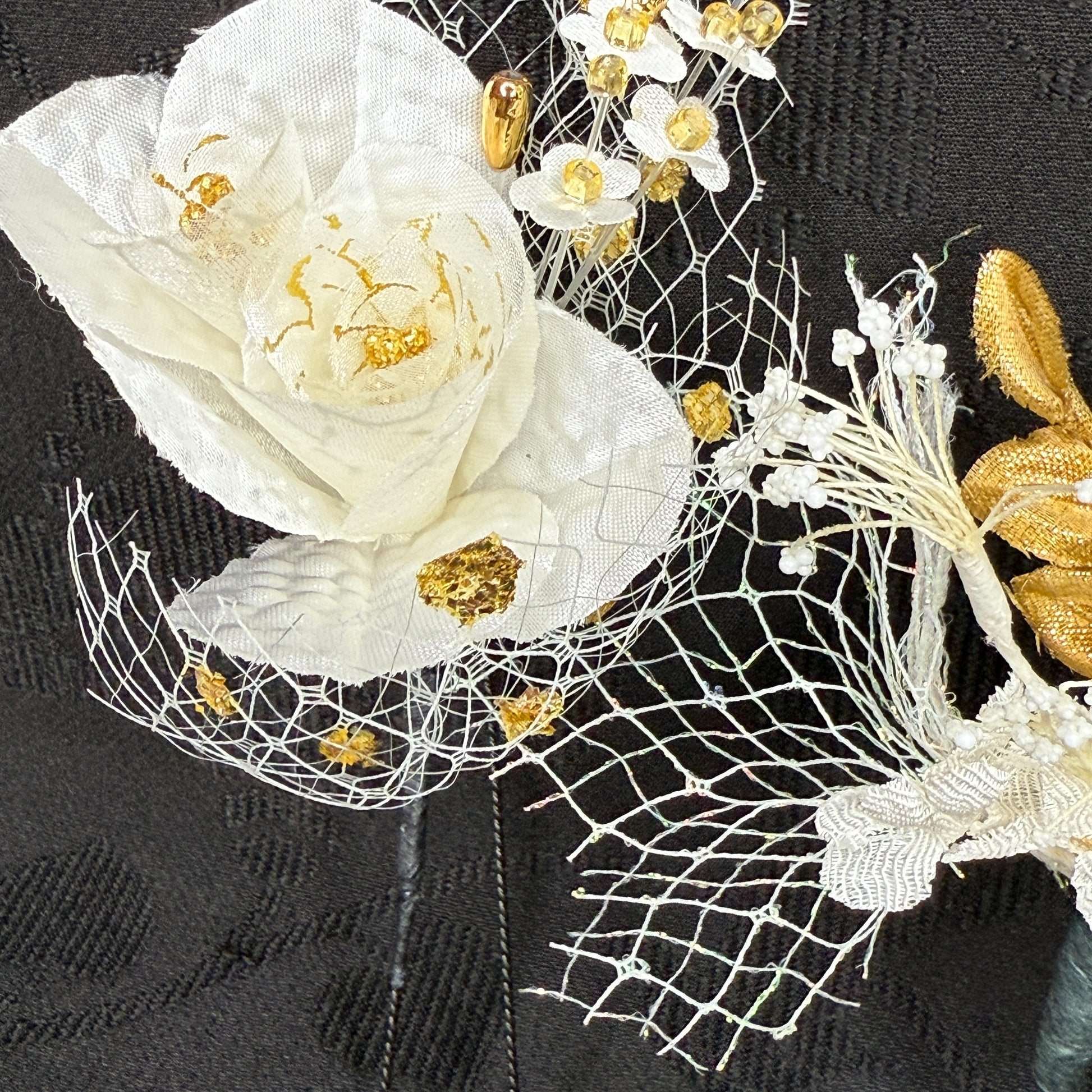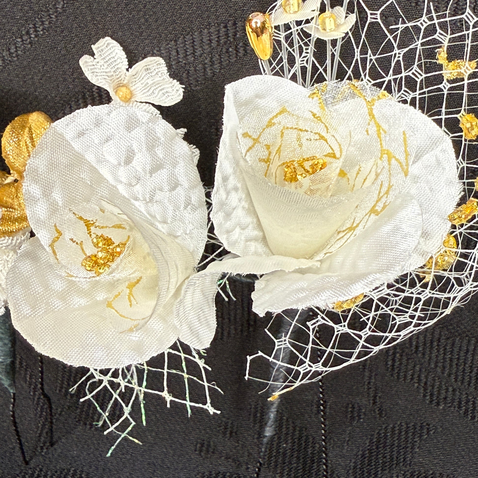 This vintage Japanese kanzashi hair pin set of three glows with bridal elegance! The roses, dusted with golden accents and encircled by delicate netting, suggest the shimmer of sunlight caught in morning frost. Clusters of gold-tipped buds and tiny blossoms add texture and dimension, balancing refinement with a hint of theatrical charm. A blend of timeless romance and opulent artistry.