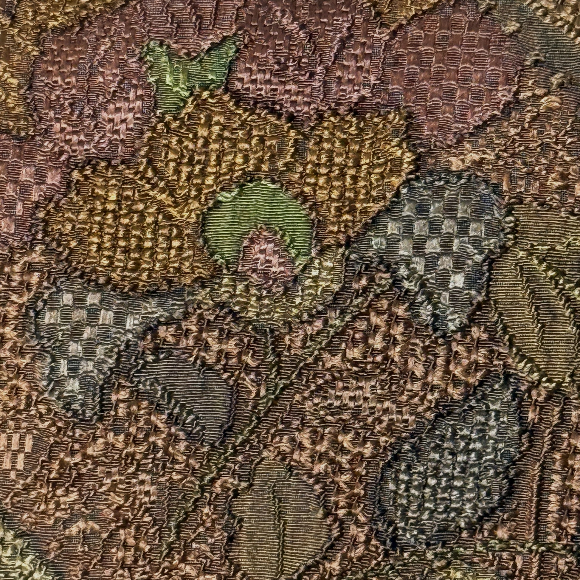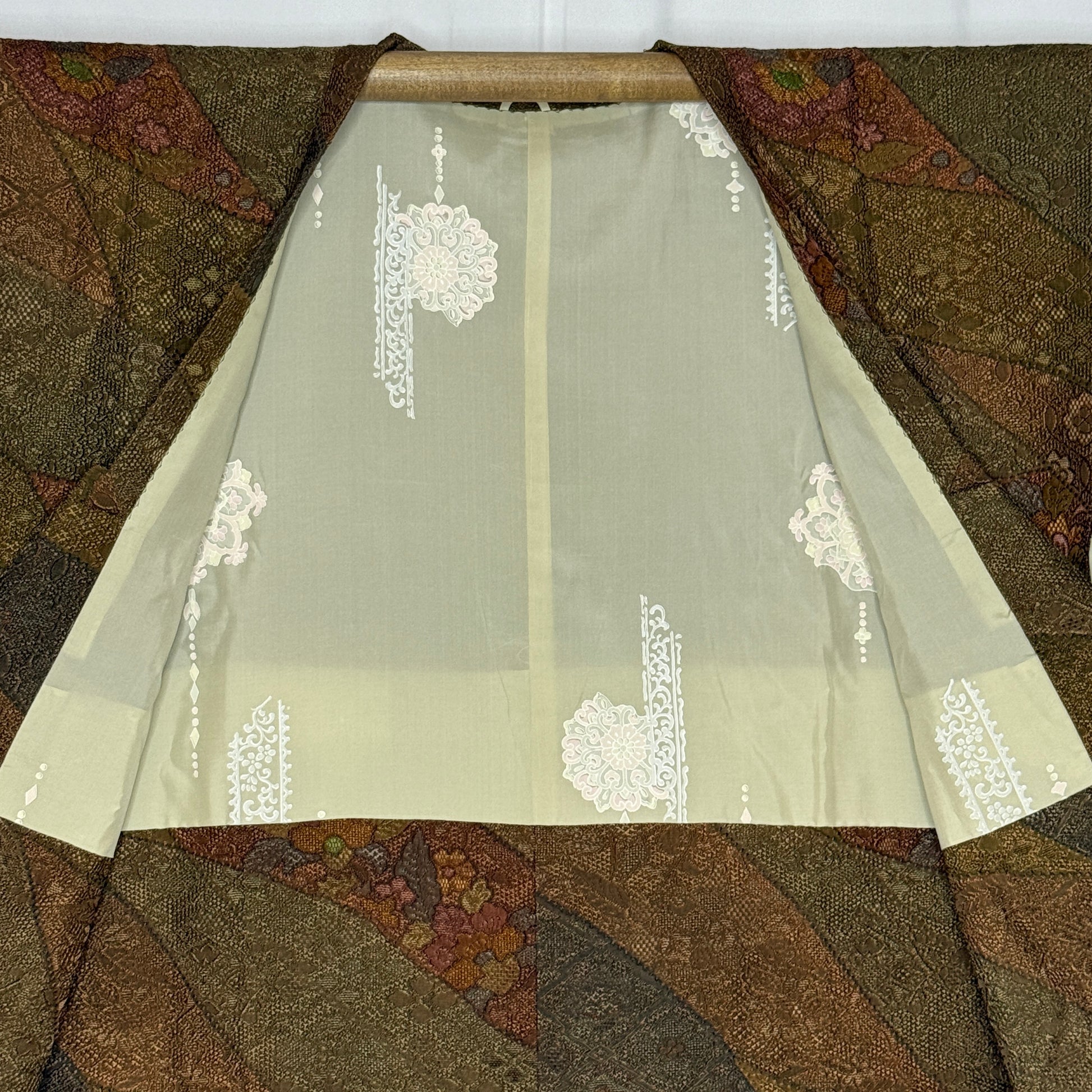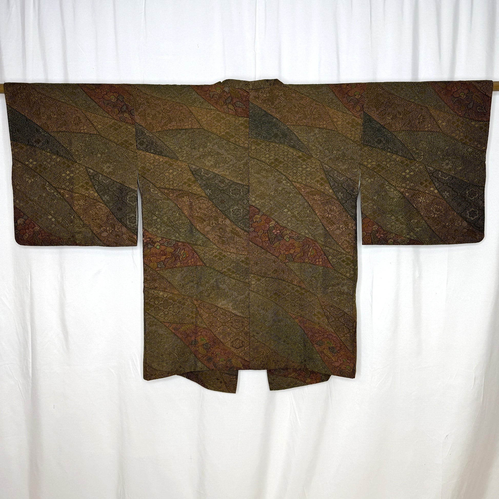 This vintage jacket feels like walking through a warm autumn forest, its entire surface covered in layered waves that blend earthy greens, bronzes, and muted golds with hints of soft floral motifs. Each sweeping panel is filled with intricate woven textures that mimic stitched patchwork, giving the garment incredible dimension and a handcrafted presence. Look closely to see the detailed florals in the raised threads that shimmer gently with movement. This is a beautiful textile for someone who appreciates depth, subtle colors, or traditional Japanese weaving.