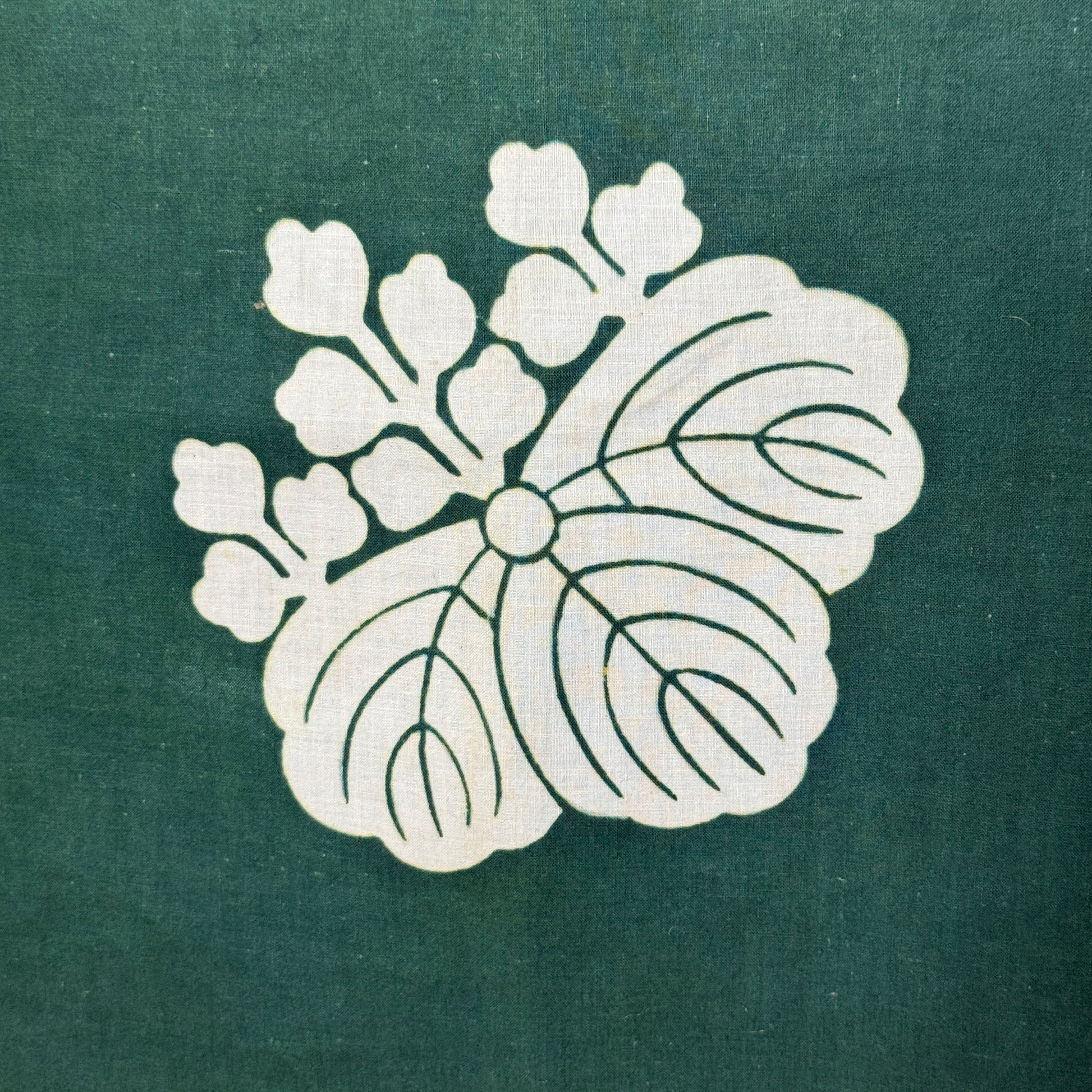 This vintage furoshiki has a rich forest green tone that immediately feels warm and grounded, the kind of textile that carries quiet history and everyday beauty. The white characters in one corner read Yamada, a classic family name, while the other corner features the elegant kiri crest, a stylized paulownia emblem traditionally associated with auspicious wishes and refinement.