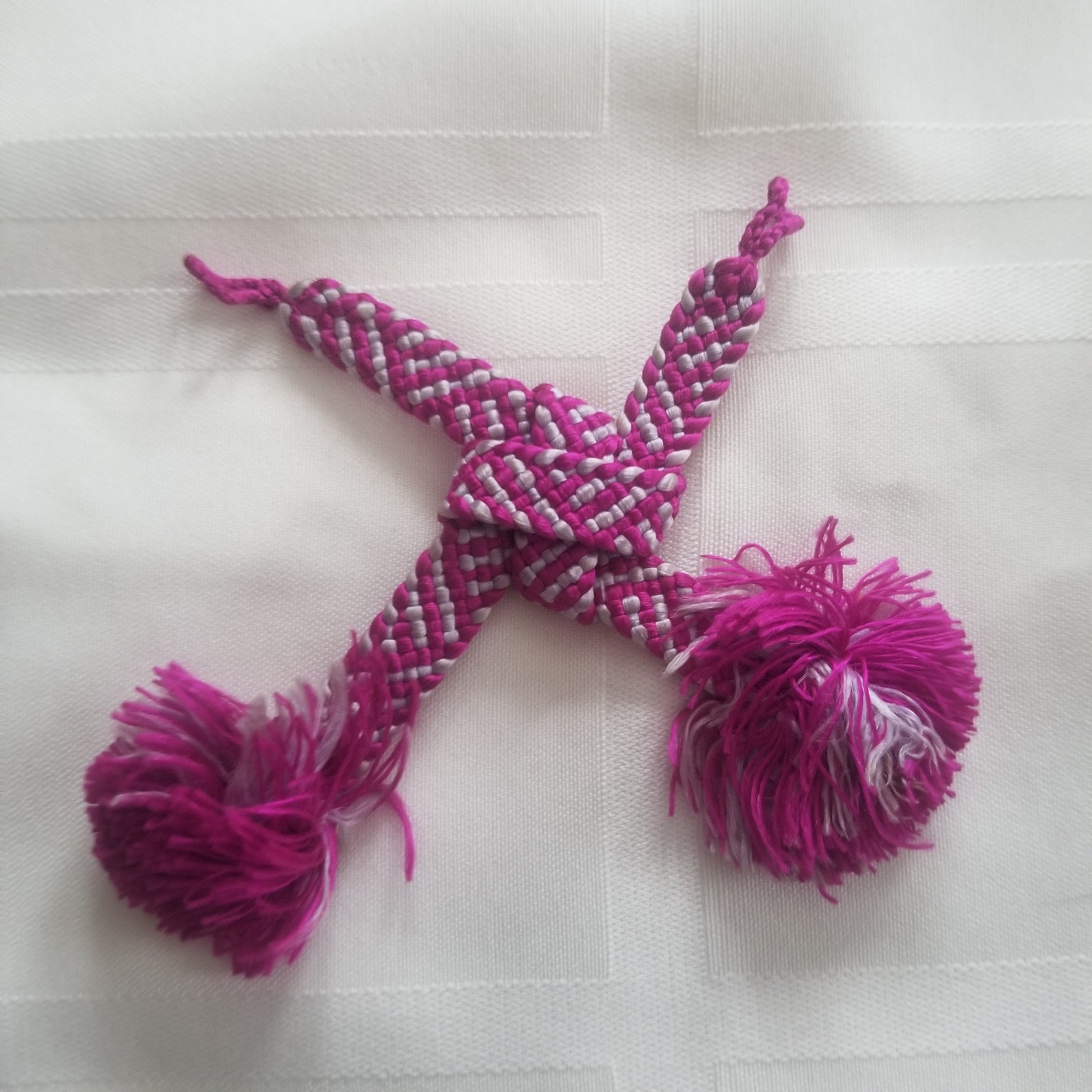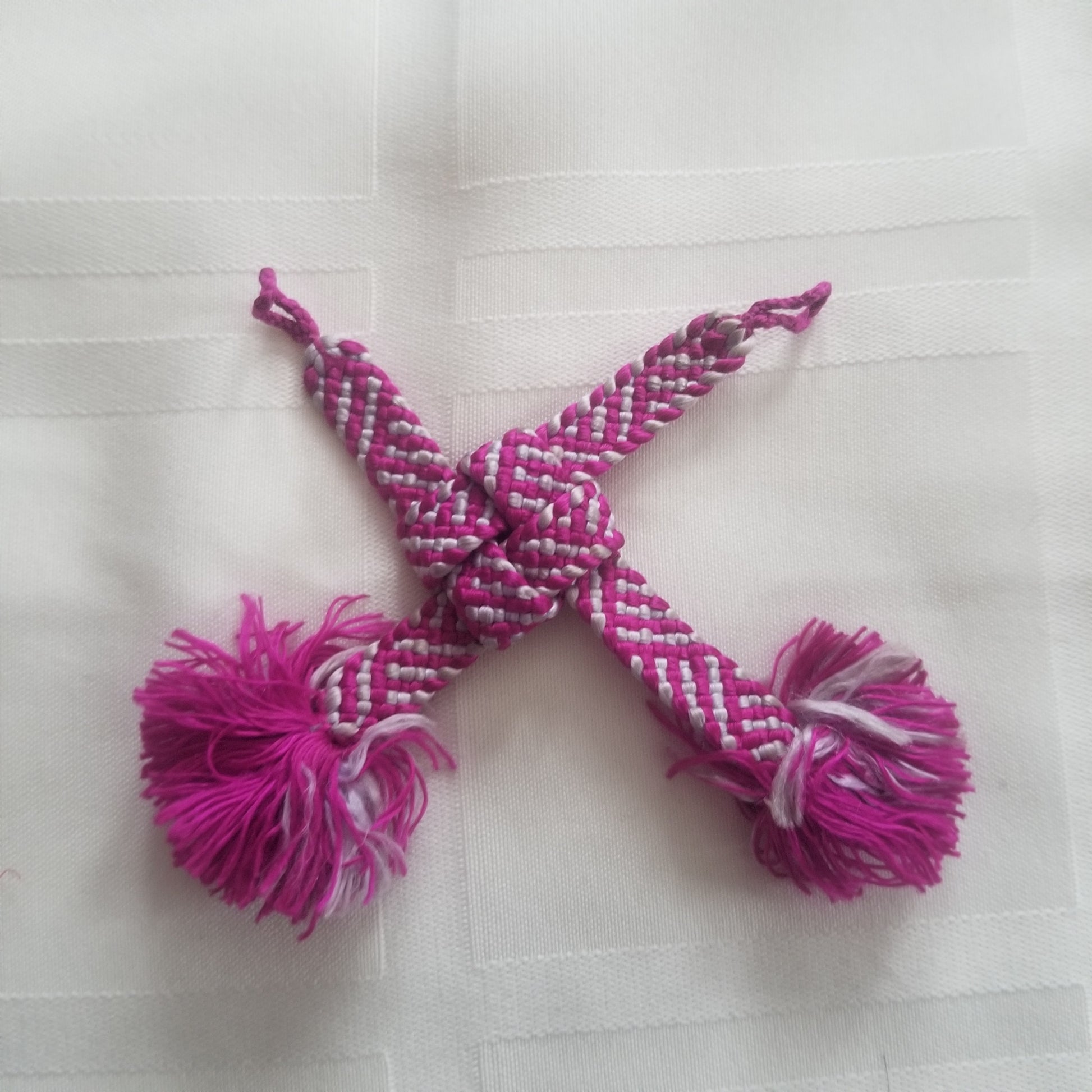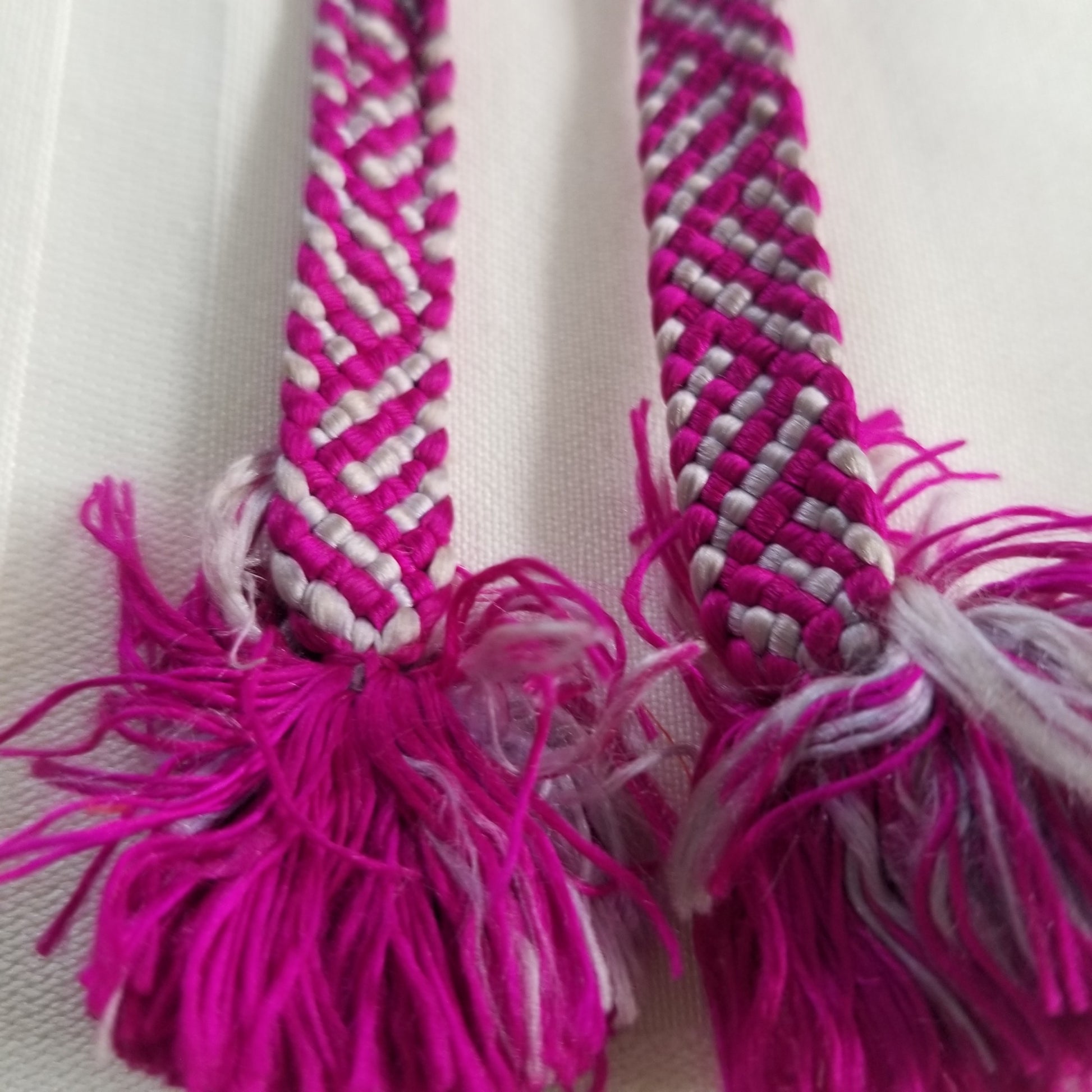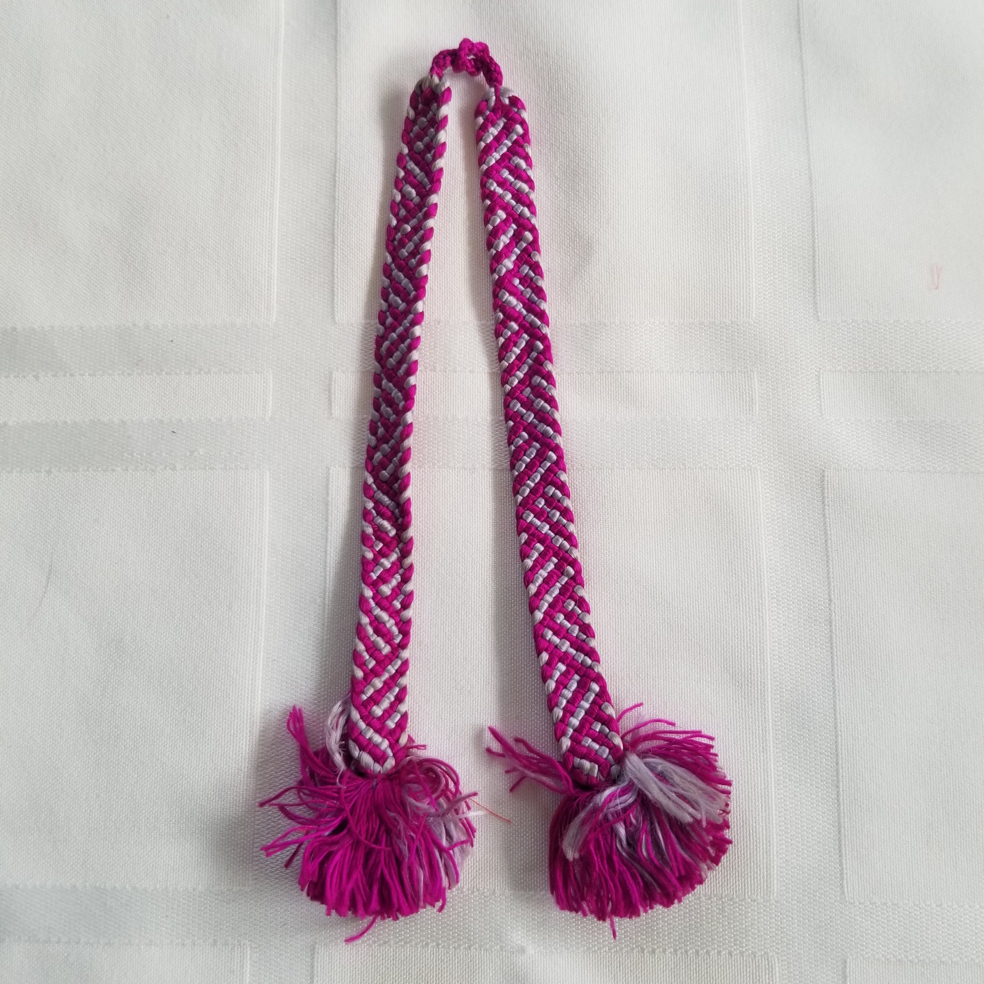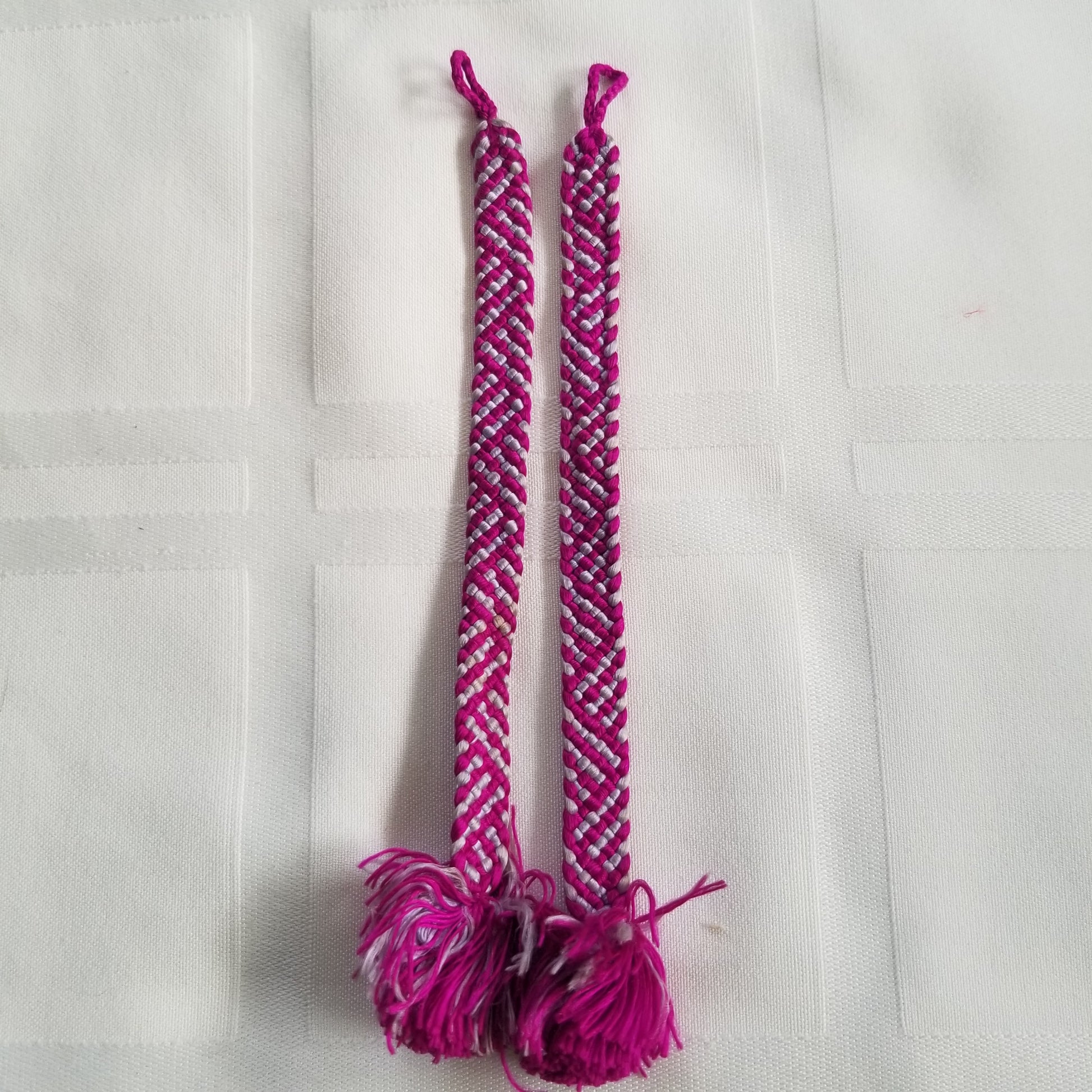 This listing is for a pair of vintage himo ties in a bright magenta and silvery gray combination. The woven, flat braid alternates the colors so well that the patterning can change depending on the angle of view. Big fluffy tassels at each end.