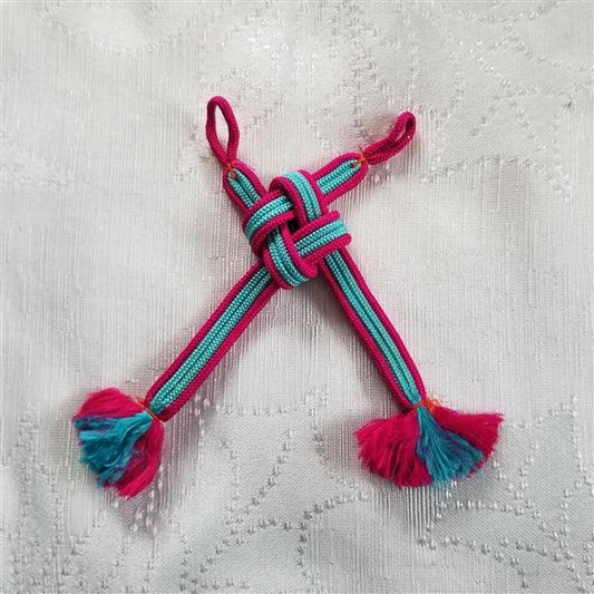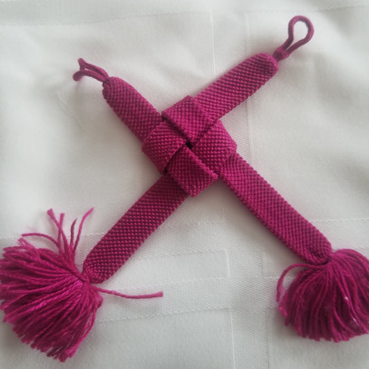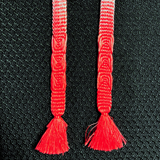 Haori himo are short, woven ties that can be attached to the little loops you'll find on either inside seam of a haori collar as an optional accessory. Aside from their original use, haori himo make great accent pieces for textile art, bookmarks, key chains, zipper pulls, and more... Occasionally we find beaded or jeweled versions that are designed for a more formal look.