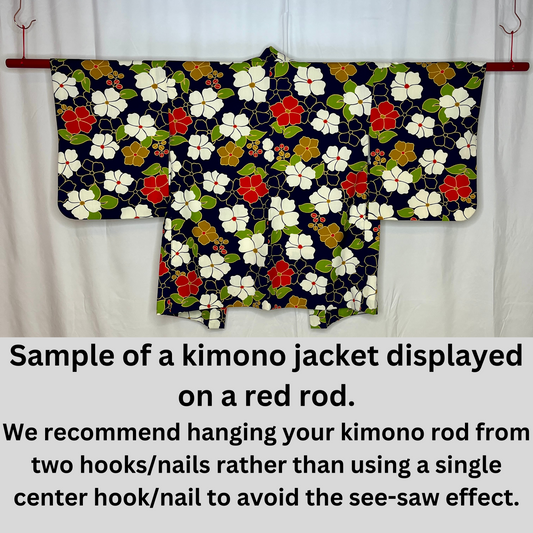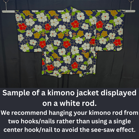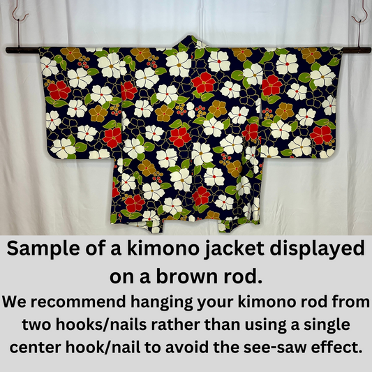 Our wooden Display Rods can showcase the beauty and elegance of a kimono or obi as you hang it at your home or office. Our 60” kimono display hangers can be used for quilts, sari, rugs, or any other textile treasure you love. Our short (30”) display rods are perfect for obi or more narrow tapestries.