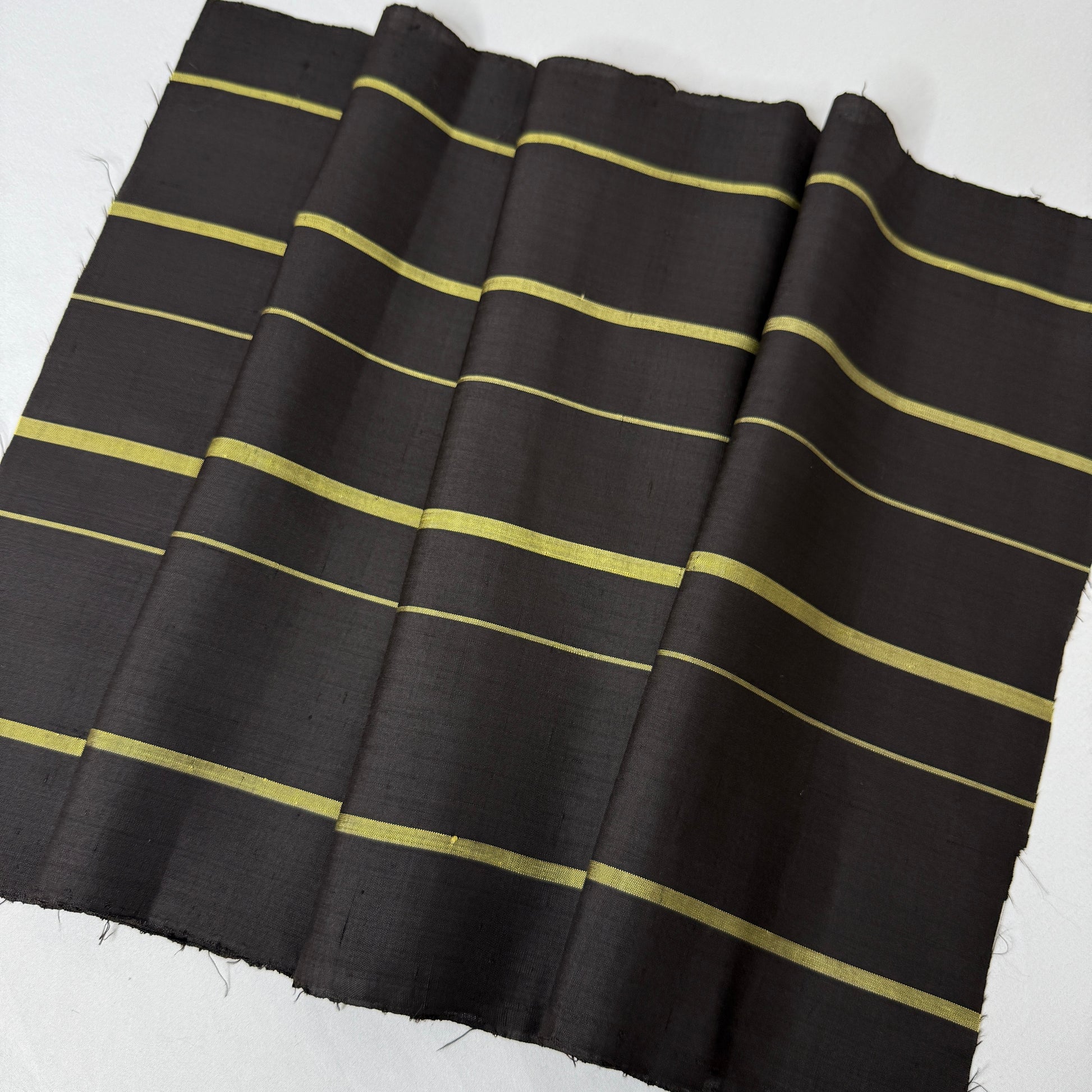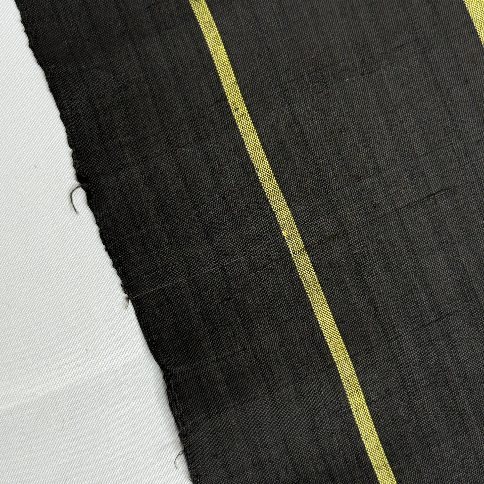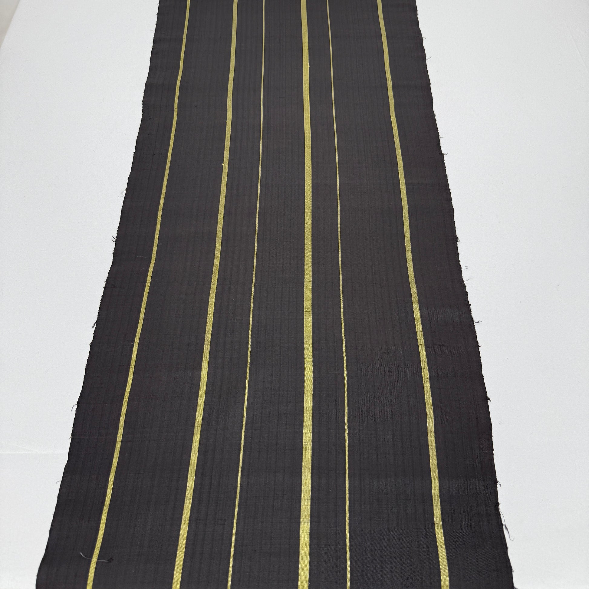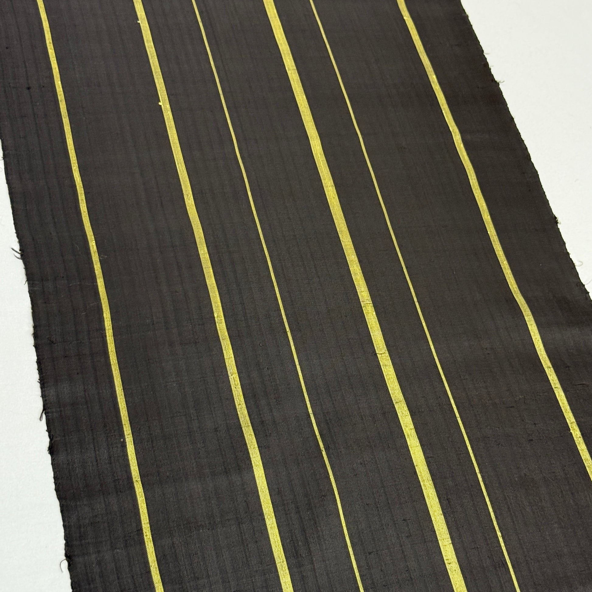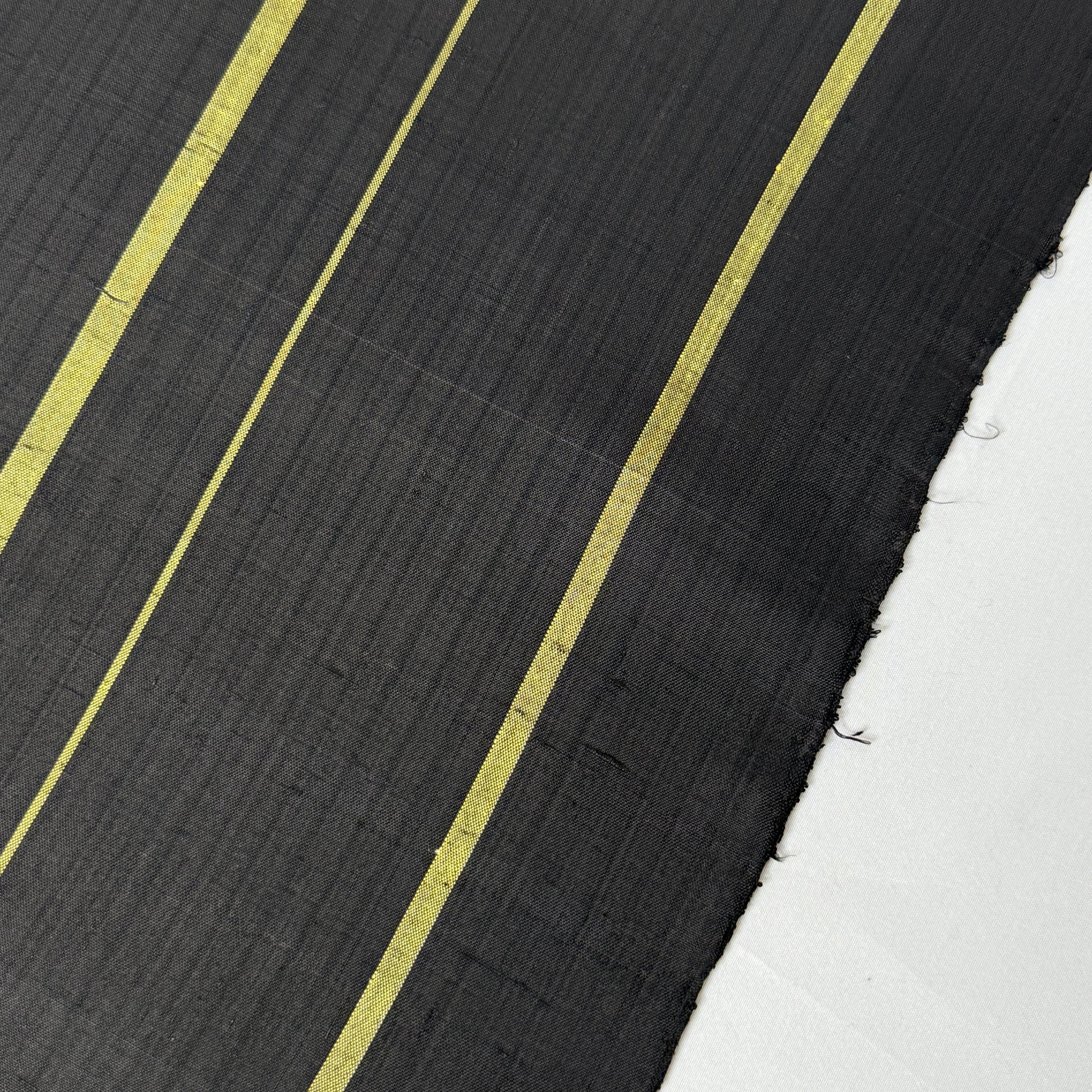 This kimono fabric features thin yellow-gold stripes against a black background. The stripes run vertically and are varied in width, suggesting slender, moonlit bamboo stalks against a midnight sky. The weave has a slight nubby texture giving an organic feel to the fabric.