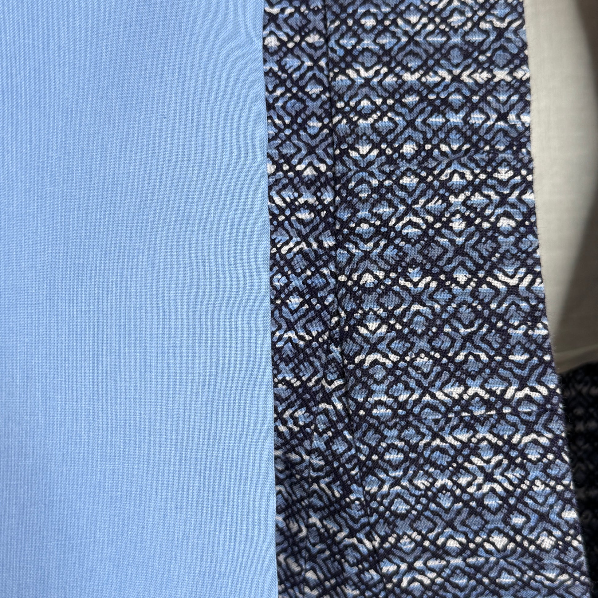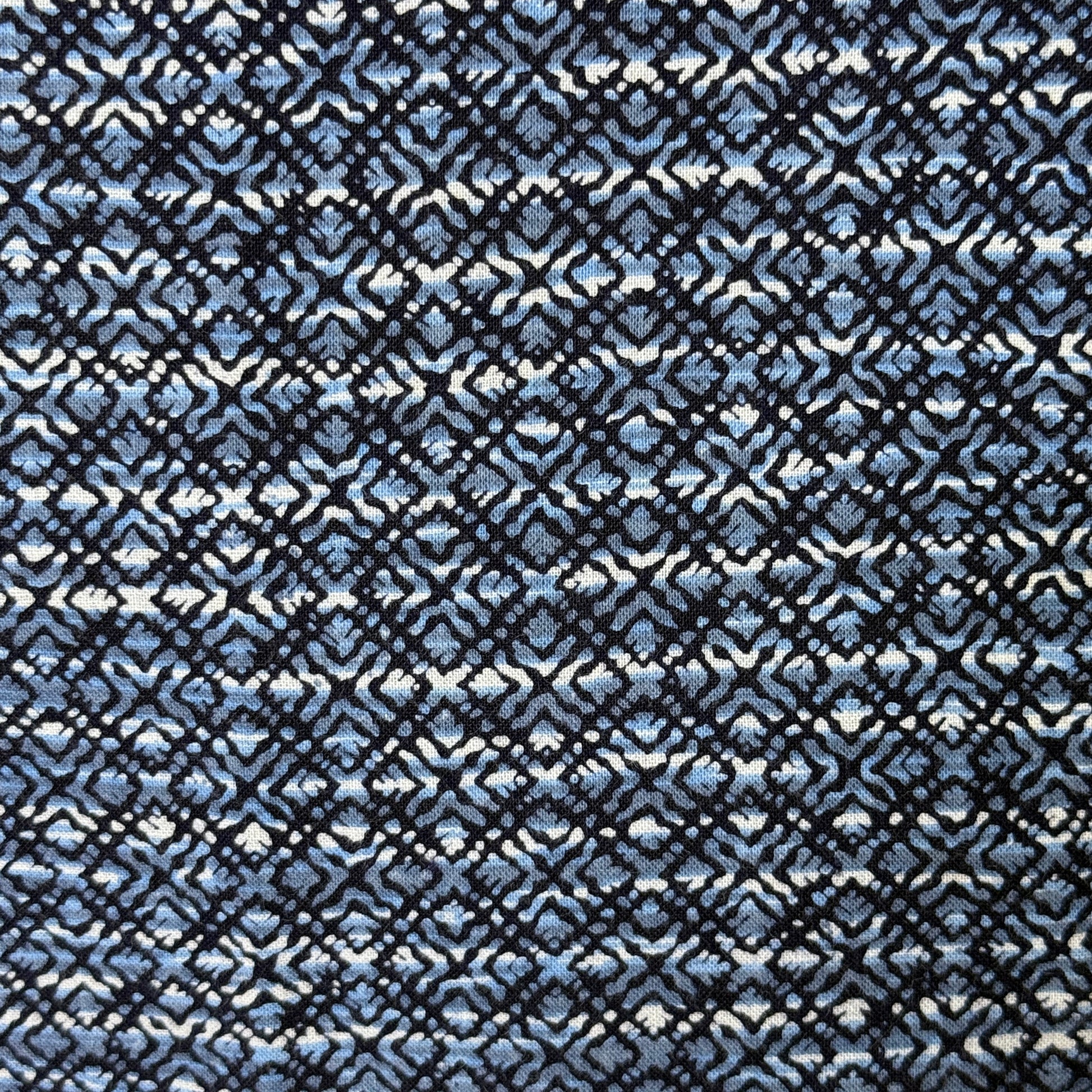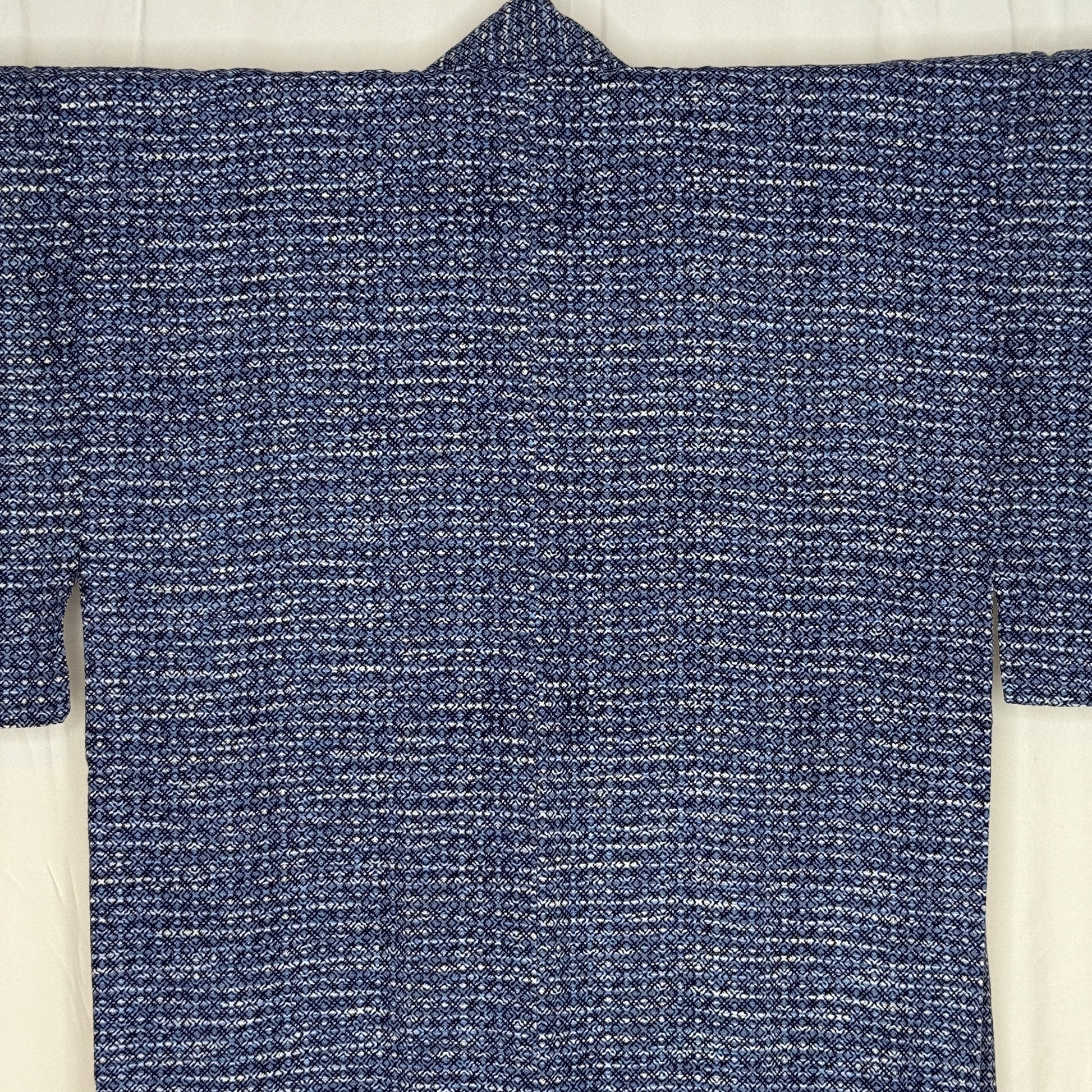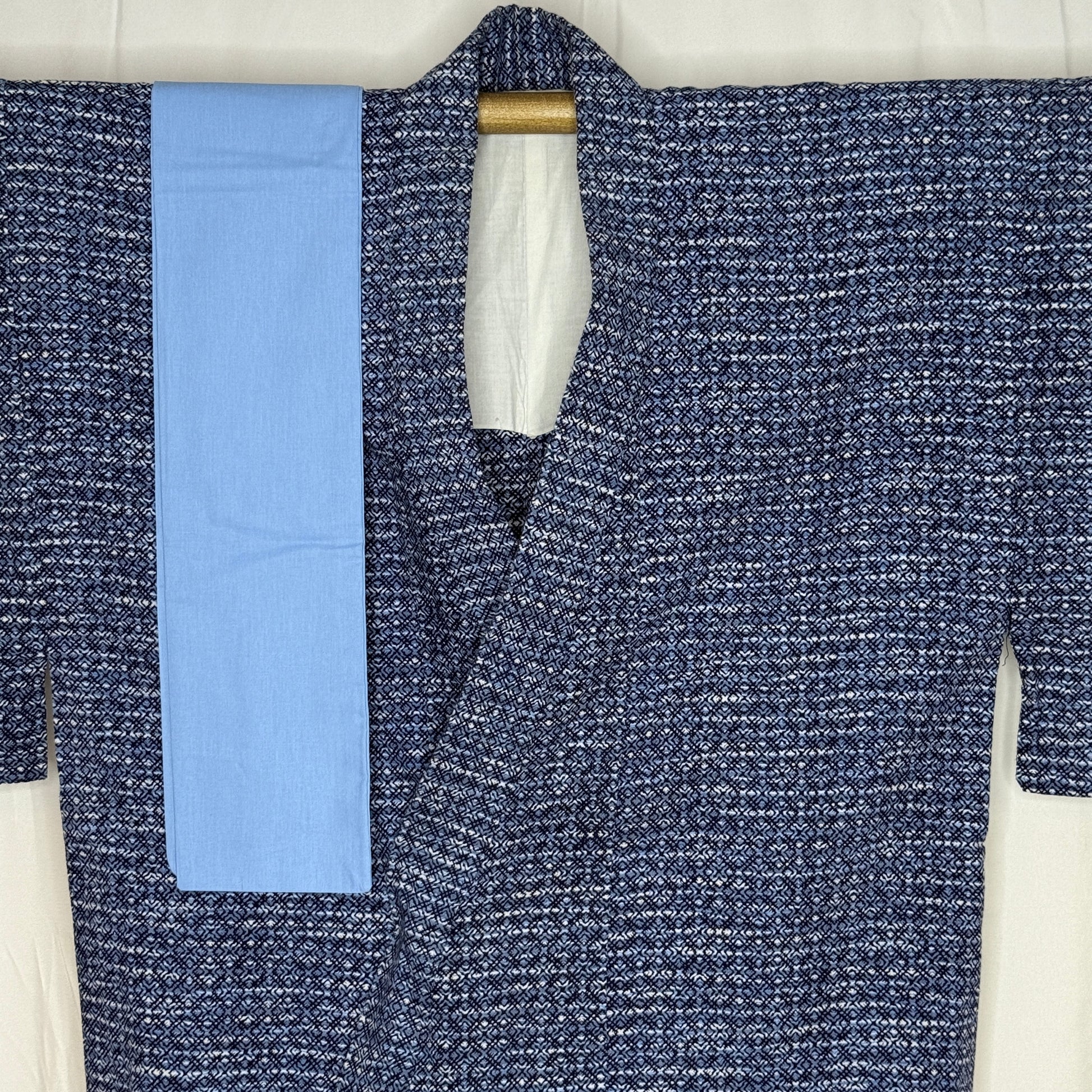 This yukata features several layers of blue with a geometric pattern of overlapping diamonds. This overlapping creates an intricate geometric lattice. Although it is stenciled - or maybe printed - the irregularity of the lines gives it a hand-woven look.
