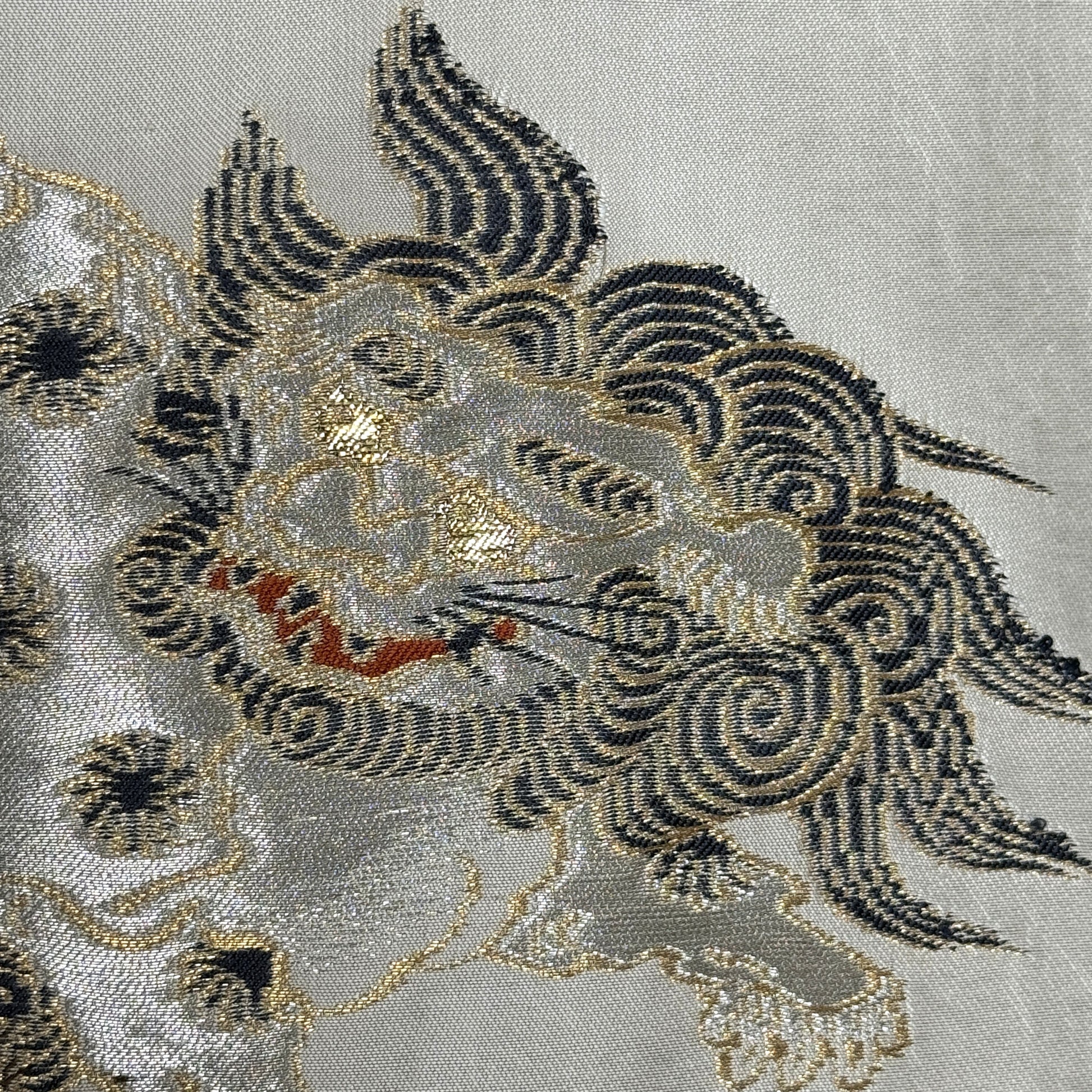 The lining of this man's kimono jacket embodies strength and protection through its magnificent woven shishi, or lion dogs (also fu dogs), their manes and tails like swirling clouds. A beautifully detailed scene in gold, cream, russet brown, navy blue, and gray. These mythical guardians symbolize courage and ward off evil.