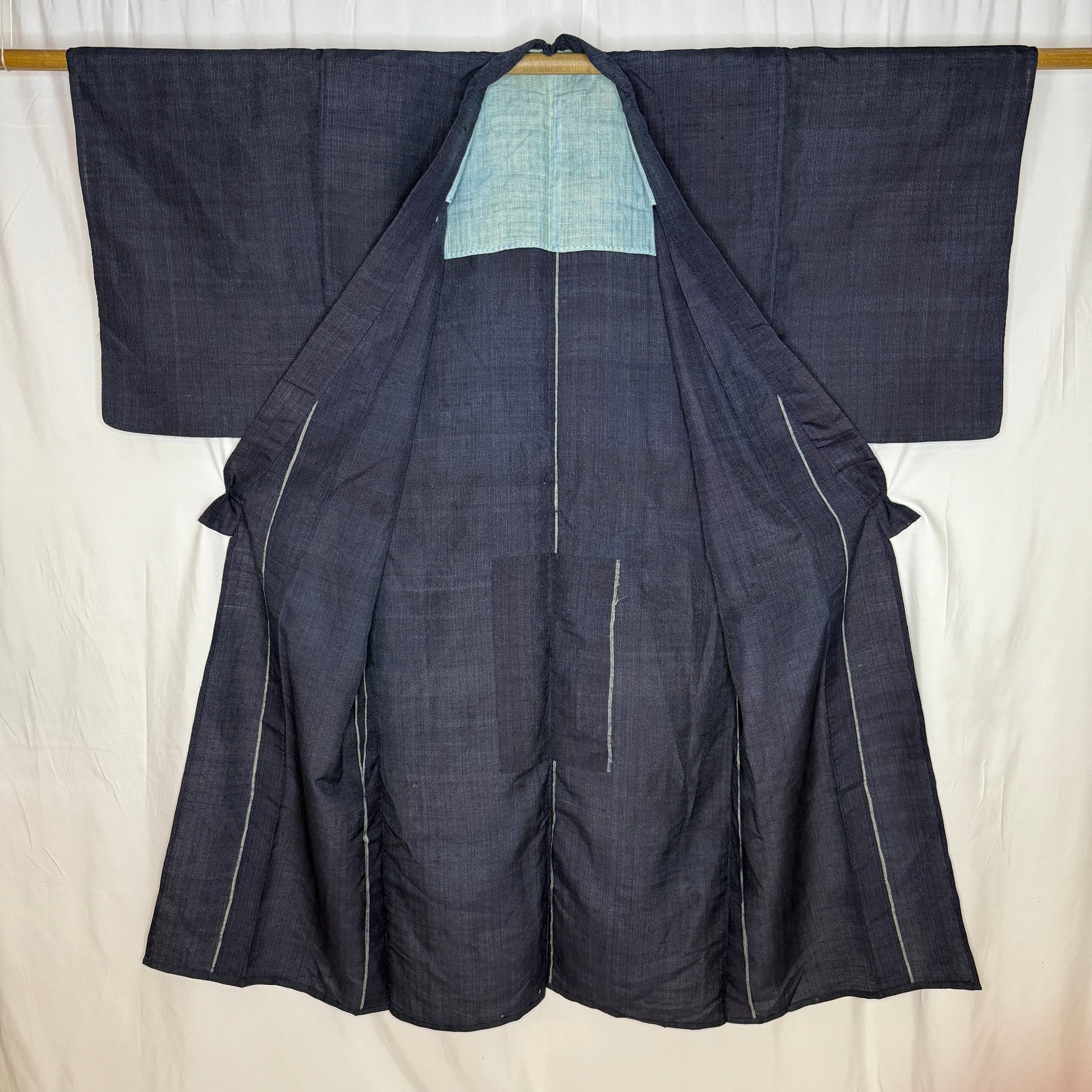 Soft-spoken and full of depth, this vintage men's kimono captures the character of Japanese sophistication. It features a narrow stripe weave that gives texture, while the pale blue partial lining at the shoulders adds a touch of quiet contrast. This kimono is meant for summer as the fabric is lightweight and slightly sheer.