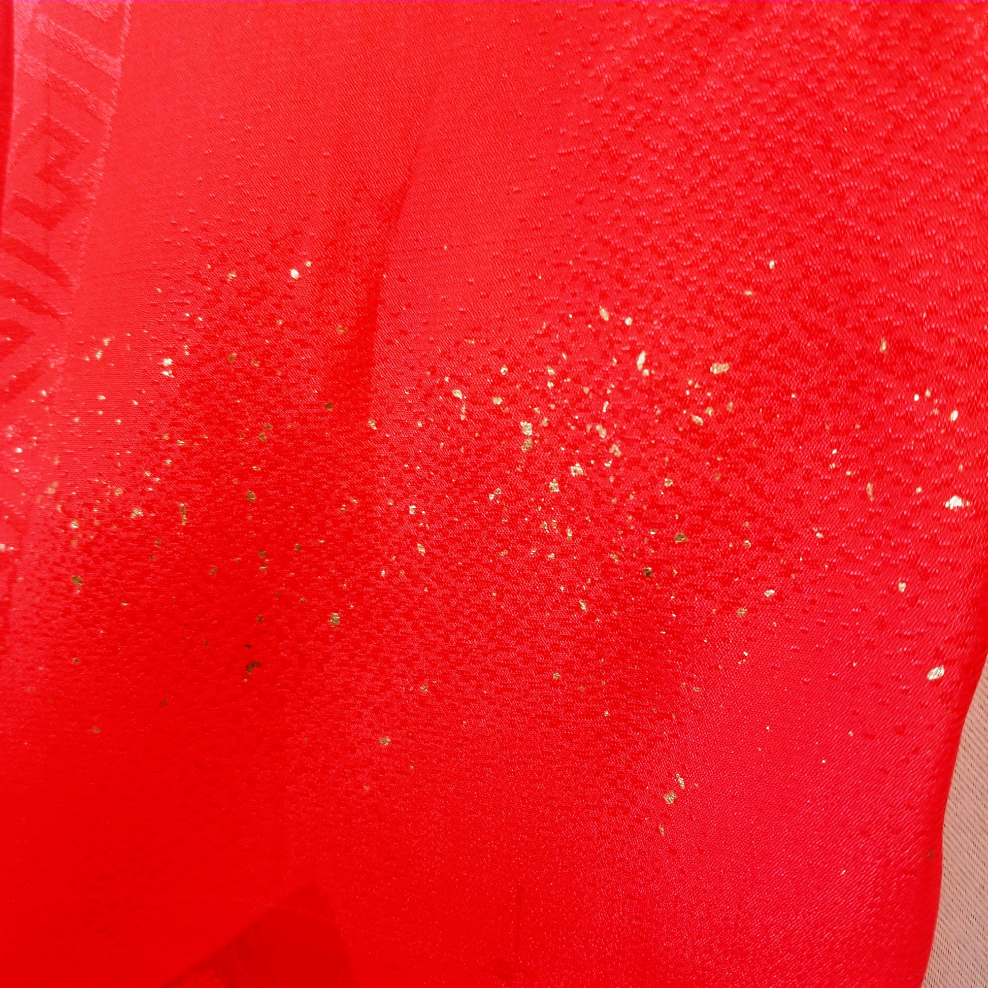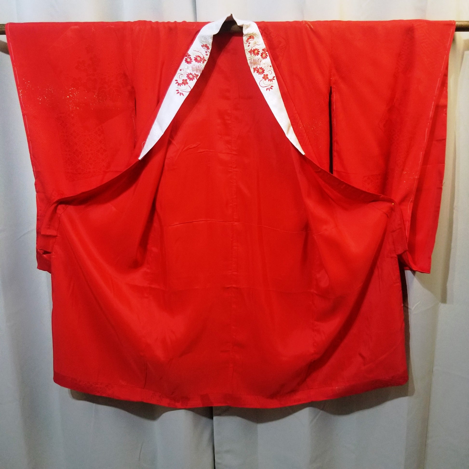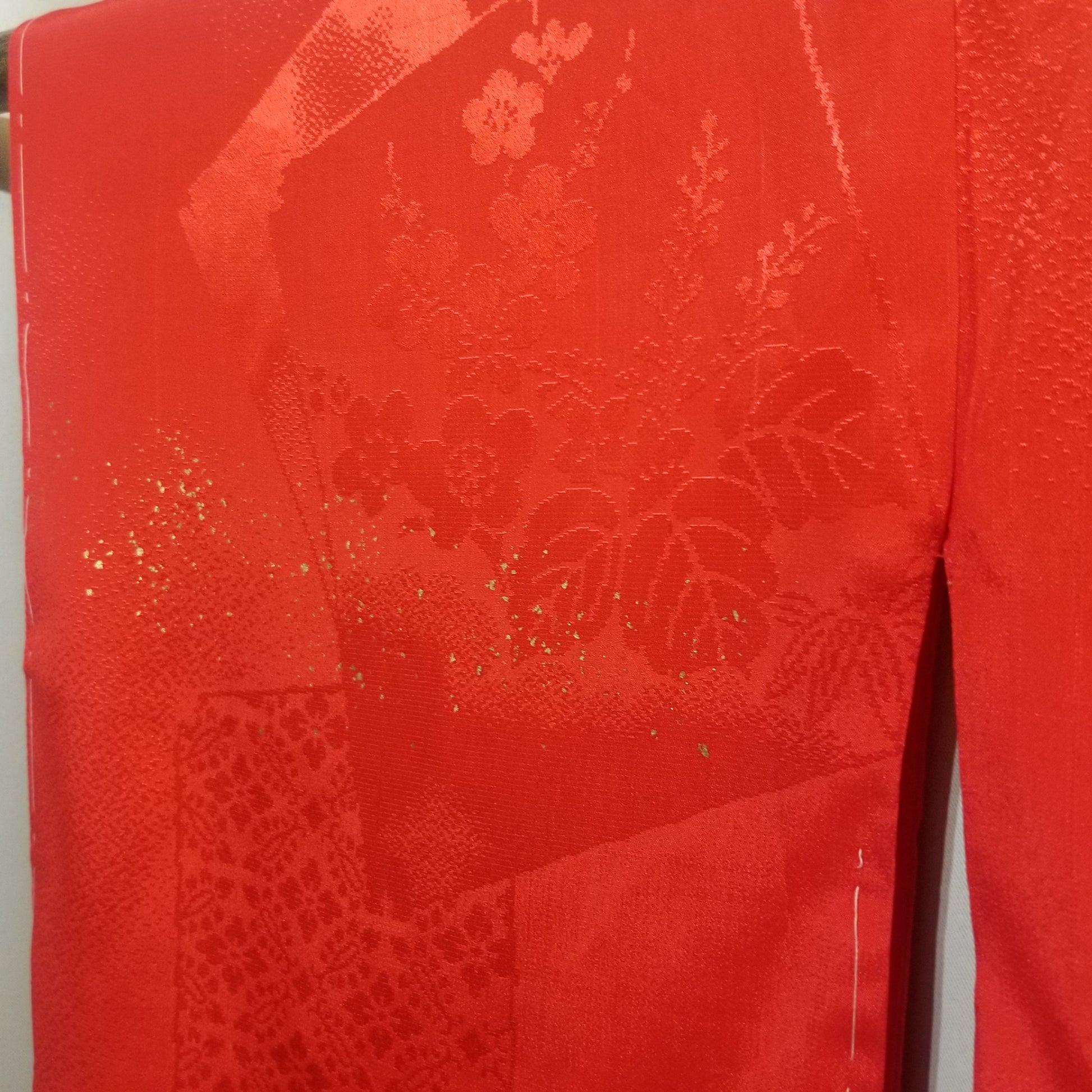 The red silk of the kimono features a jacquard pattern of traditional Japanese imagery.On top of the jacquard, a pattern of cranes in flight can still be discerned though the gold leaf may have rubbed off in places. More gold flecks appear elsewhere, as accents to the pattern underneath.