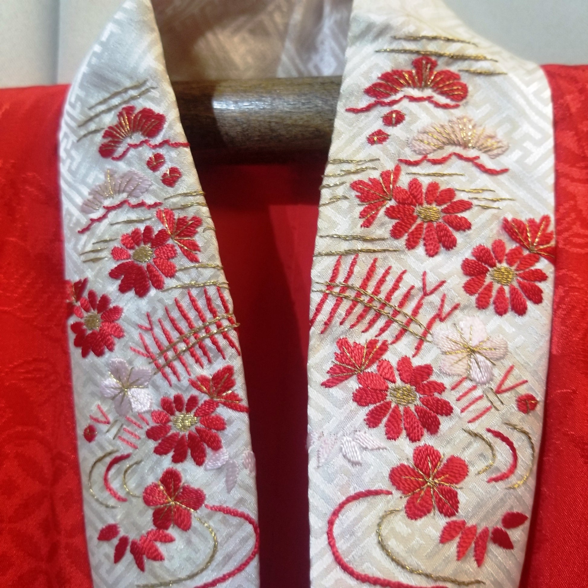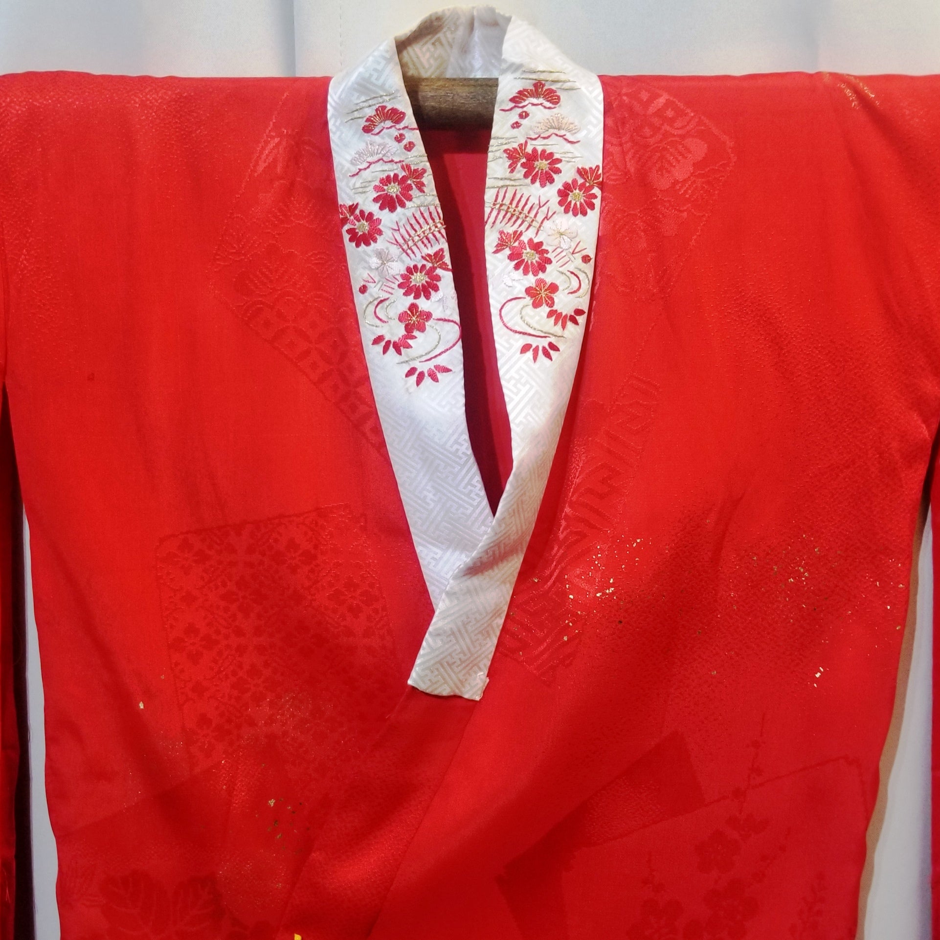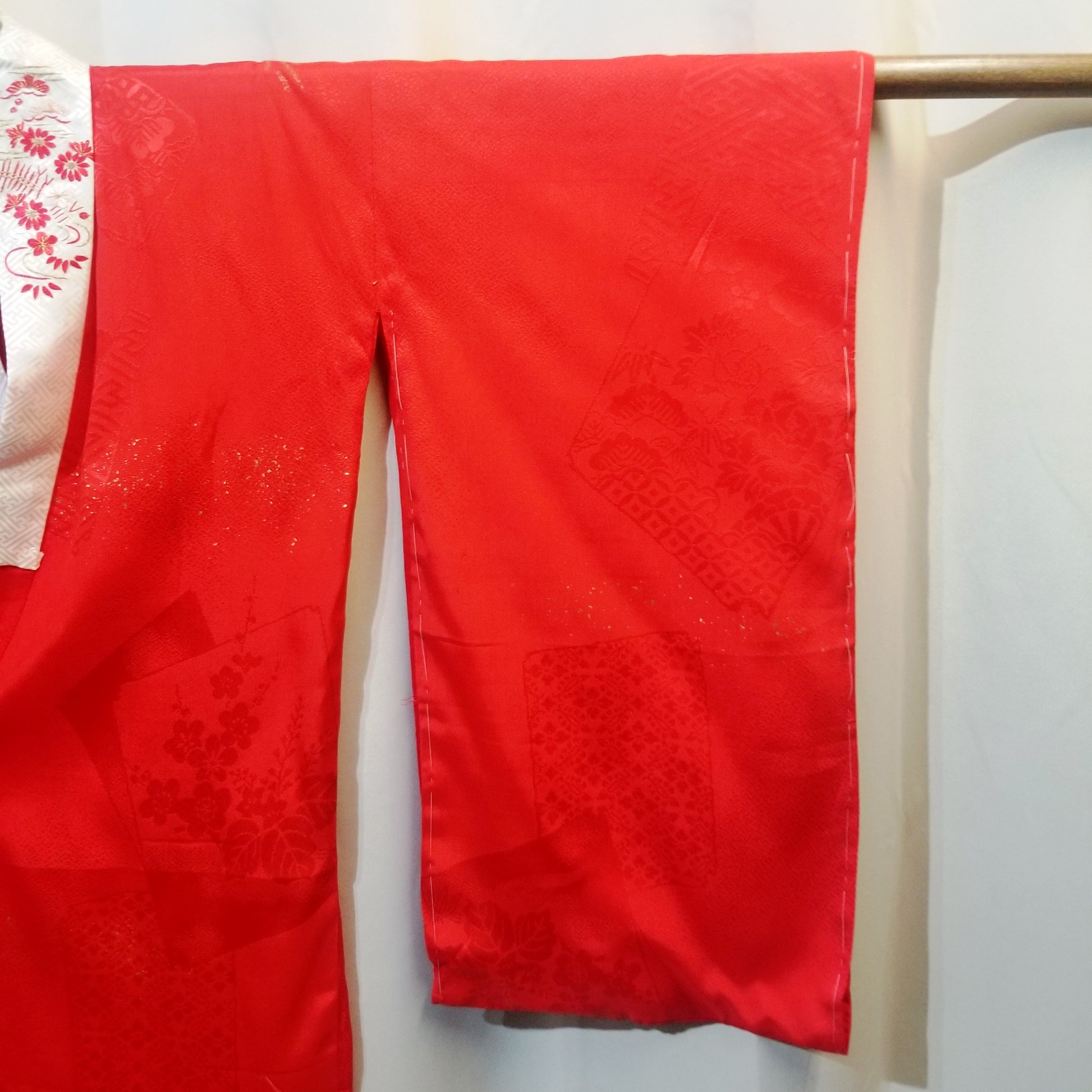The red silk of the kimono features a jacquard pattern of traditional Japanese imagery.On top of the jacquard, a pattern of cranes in flight can still be discerned though the gold leaf may have rubbed off in places. More gold flecks appear elsewhere, as accents to the pattern underneath.