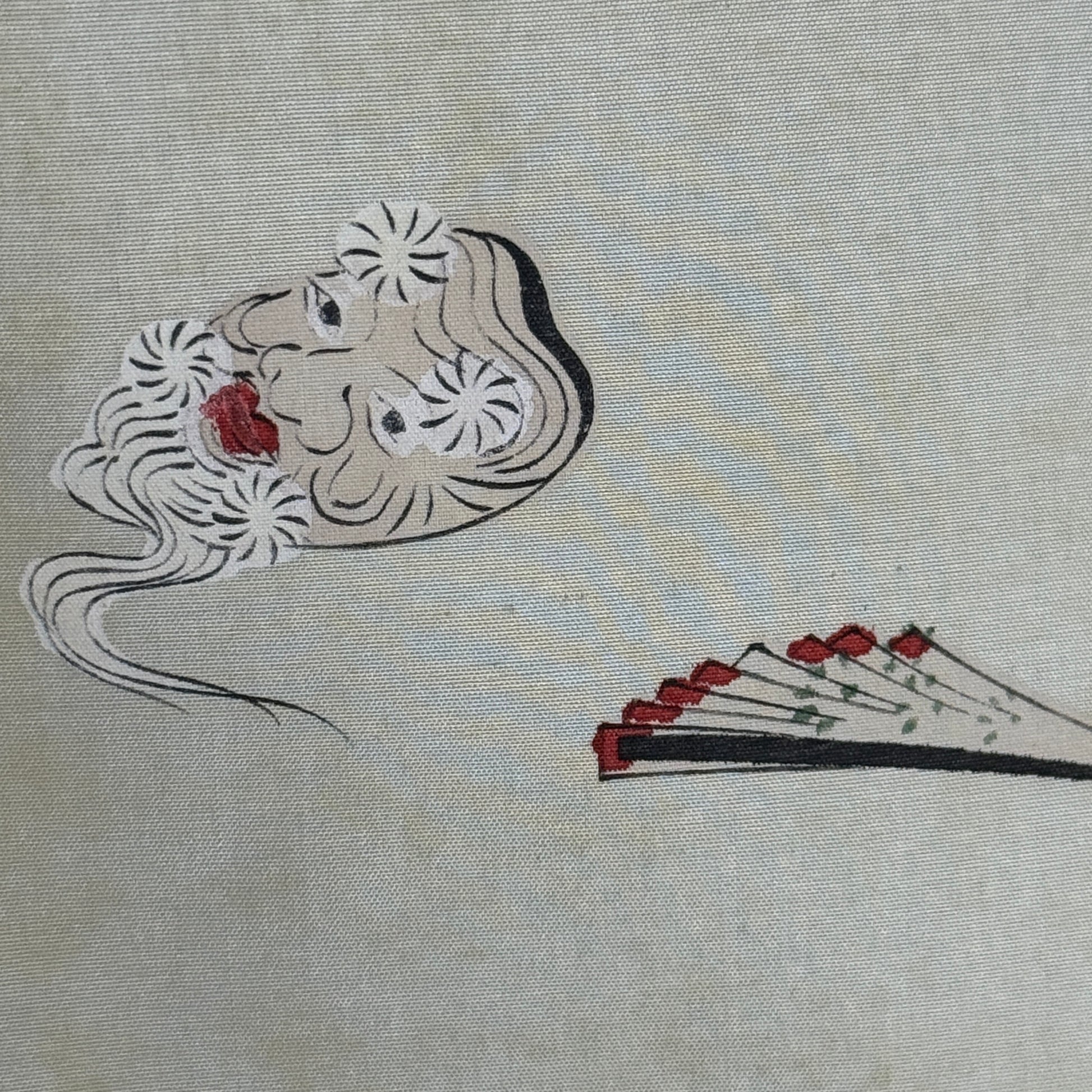 The lining of this man's kimono jacket captures the wit and spirit of traditional Japanese theater illustrated in delicate detail. Noh and Kyogen masks float across the pale background, interspersed with fans, scrolls, and soft clouds of gold brushwork. Each mask tells a story of laughter, mischief, and wisdom making this garment both elegant attire and a conversation piece.