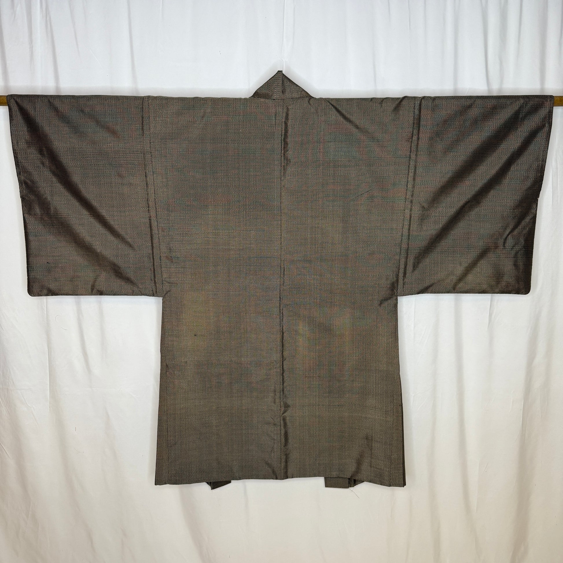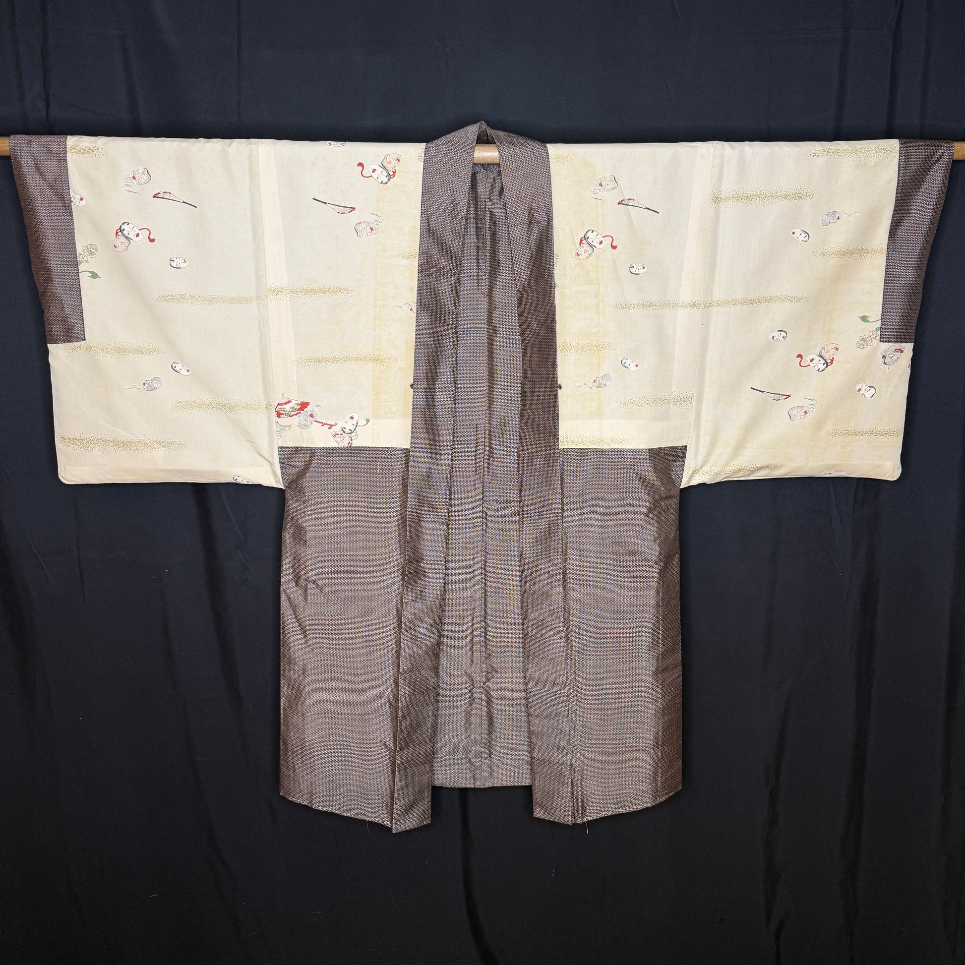 This is a vintage kimono jacket, called a haori, made for a man. The lining of men's haori jackets often depict a scene or motif that was of special interest to the original owner. We often display these jackets inside out to show the lining, and they could be worn this way - inside out - as well; a style that is becoming trendy among Japanese youth. See video below for how haori are worn these days.