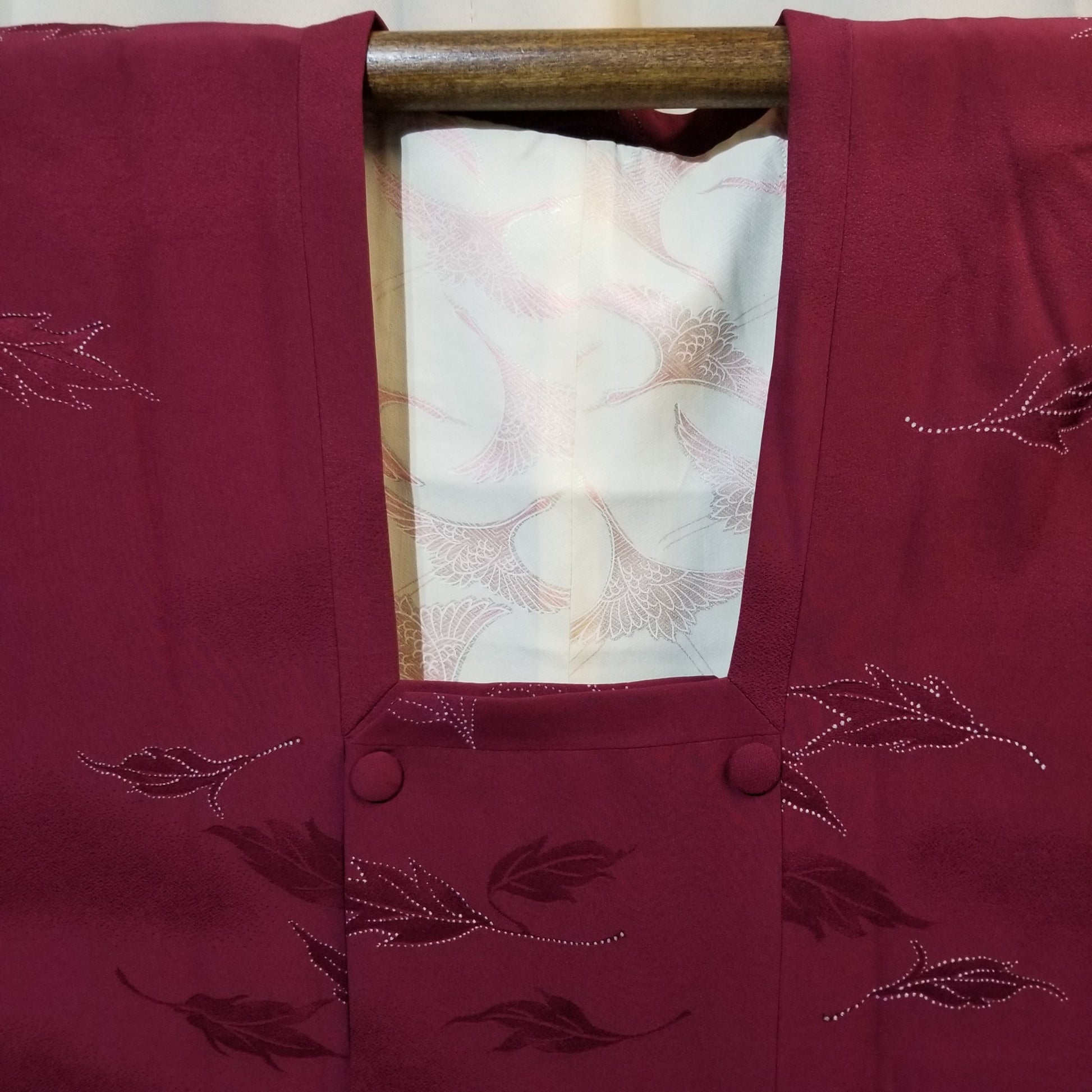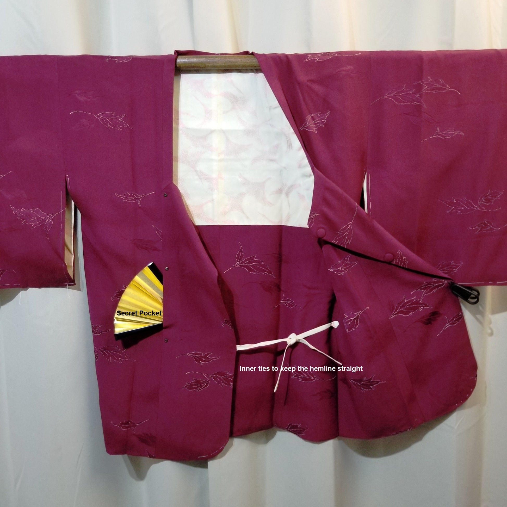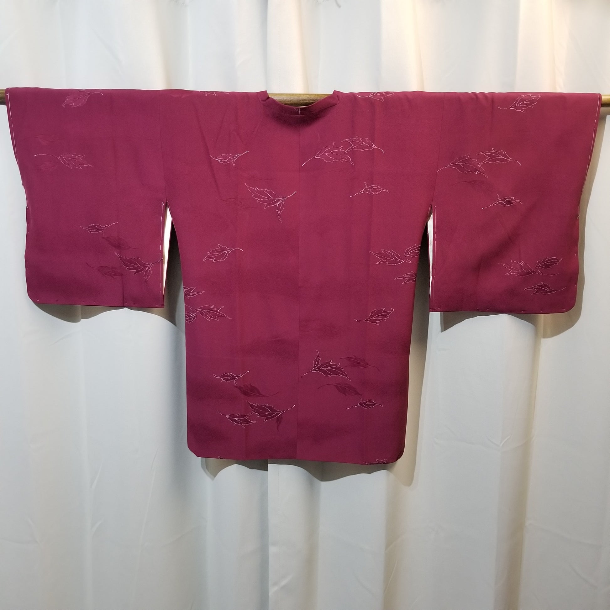 This michiyuki is a sweet, rich berry color - maybe even burgundy - with a floating leaf pattern. The leaves are actually woven into the silk, and most of those are embellished with darker dye or outlined with little white dots. This creates an "echo" effect, where the pattern appears behind the embellished version.