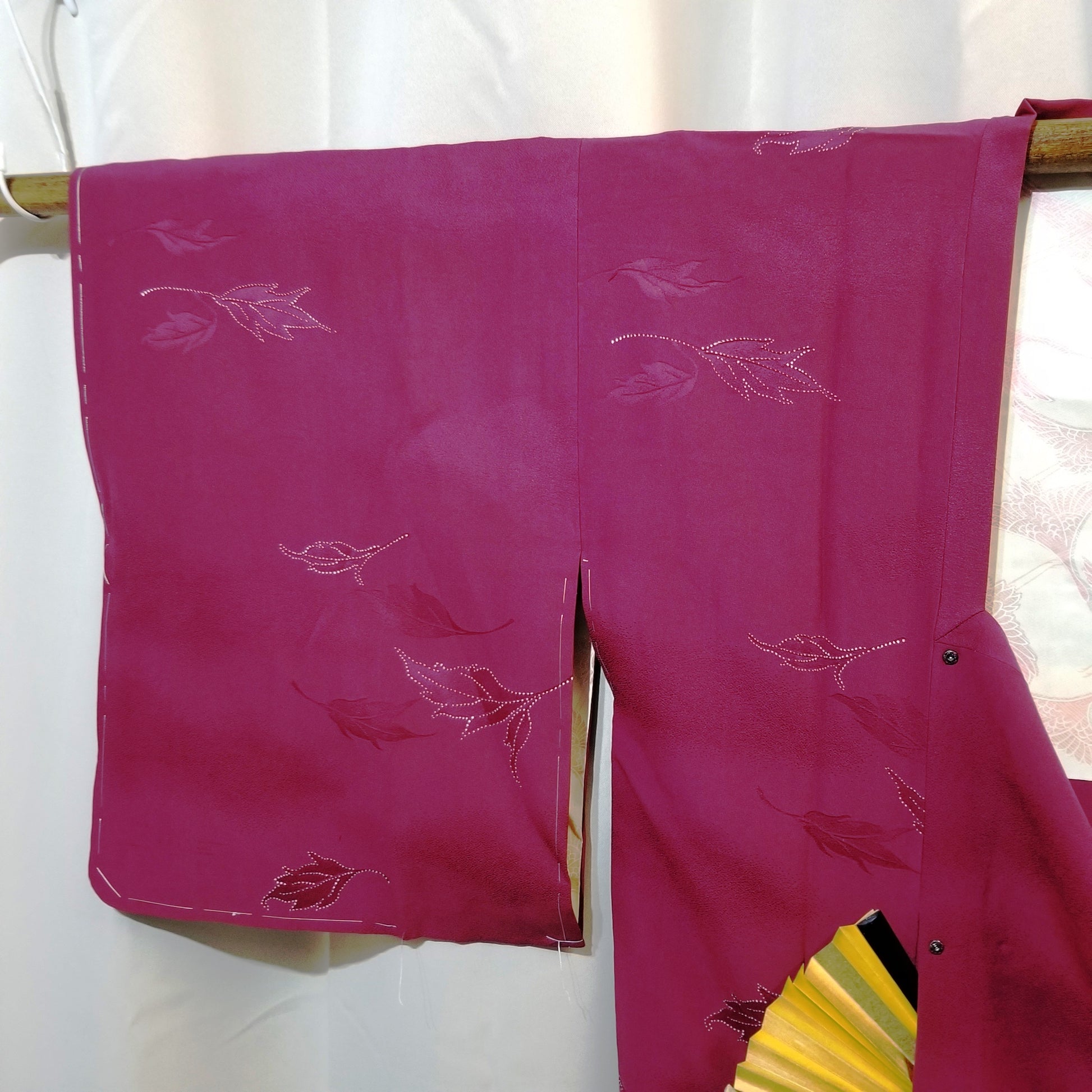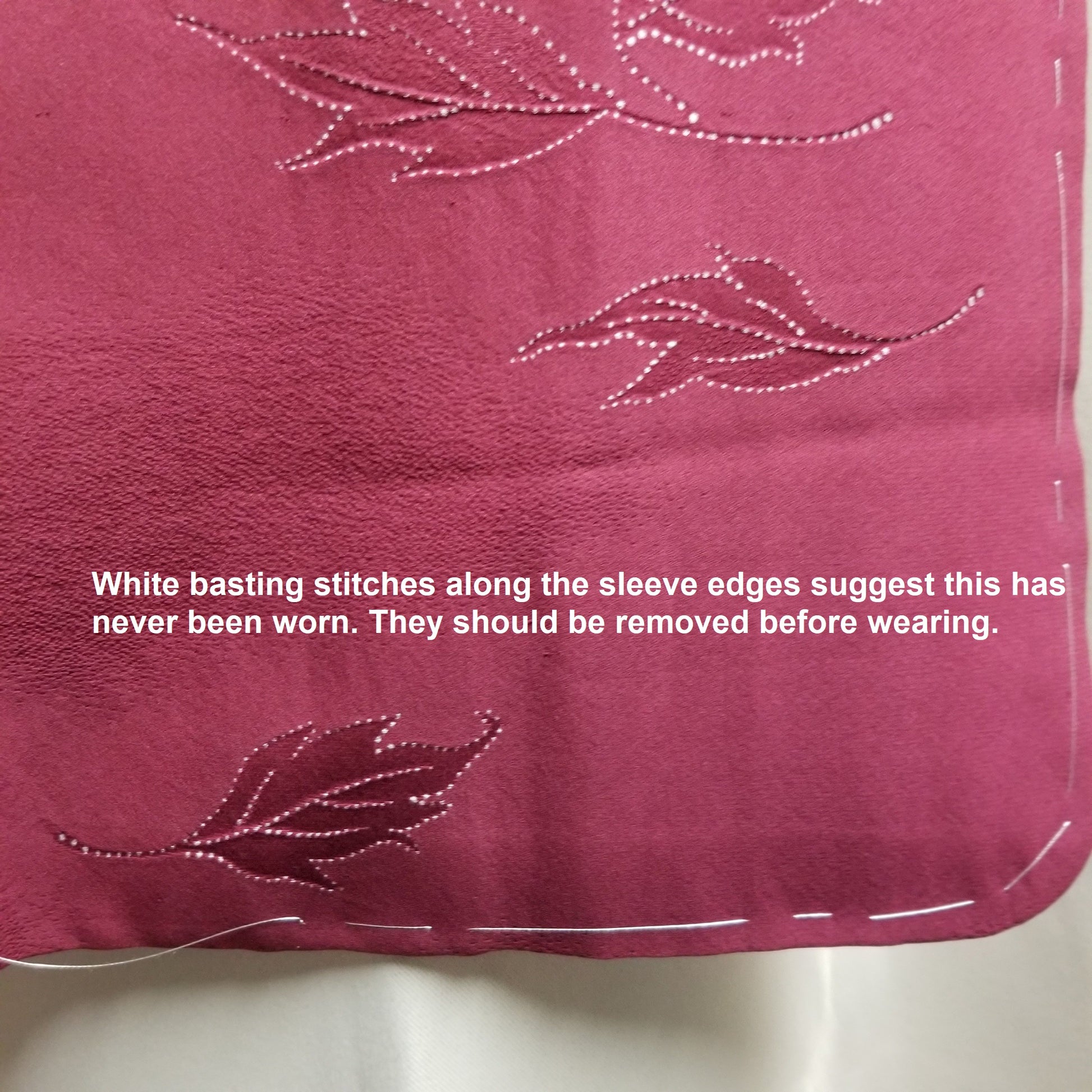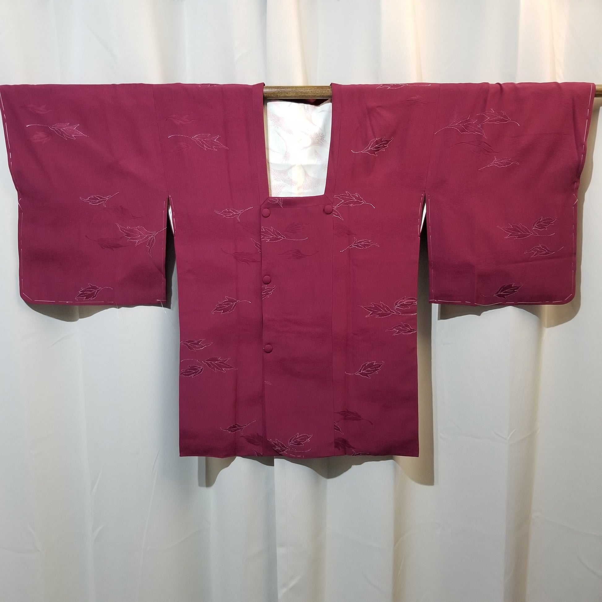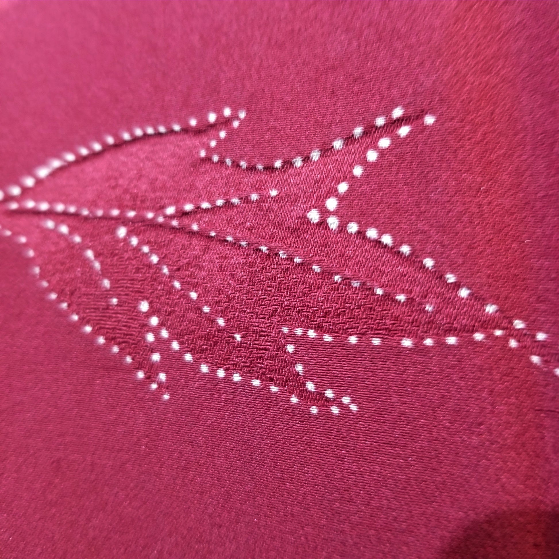 This michiyuki is a sweet, rich berry color - maybe even burgundy - with a floating leaf pattern. The leaves are actually woven into the silk, and most of those are embellished with darker dye or outlined with little white dots. This creates an "echo" effect, where the pattern appears behind the embellished version.