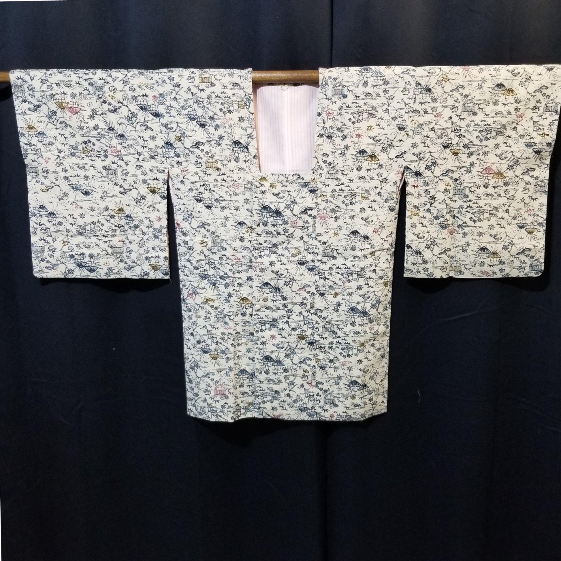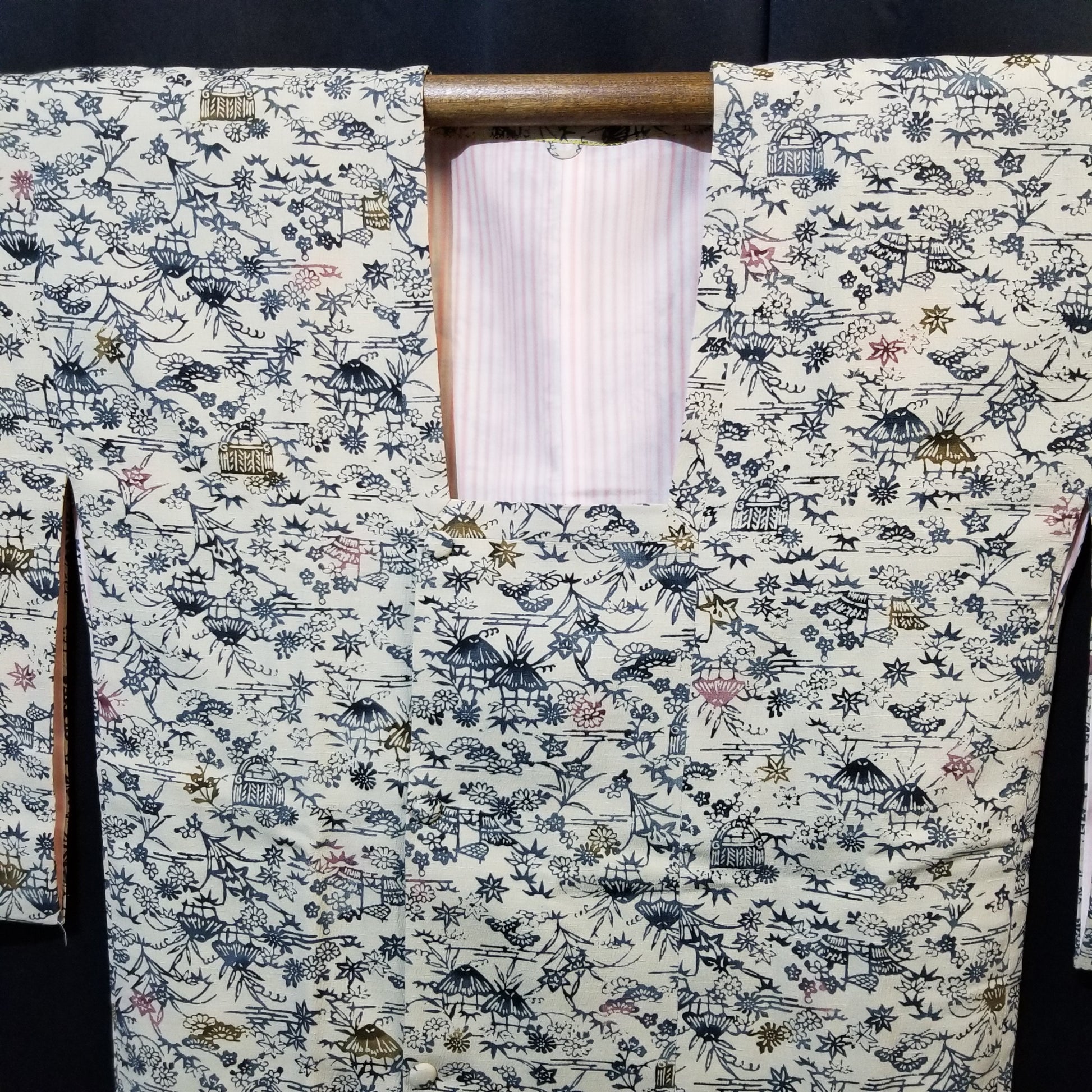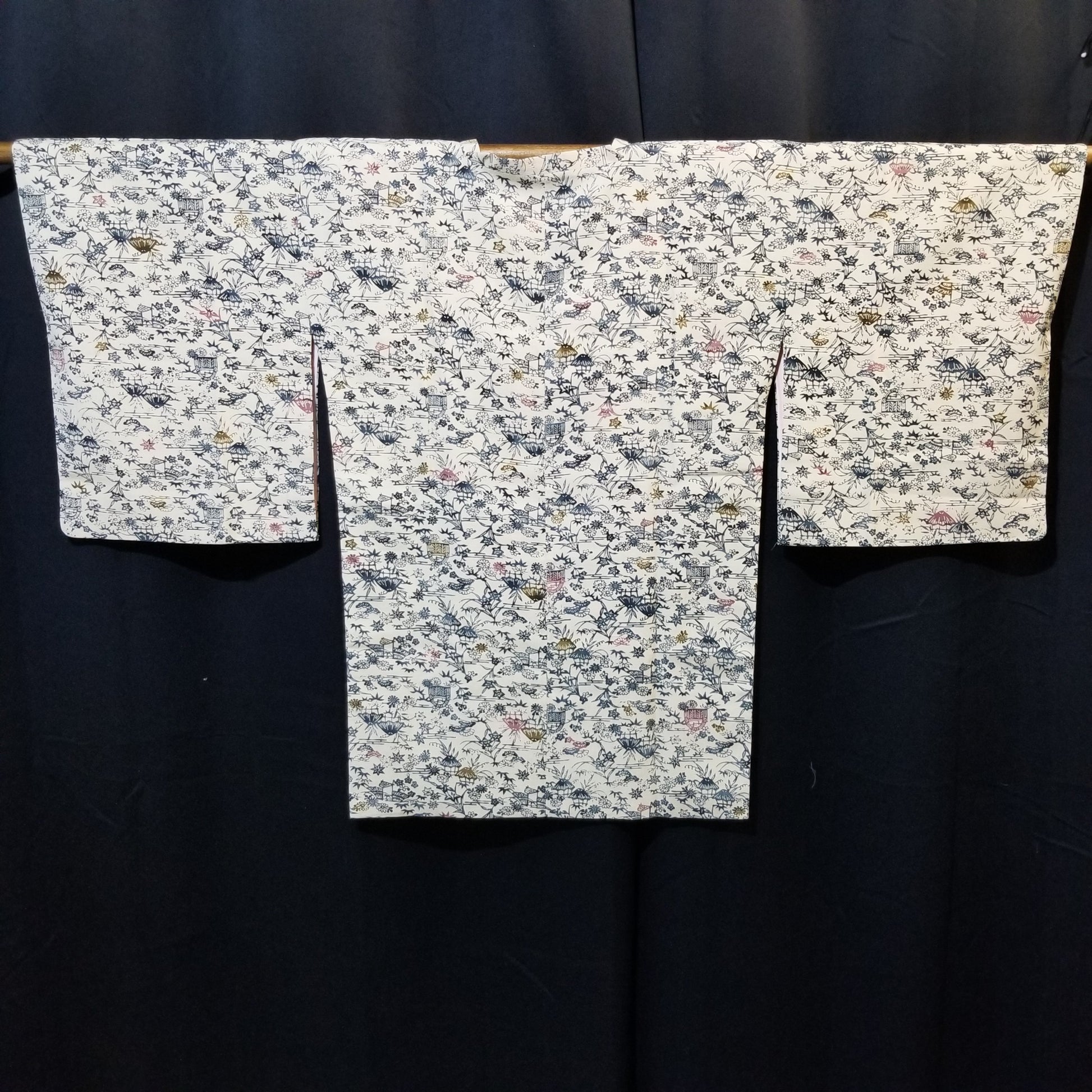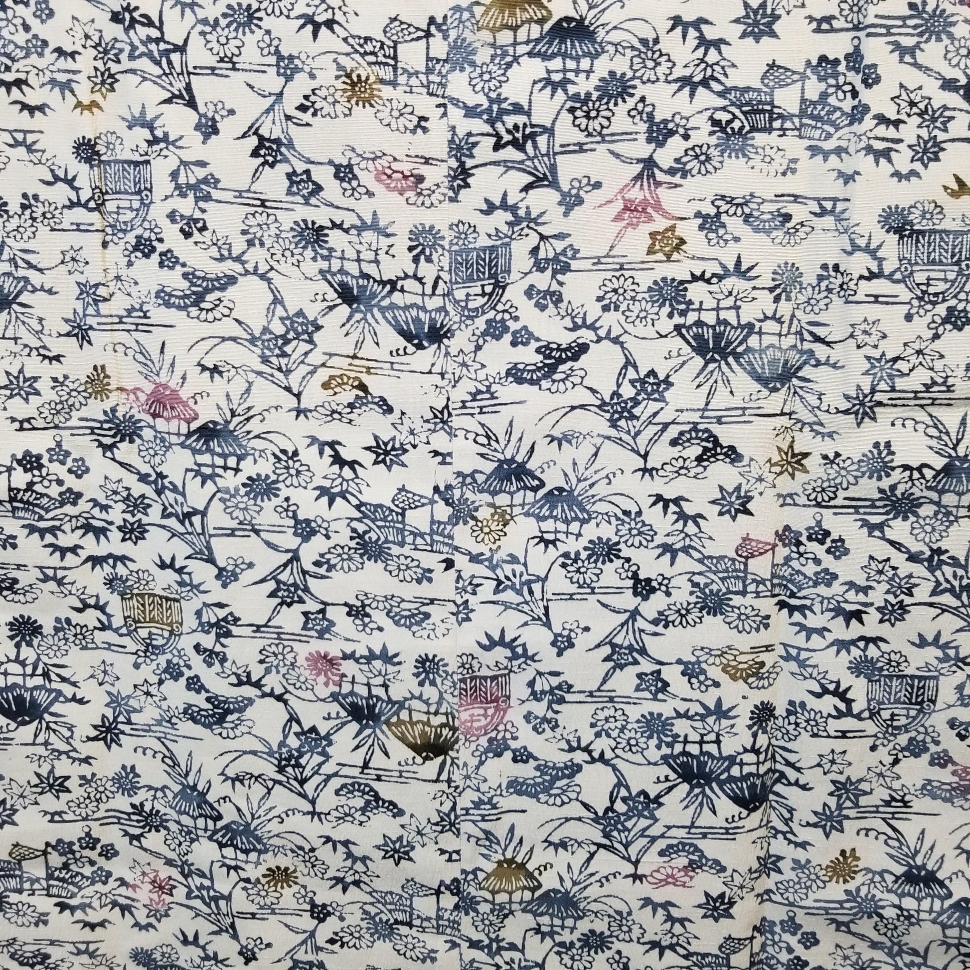 This michiyuki features a set of traditional imagery created with a set of delicately-carved stencils - one for each color. The main color is an indigo blue, though we can't be sure if it was fermented or chemical indigo. The motif is rural countryside, with little huts and garden gates as well as pine, bamboo, and florals.
