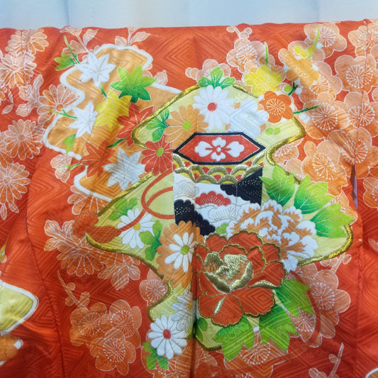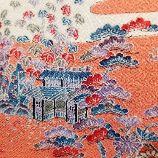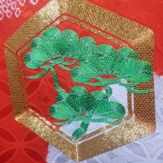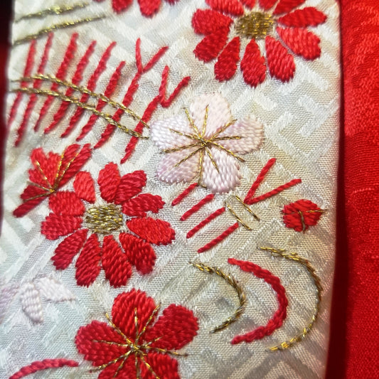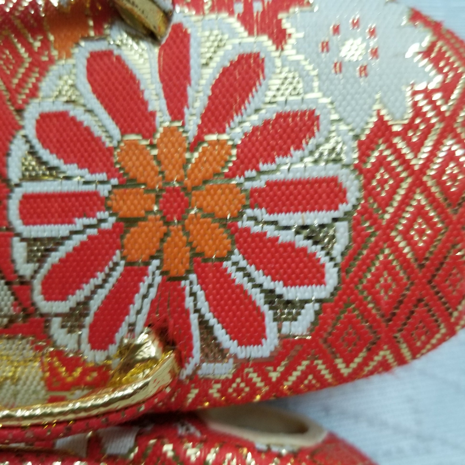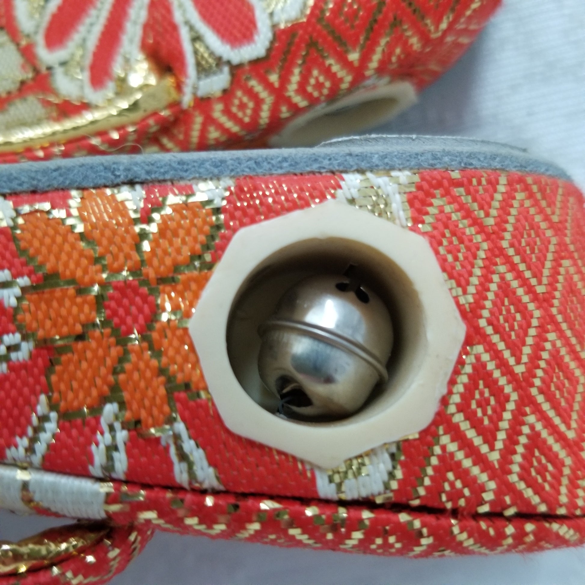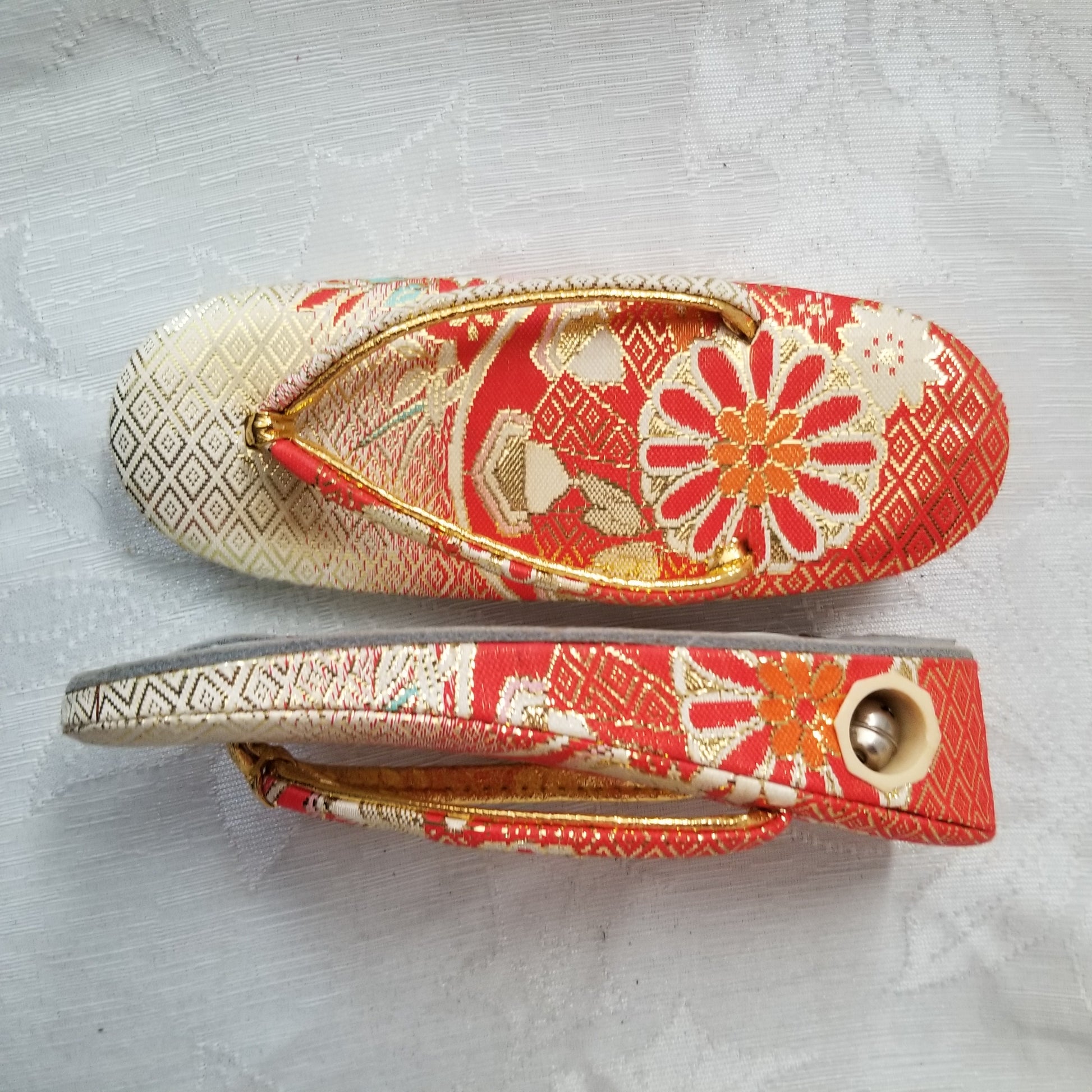 This pair of zori includes the traditional bell-in-the-heel so you can keep track of the little one. The woven fabric is a floral and geometric brocade in vermillion and gold.